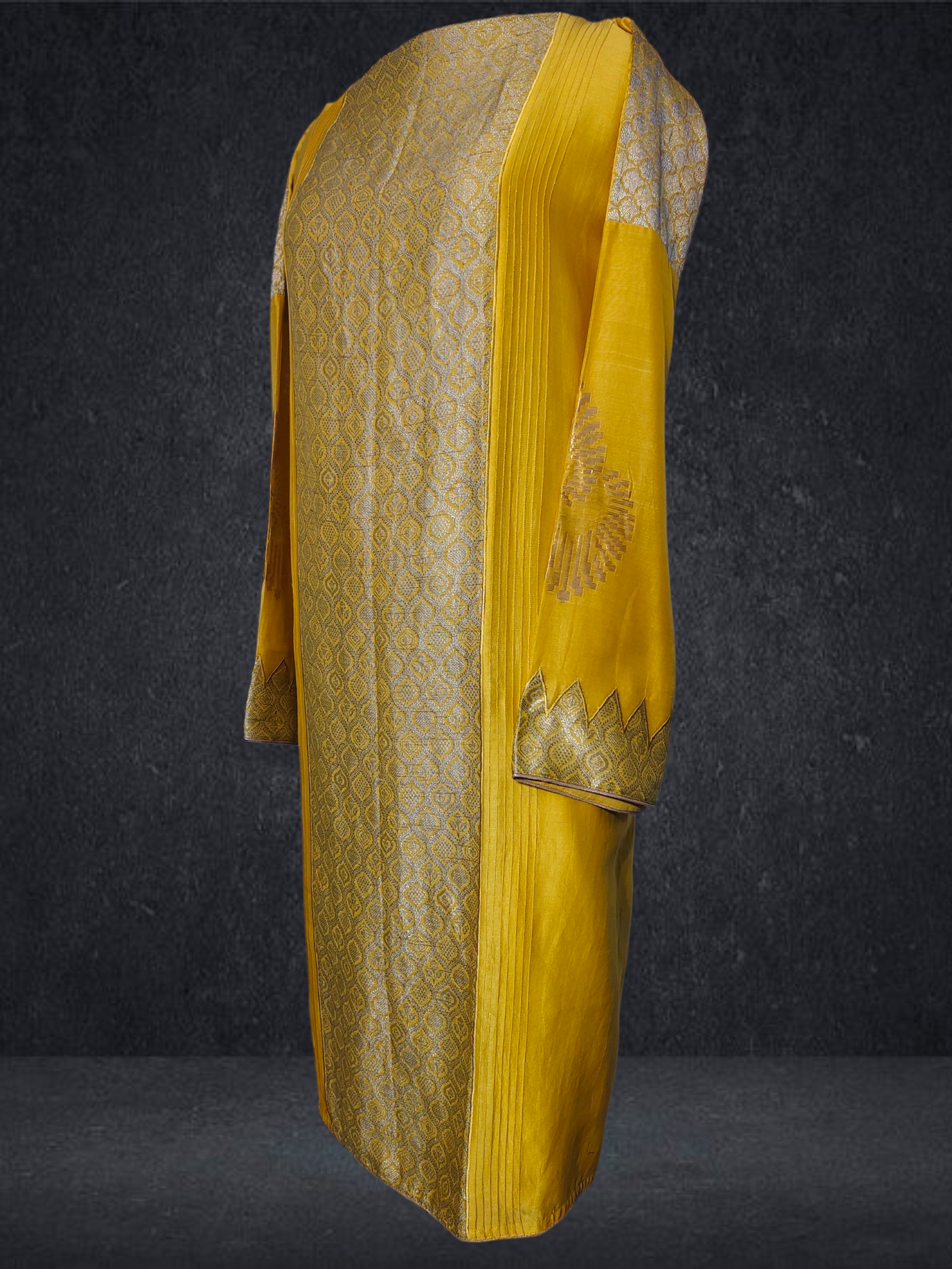 This 3 pc suitset features an elegant zari woven buta kurta and textured chanderi designed in unique abstract floral theme.Kurta is 48 inch maximum in length but can be shortened as per requirement as there is no neckline .The single side ghera is 34 inch so sizes upto 5XL are possible to get tailored in this material.The kurta is prelined with cotton mal.