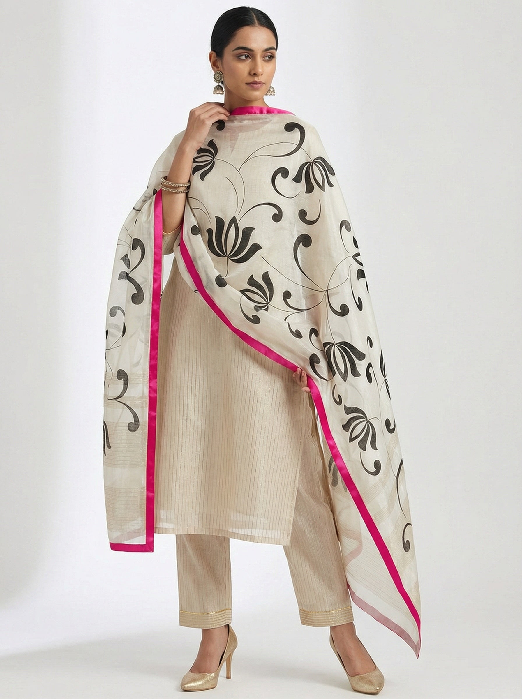 A sheer ivory dupatta with bold black floral vine print throughout, finished with a striking hot pink satin border,