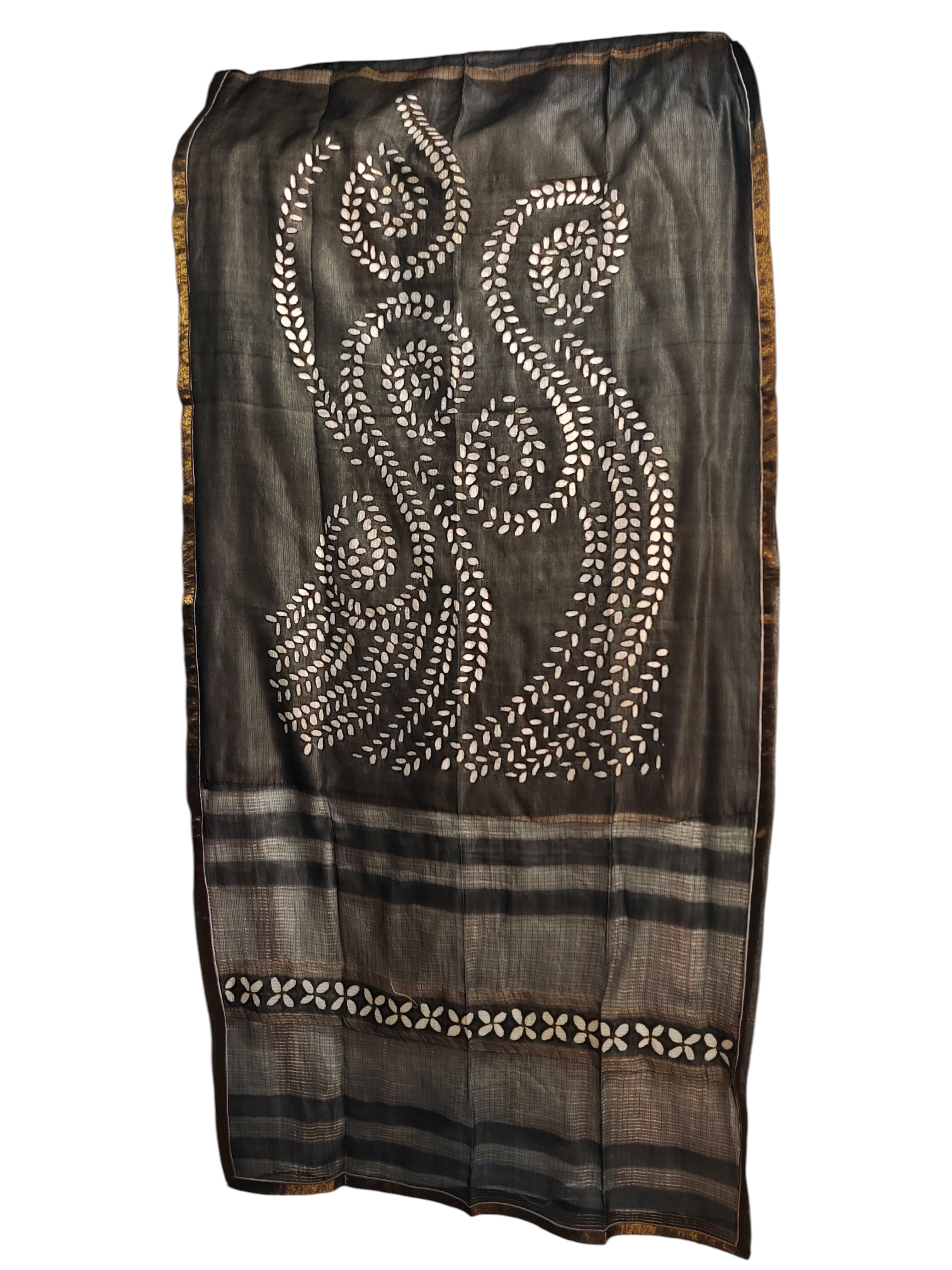 A sheer black organza silk dupatta featuring intricate white hand-embroidered mirrorwork-style paisley motifs, complemented by horizontal metallic thread stripes near the ends. The border is a rich gold with floral embroidered detailing in ivory, giving it a traditional yet elevated elegance.