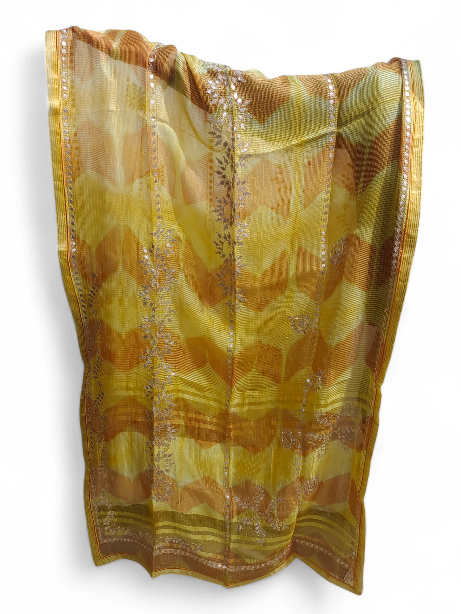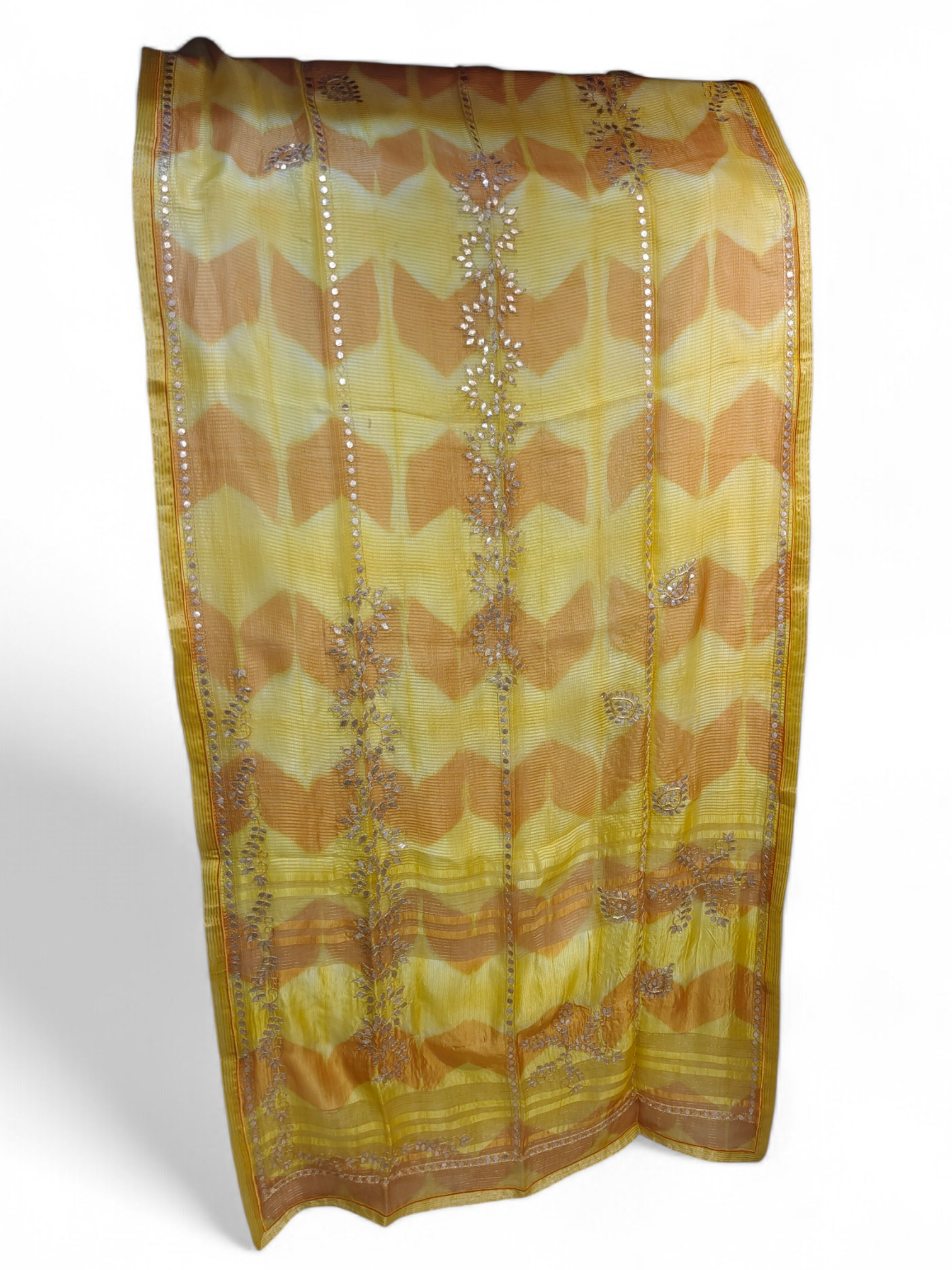 A sheer floor-length dupatta in luminous yellow and warm amber tones, crafted from lightweight silk organza with a soft fluid drape and elongated rectangular silhouette; featuring abstract chevron-inspired patterns in mustard and honey hues, vertical silver-gold zari embroidered vine motifs, delicate sequin and mirror embellishments, and a finely detailed metallic zari border along all edges;