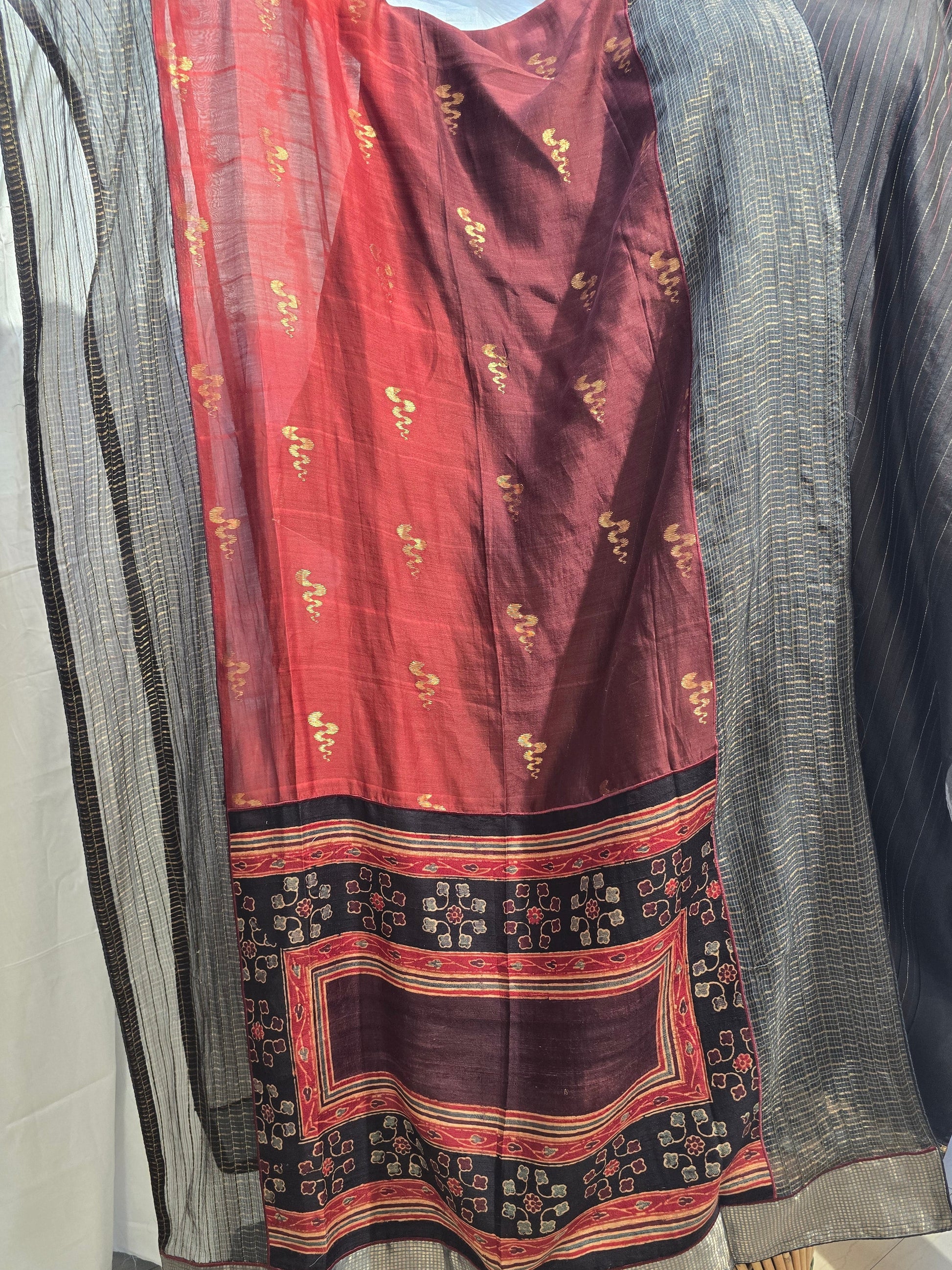 A handwoven maroon and red dupatta featuring gold woven motifs across the body, a richly patterned pallu with floral and geometric motifs in mustard, ivory, and red, framed by traditional striped borders can be worn with a dark maroon raw silk kurta and same colour bottom in silk