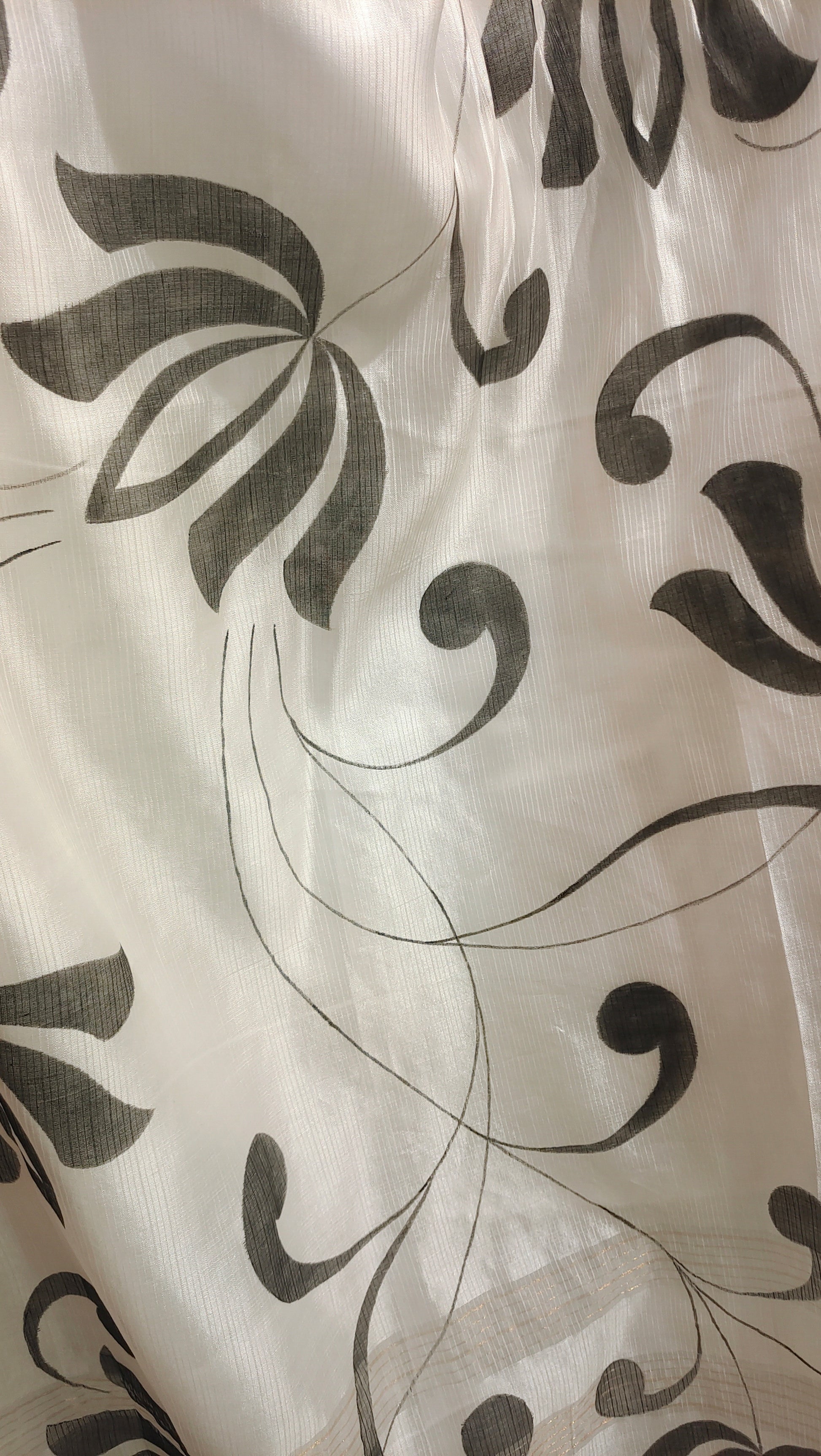 A sheer ivory dupatta featuring bold black floral embroidery and swirling vine patterns, framed with a vivid red border, styled as a statement piece over minimal clothing;