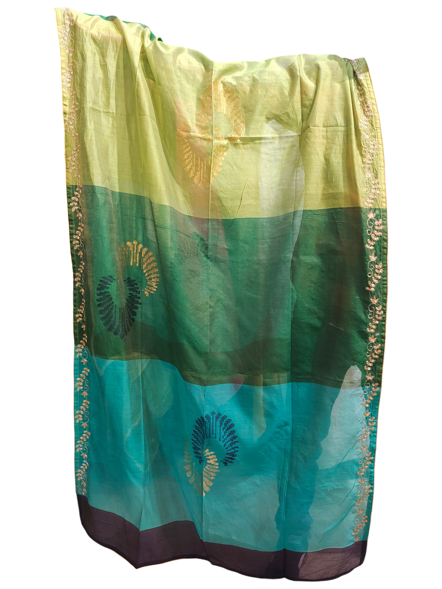 A soft gradient dupatta with horizontal color blocks transitioning from lime green to forest green and turquoise blue, featuring large gold and navy embroidered paisley motifs and delicate floral vine embroidery along the edges, finished with a deep brown border