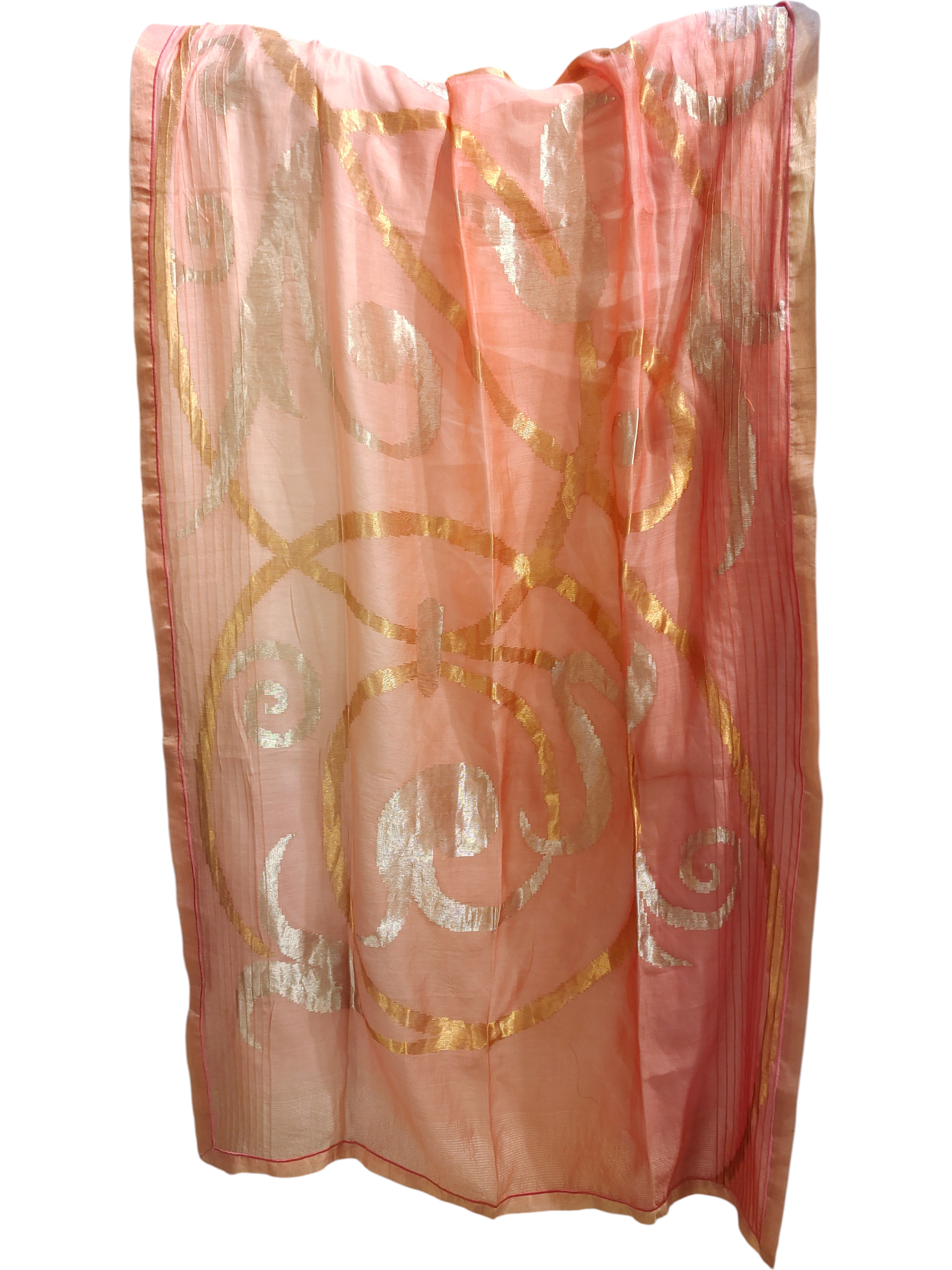 A sheer peach-pink dupatta featuring large-scale swirling metallic gold and silver abstract motifs, styled with soft pleated edges and a narrow red stitched border;