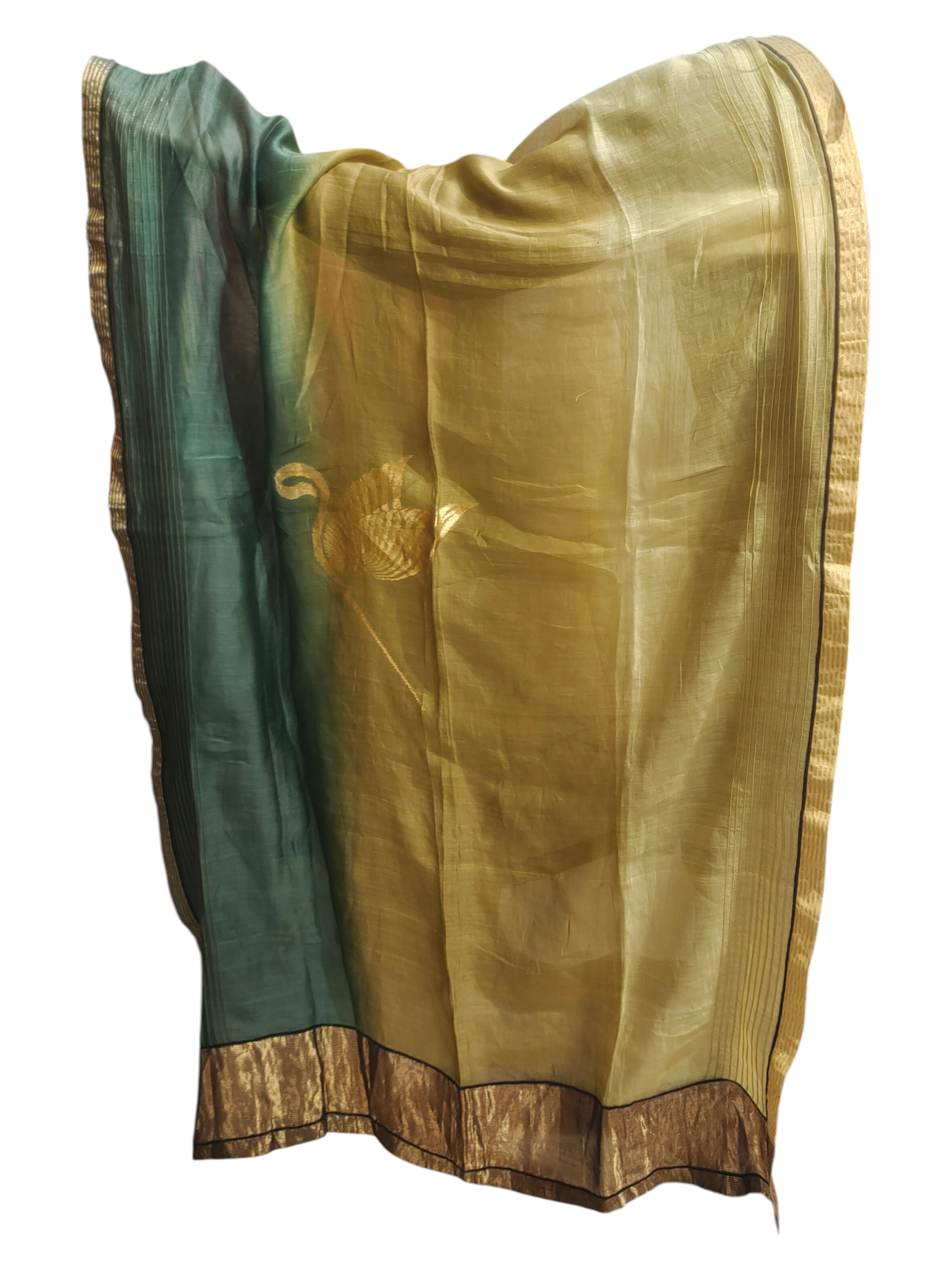 A dual-tone olive green and mustard yellow silk dupatta with a sheer finish, featuring a subtle golden swan motif embroidery, complemented by metallic gold zari borders and a rich golden hem, styled in the aesthetic of a traditional Indian luxury fashion editorial.