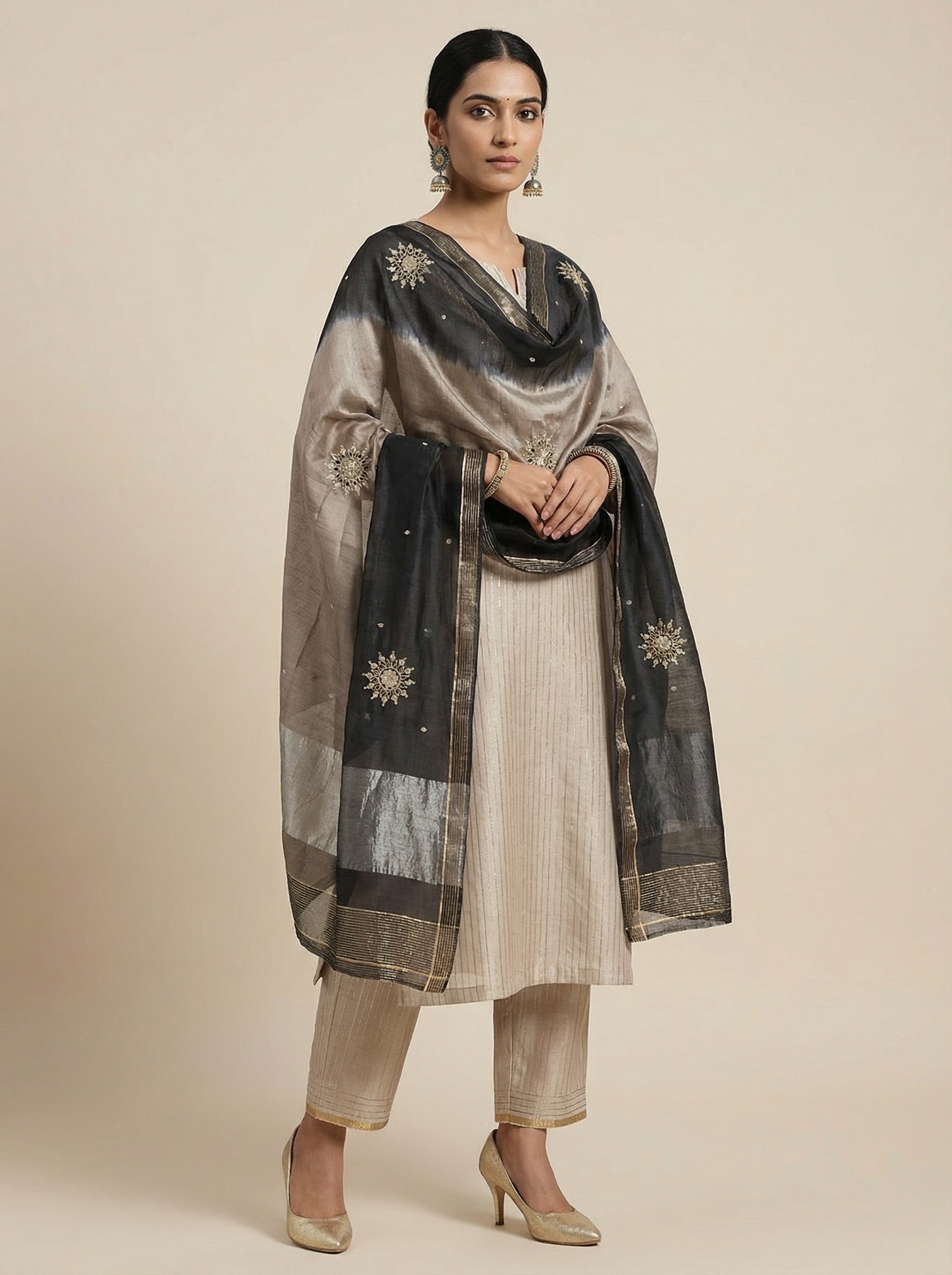 A dual-tone black and taupe organza dupatta with a central silver metallic panel, embellished with gold floral medallion motifs and fine sequin embroidery, finished with a subtle gold striped border, styled in a refined traditional drape,