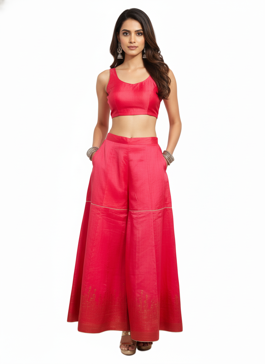 a chanderi high-waisted flared palazzo pants in vibrant fuchsia silk with a subtle sheen, featuring golden metallic embroidery in a vertical abstract pattern at the hem, clean minimal fashion product photo, styled in a modern Indian festive look, in the style of Raw Mango fashion editorial