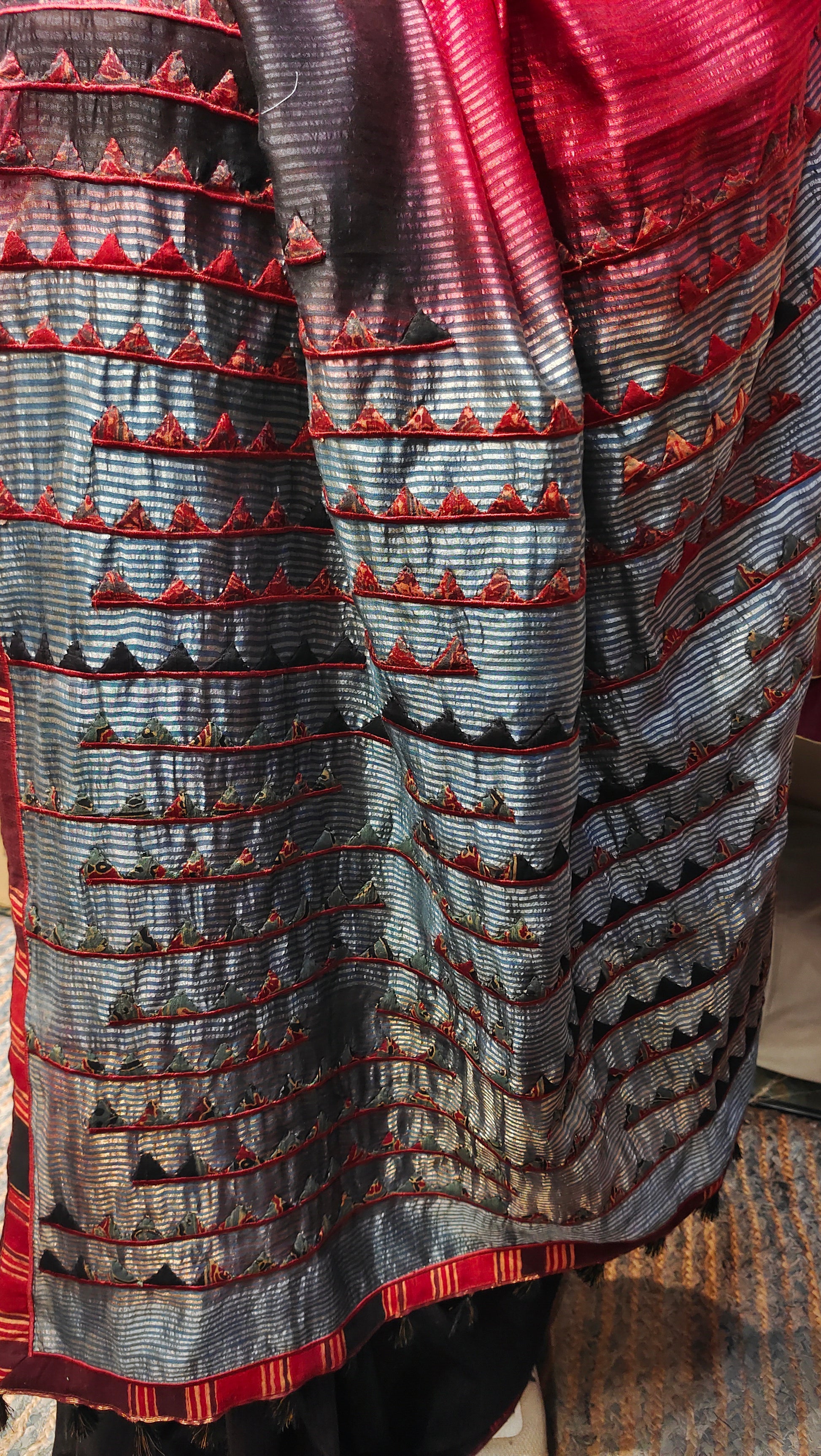 A traditional full-length sari with a fluid drape, rich black and deep red color palette, sheer black lower panel, vibrant red pallu with textured weave, blue-gray and red patterned border with geometric motifs and tassel details, paired with a dark charcoal blouse featuring long sleeves and metallic gold floral embroidery, elegant artisanal handcrafted look