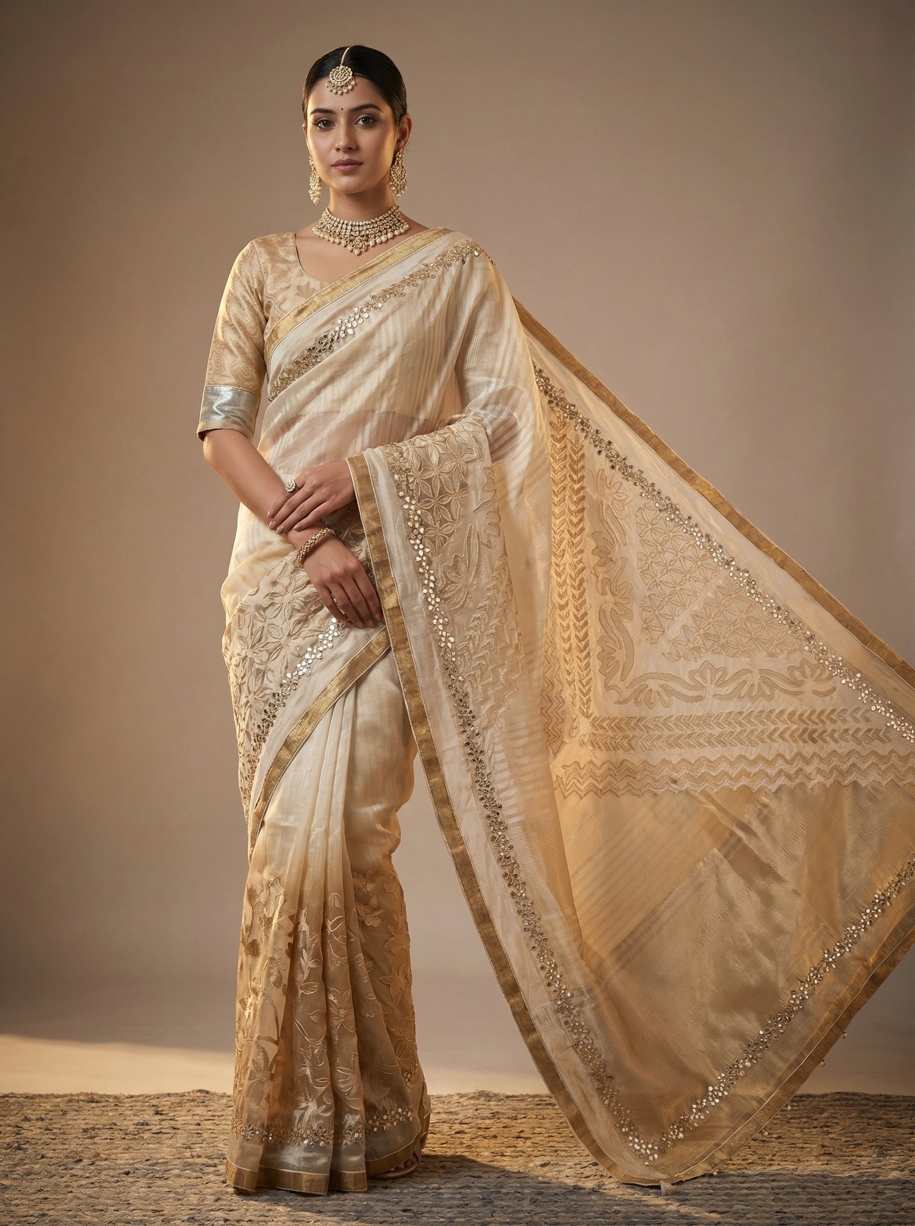 An ode to quiet luxury, this ivory Chanderi silk saree unfolds in soft gold undertones that shimmer gently with movement. The drape features delicate woven stripe textures and intricately embroidered borders combining zig-zag patterns, lattice jaal detailing, and graceful floral vine motifs that frame the pallu with understated artistry. Its luminous gold edging enhances the fluid fall of the fabric, creating a refined ceremonial presence. Paired with a Dhakai silk semistitched blouse in a muted champagne tone, featuring subtle woven floral motifs and structured sleeves, the ensemble celebrates heritage weaving with contemporary elegance suited for weddings, receptions, and timeless festive occasions.