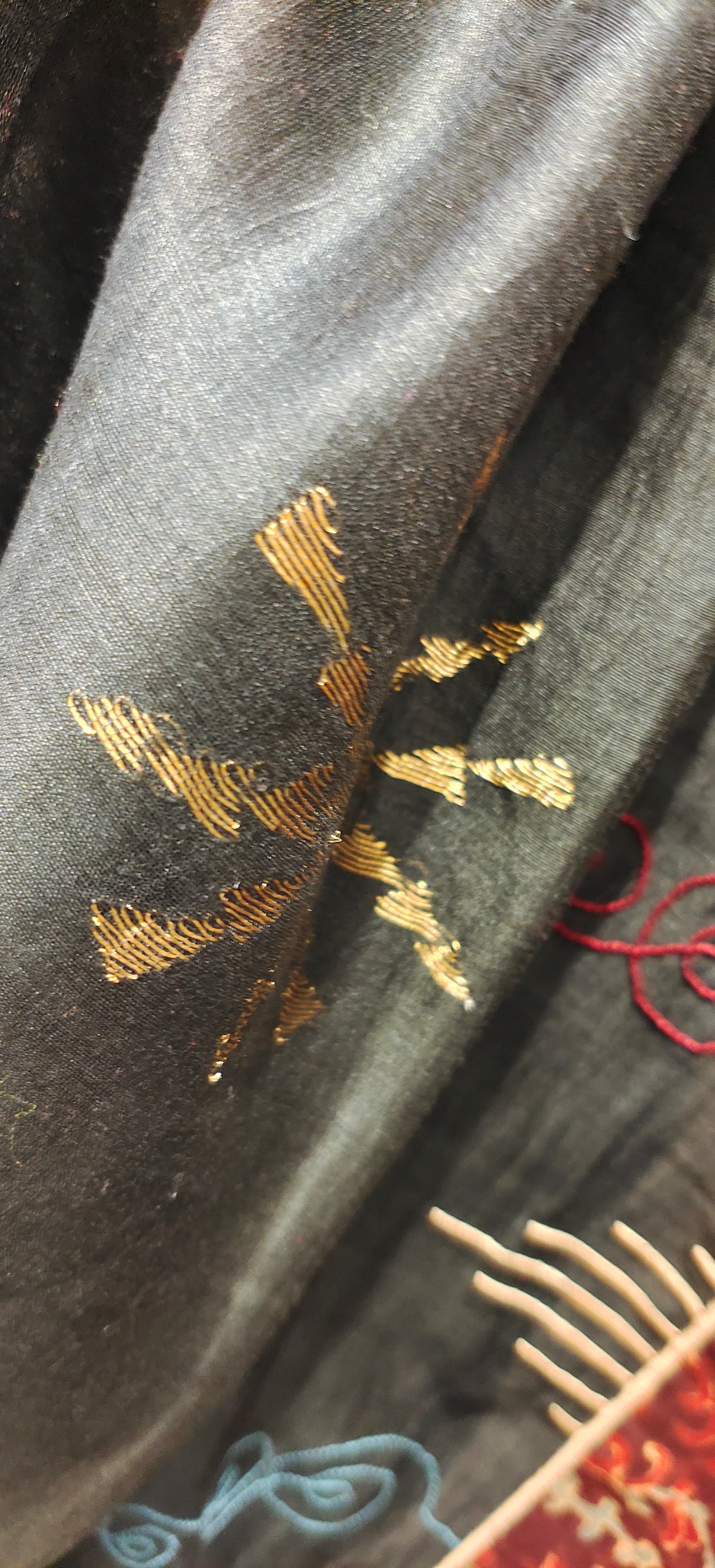 A rich maroon cropped blouse with wide elbow-length sleeves, featuring golden threadwork on the sleeves and back neckline, and an intricate tonal red and maroon pattern on the bodice, paired with a black chanderi silk saree adorned with golden embroidered starburst motifs, deep red printed floral borders, and a maroon pallu with tassels and geometric detailing,