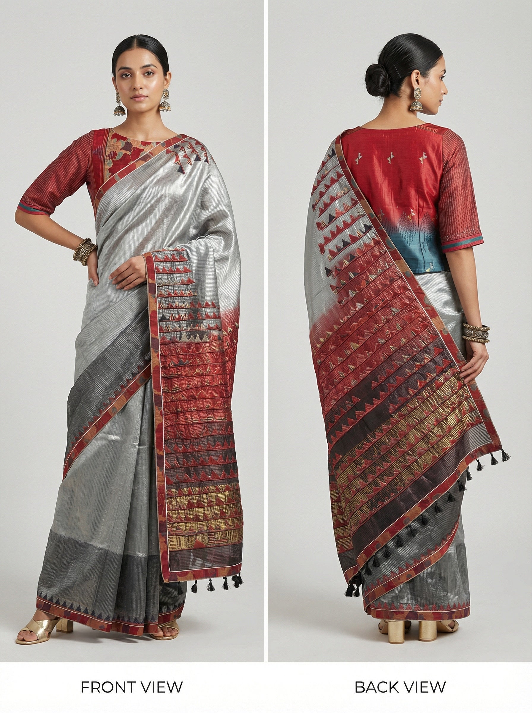 A traditional handwoven silk saree in metallic silver with a deep red and gold pallu featuring intricate geometric and triangle motifs, paired with a cropped red blouse with half sleeves, featuring multicolor floral AJRAKH print on the front and gradient blue dip-dye effect at the back, styled in the manner of a contemporary Indian artisanal fashion editorial