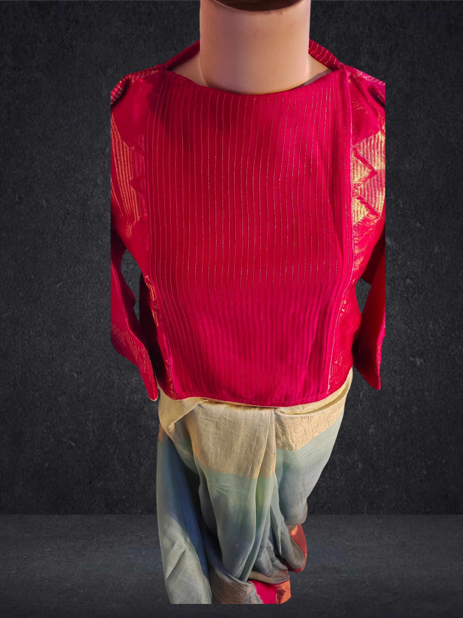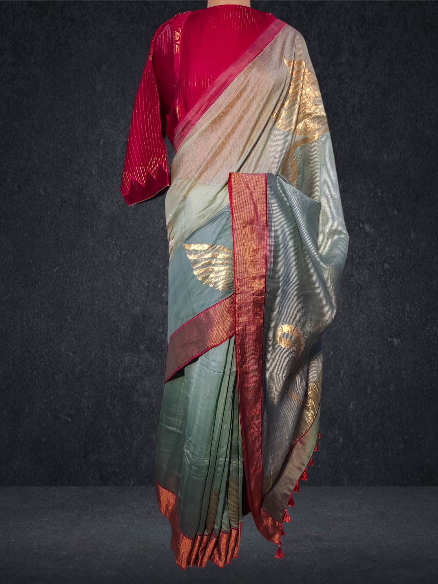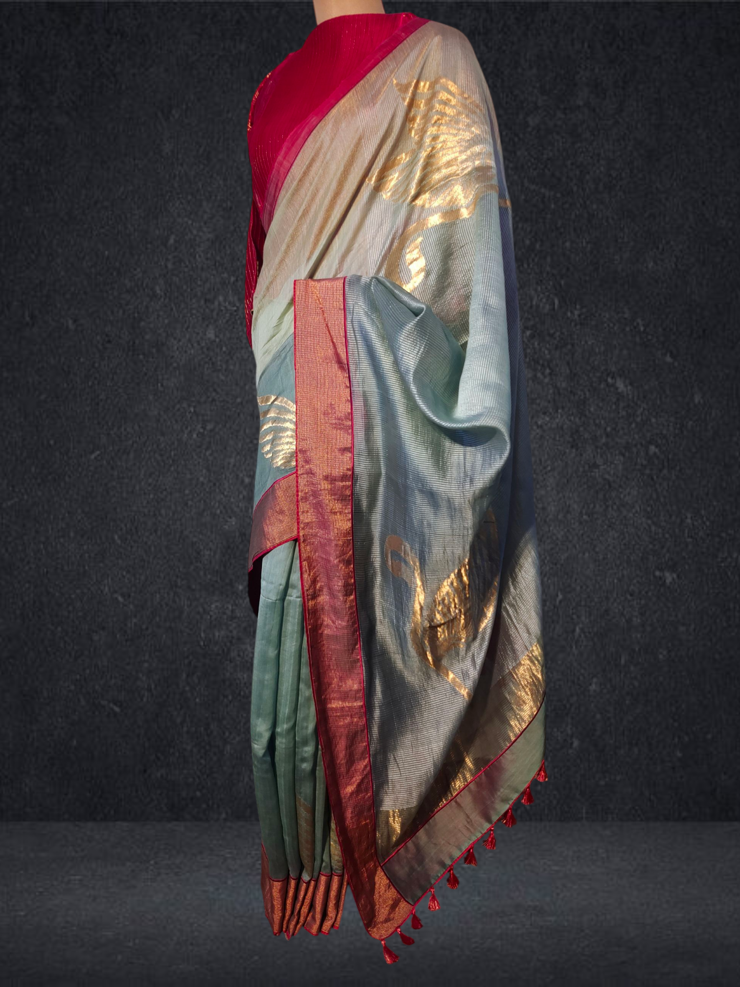 This silk rich chanderi saree is designed in a unique crane theme zari woven on a dhoop chaaon double shade saree base with accented red border treatments and contrasting rich rani pink zari woven blouse.The blouse is semistitched.