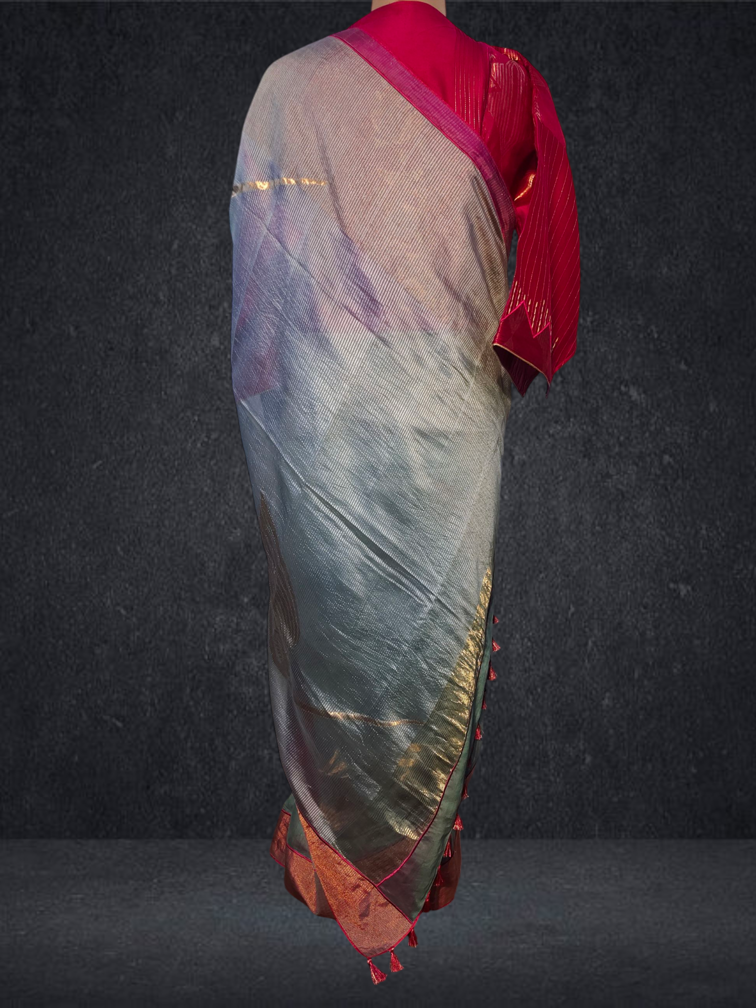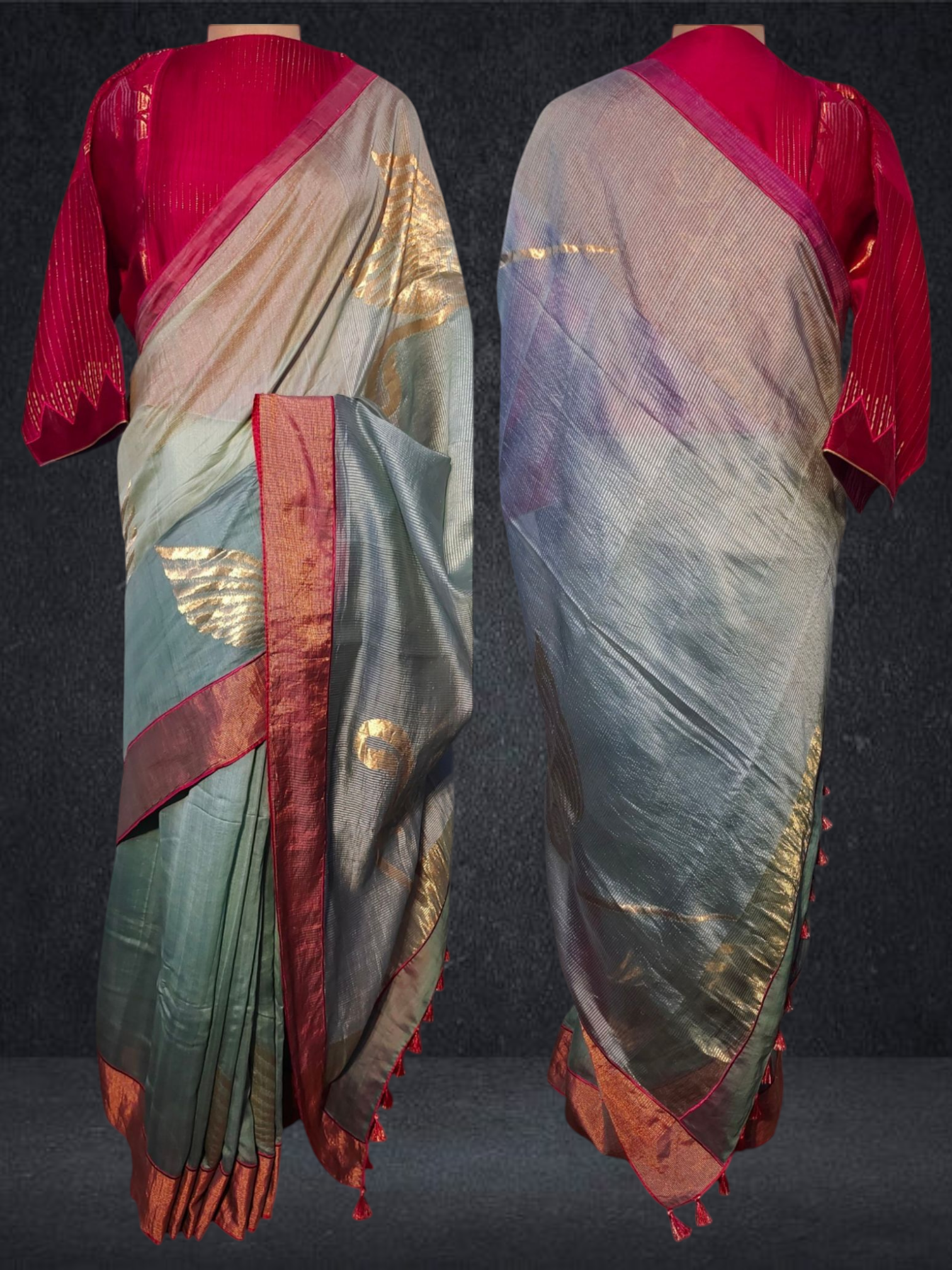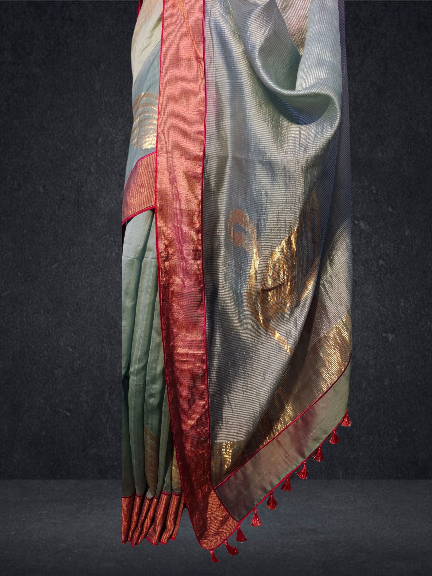 This silk rich chanderi saree is designed in a unique crane theme zari woven on a dhoop chaaon double shade saree base with accented red border treatments and contrasting rich rani pink zari woven blouse.The blouse is semistitched.