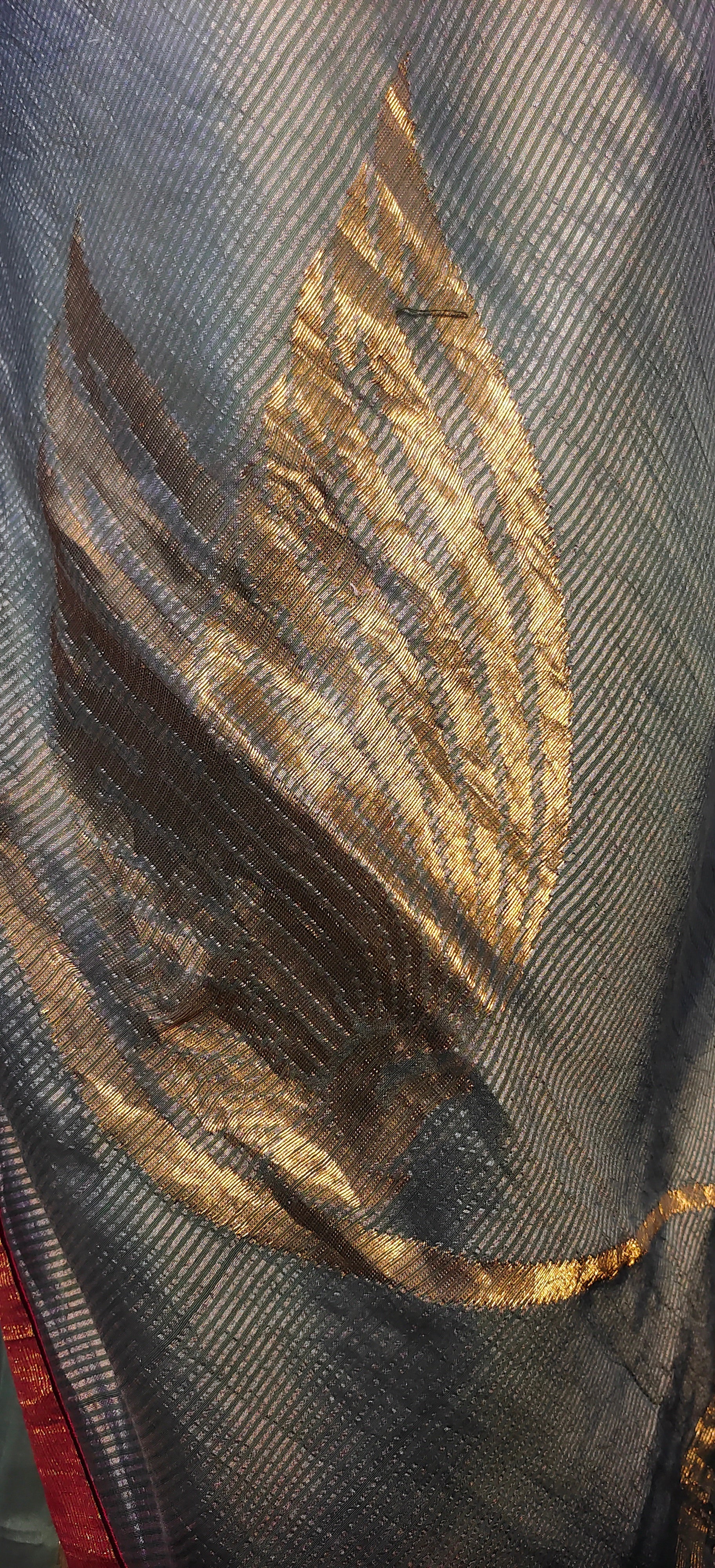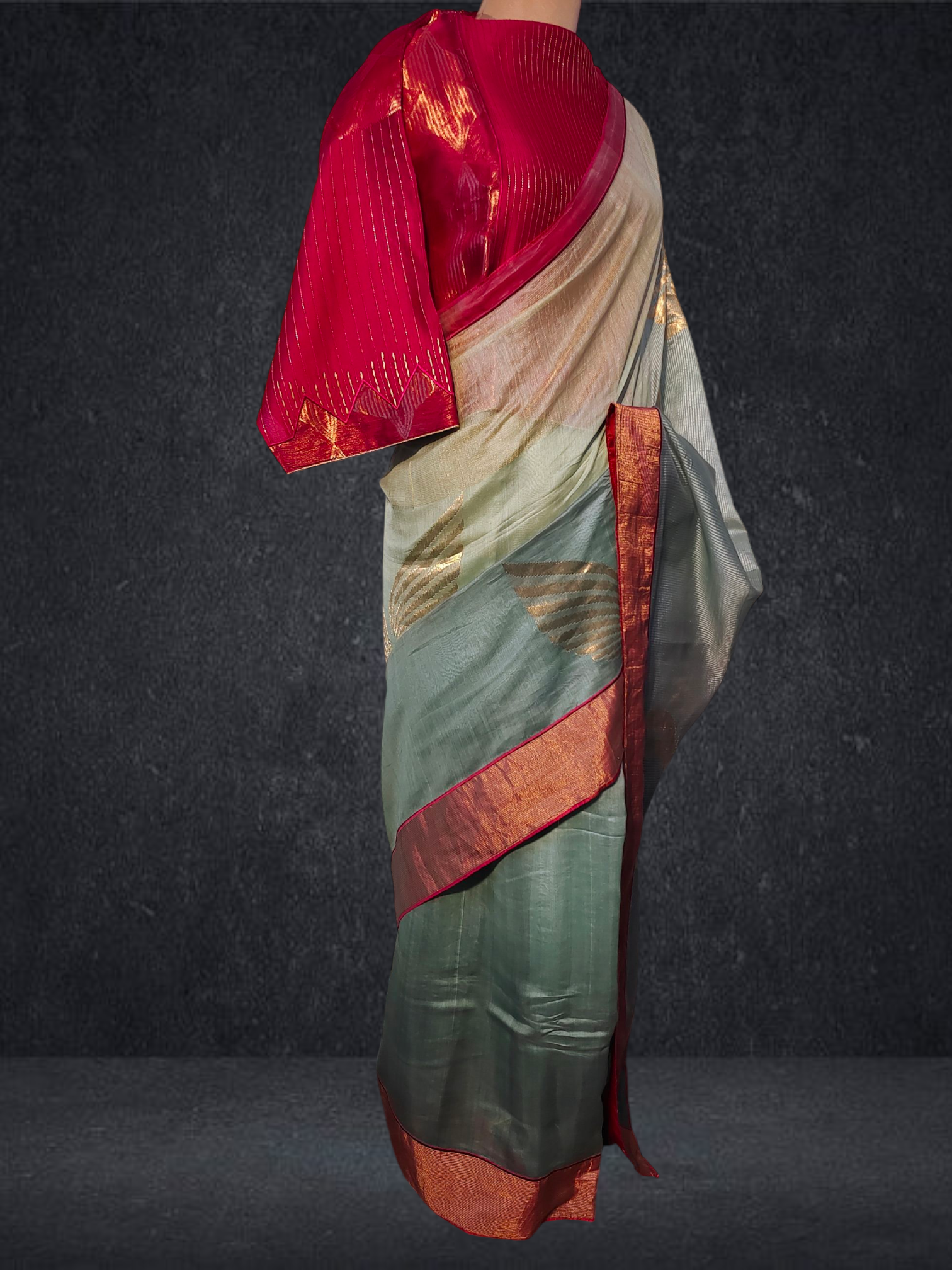 Saree is 5.5 mtrs with a 1.10 mtr blouse PC with piping and embroidery accents available for stitching.