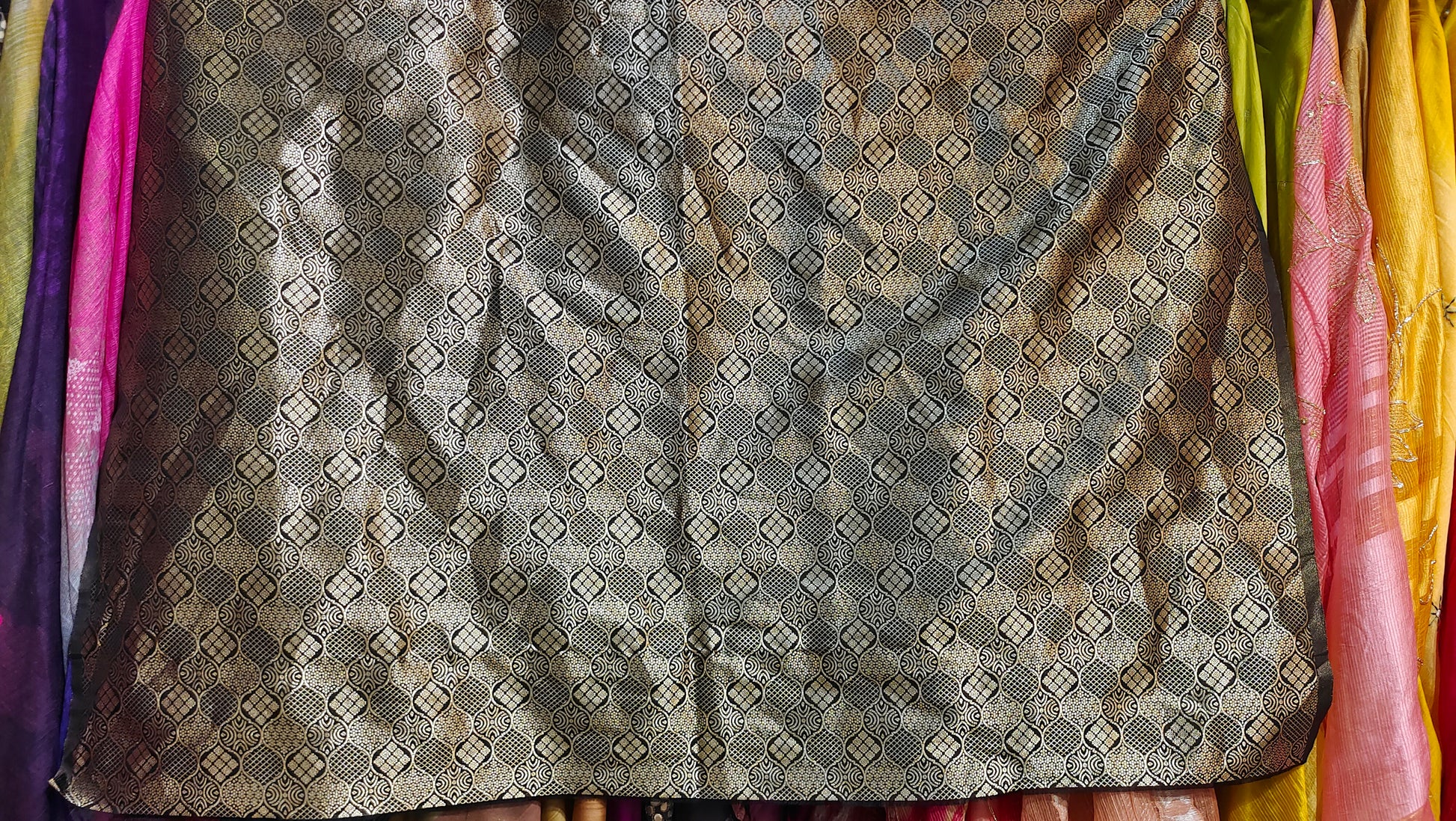 A elegant black silk chanderi saree with gold woven floral embroidery and metallic striped pallu featuring sheer floral panels and beaded edging, paired with a gold jacquard banaresi silk blouse