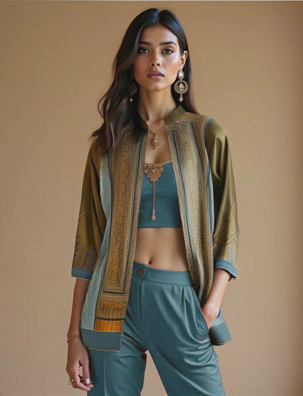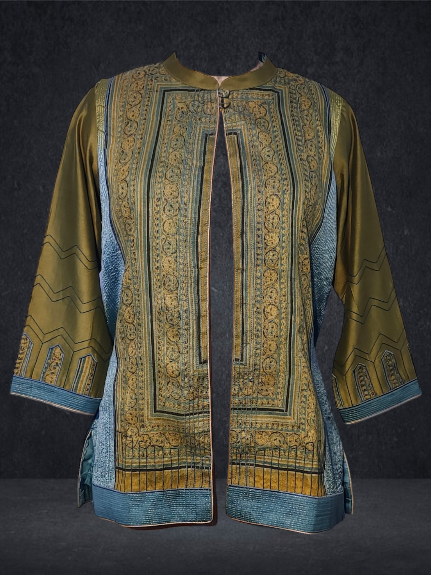 This exquisite semistitched short ajrakh silk jacket is designed in silk chanderi with motifs in gold woven in contemporary styling in the sleeves.The front and back panels are designed with silk ajrakh panels and textured chanderi making it perfect for any indo western formal occasion.The side and back panels are accentuated with natural dye theme adding to the dramatic look
