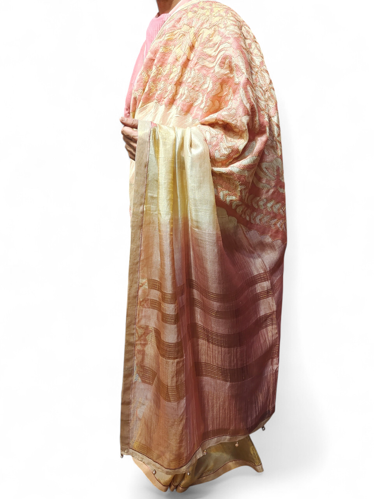 A a full-length soft beige and blush silk saree with sheer texture, featuring intricate pink and gold floral embroidery, a delicate scalloped motif on the pallu, and subtle gold striped border, paired with a structured elbow-sleeve blouse in peach with gold threadwork, geometric back motifs, and wide floral brocade cuffs
