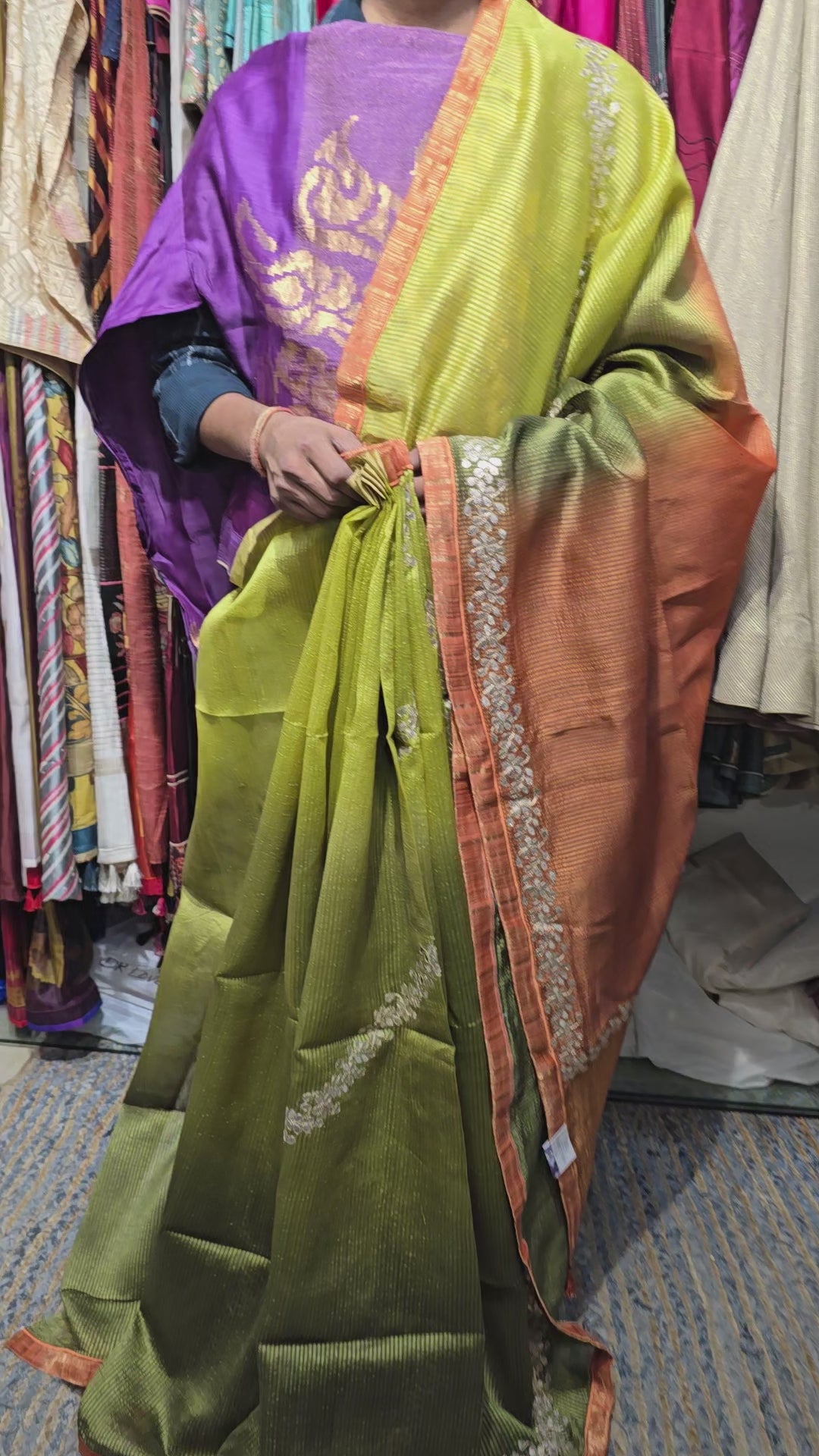 This pure silk lightweight saree with hand gotapatti work on a silk stripe base on the body with beautiful shades of bright , gives a rich offset to the saree and making a noticeable design statement.