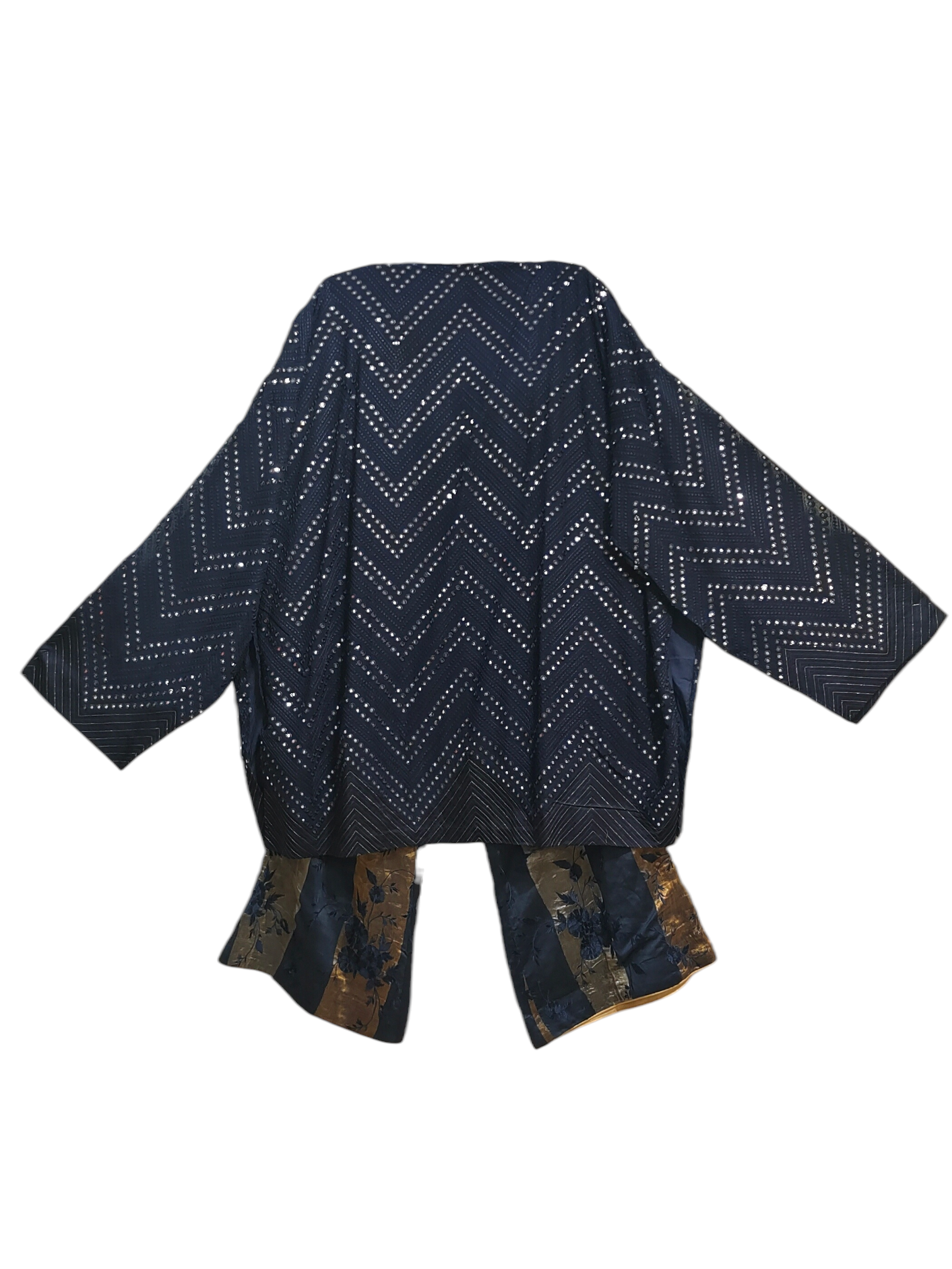 A high-waisted wide-leg silk chanderi embroidered trousers in deep navy blue with vertical paneling in antique gold and muted bronze tones, subtle floral jacquard motifs woven throughout, fluid glossy texture, relaxed fit flaring from the hip to ankle length, paired with a tunic in midnight navy silk featuring all-over chevron stitch pattern and dense metallic dot embellishment, wide three-quarter sleeves, clean straight hem at waist length, modern artisanal luxury aesthetic.