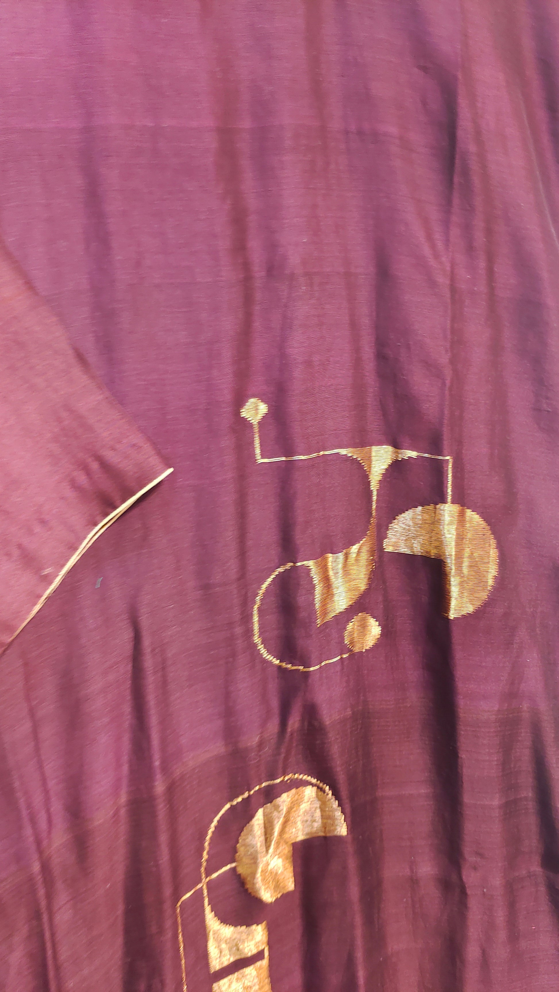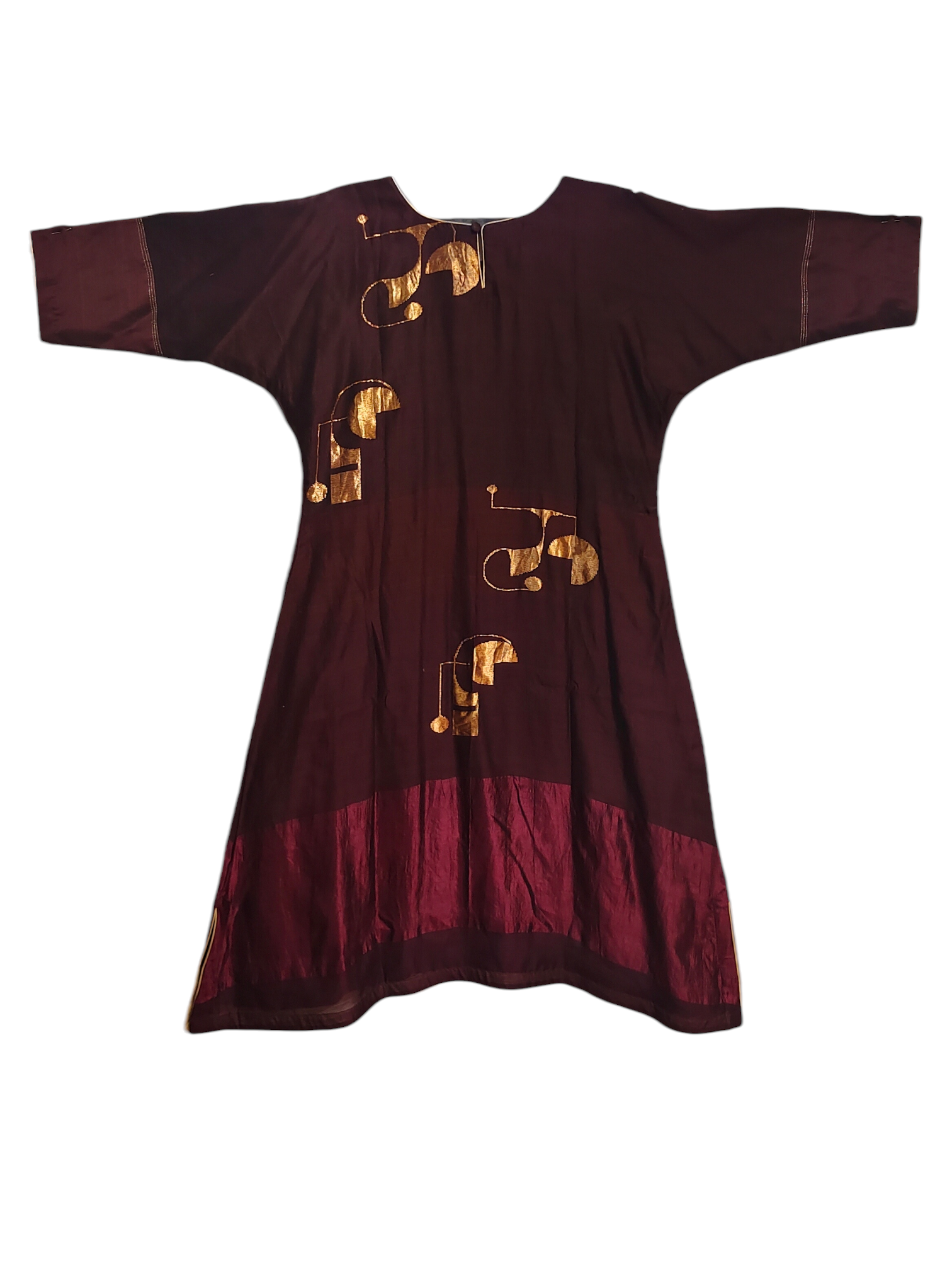 A calf-length plum chanderi silk dress with abstract golden zari woven motifs and a wide contrasting burgundy silk border, featuring a relaxed A-line silhouette and elbow-length sleeves