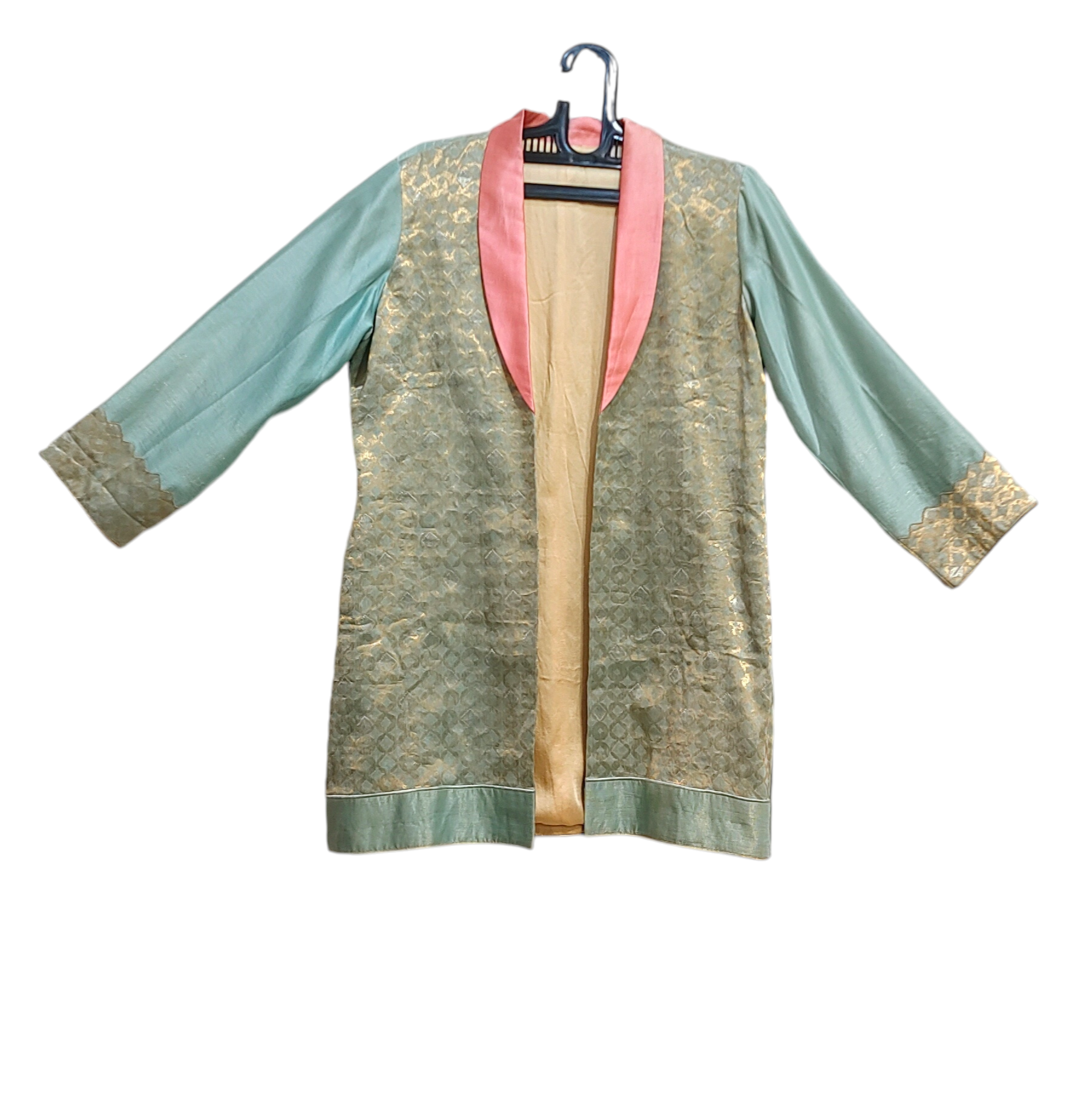 A mid-thigh length seafoam green silk brocade jacket with metallic gold woven detailing on the front panel, cuffs, and hem, featuring a coral pink satin shawl collar and an open front design, three-quarter sleeves with intricate texture