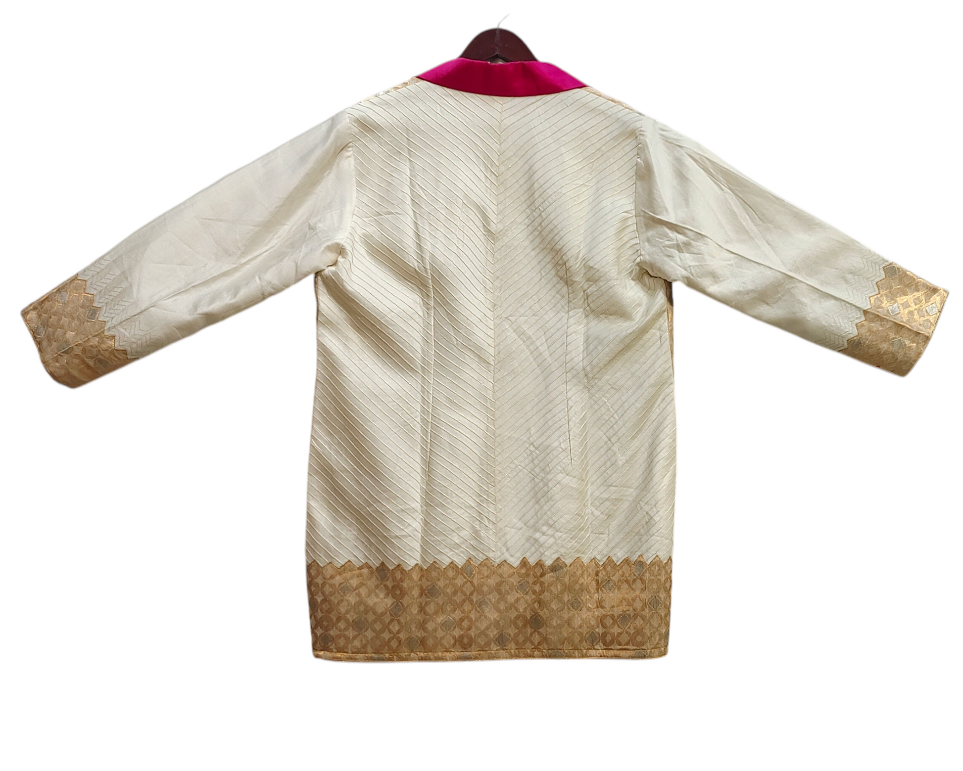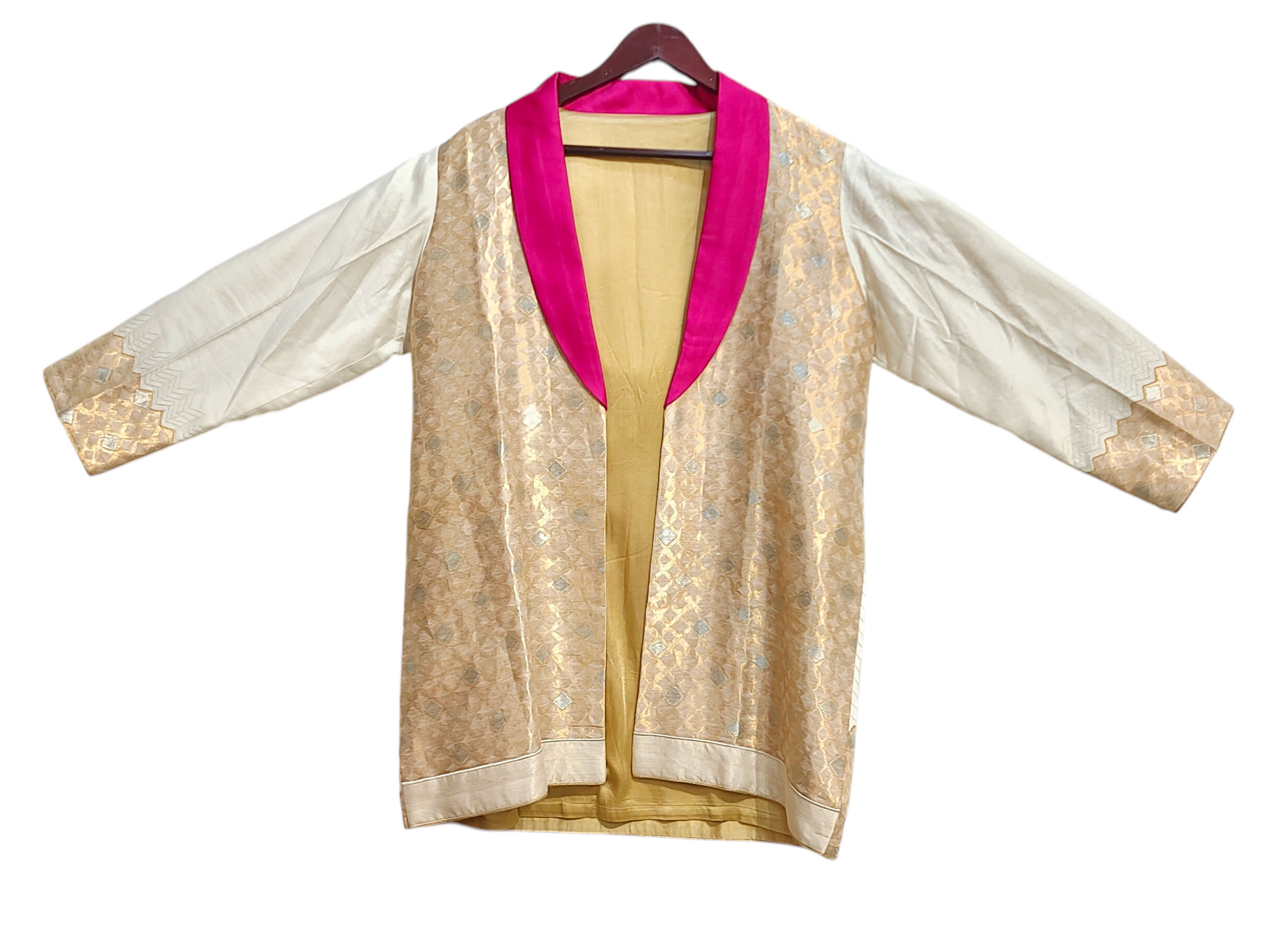 A mid-thigh length ivory silk brocade jacket with golden zari woven detailing on the front panel, hem, and sleeve cuffs, featuring a deep pink velvet shawl collar, structured shoulders and open front, rich textile contrast in a traditional-meets-modern silhouette, clean minimal backdrop, in the style of a high-end South Asian fusion fashion editorial. Worn with a rani pink sleeveless corset inside the coat and a flared plazzo pant with golden leaf weaving patterns around the hem