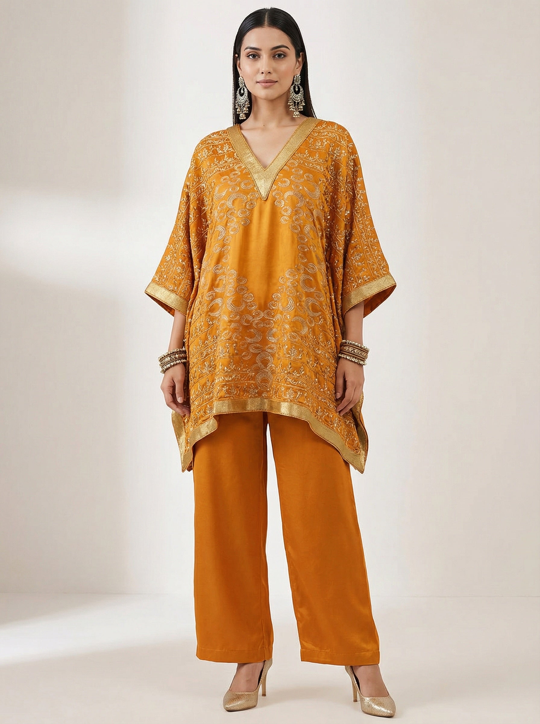 A mustard orange colour chanderi co-ord set featuring a gold zari embroidered asymmetrical kaftan kurta with a V-neckline and wide sleeves, paired with matching wide-leg silk trousers, ornate traditional motifs and rich border detailing, styled with gold heels and statement earrings