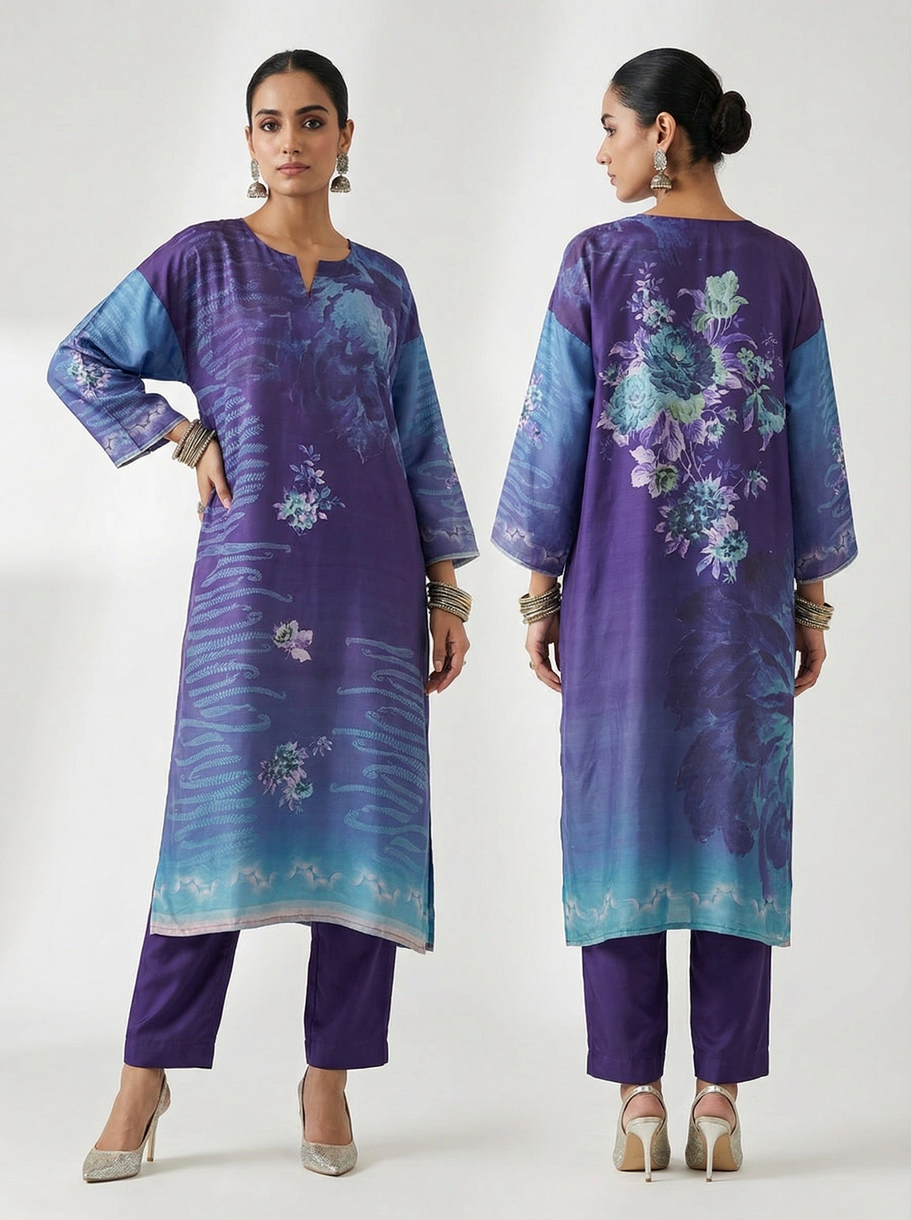 A long ombré kurta in deep violet fading into turquoise, adorned with soft floral and wave-like abstract patterns in shades of blue and lilac, styled with a smooth silk dupatta in contrasting royal purple and aqua blue with a thin golden border; the kurta features a straight loose fit with half sleeves and printed floral detailing throughout