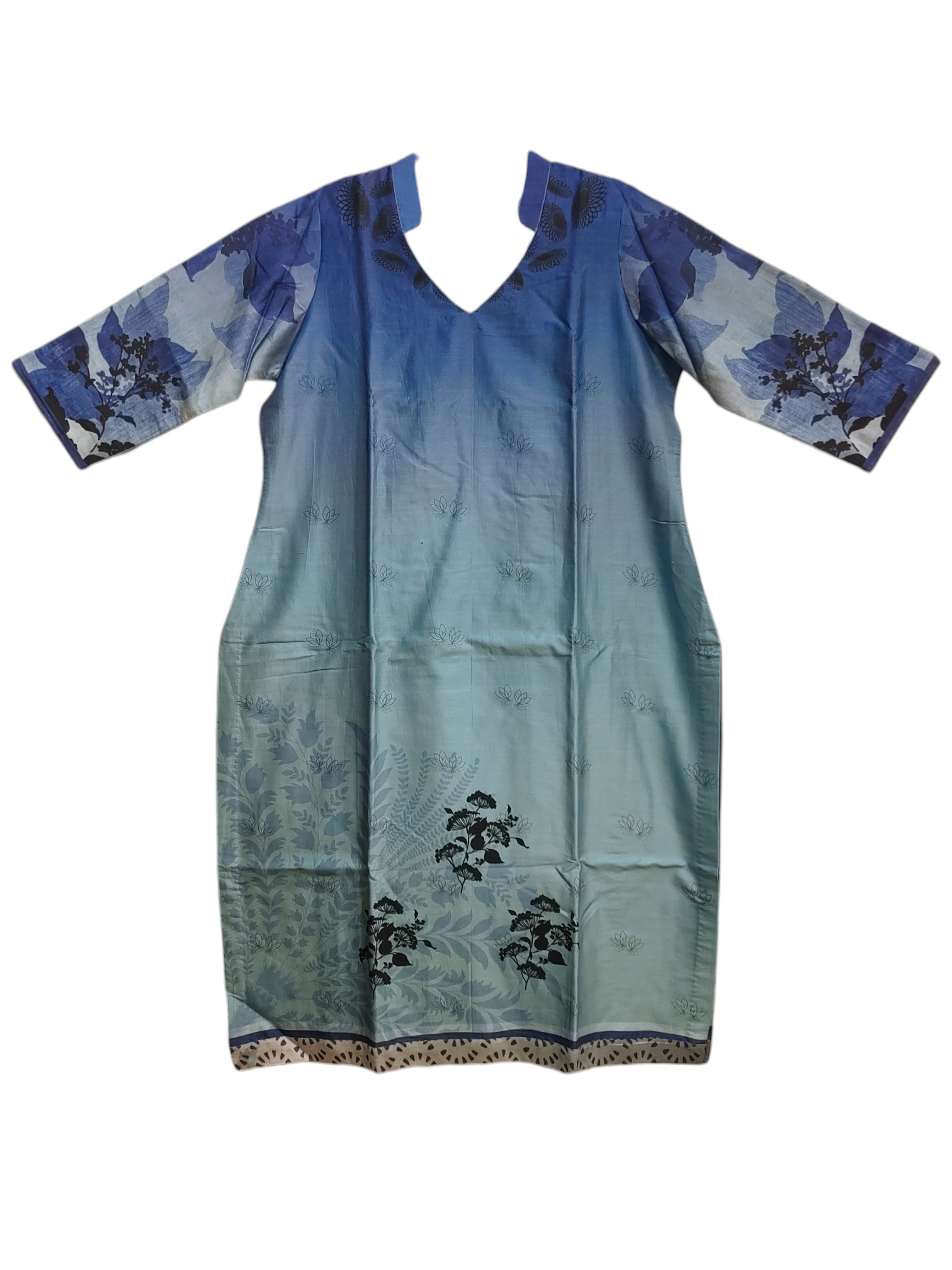A mid-length chanderi digital printed kurta with elbow-length sleeves, featuring a soft gradient from deep indigo to pale aqua with delicate fern and floral prints, detailed with black botanical motifs and printed sleeve accents, finished with a V-slit neckline and contrasting printed hem