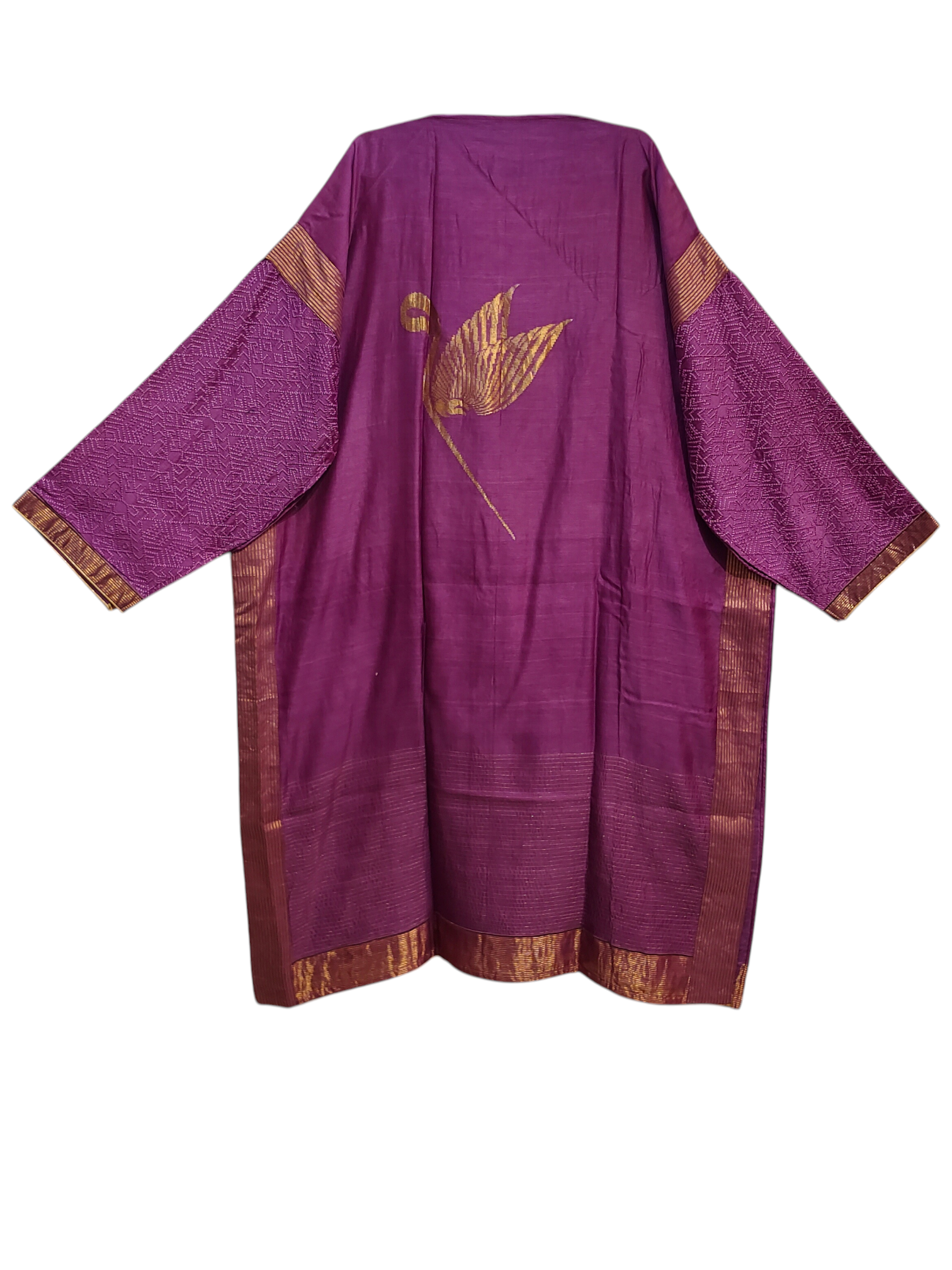 A deep plum silk chanderi kurta with intricate gold woven crane motif in lowere are of front side and upper back area on back side and zari borders and embroidered three quarter sleeves, paired with a sheer multicolor ombré dupatta in red, orange, and purple featuring leaf and vine motifs, styled in the aesthetic of a bold contemporary Indian fashion editorial, minimal black background with soft directional lighting to enhance fabric richness.