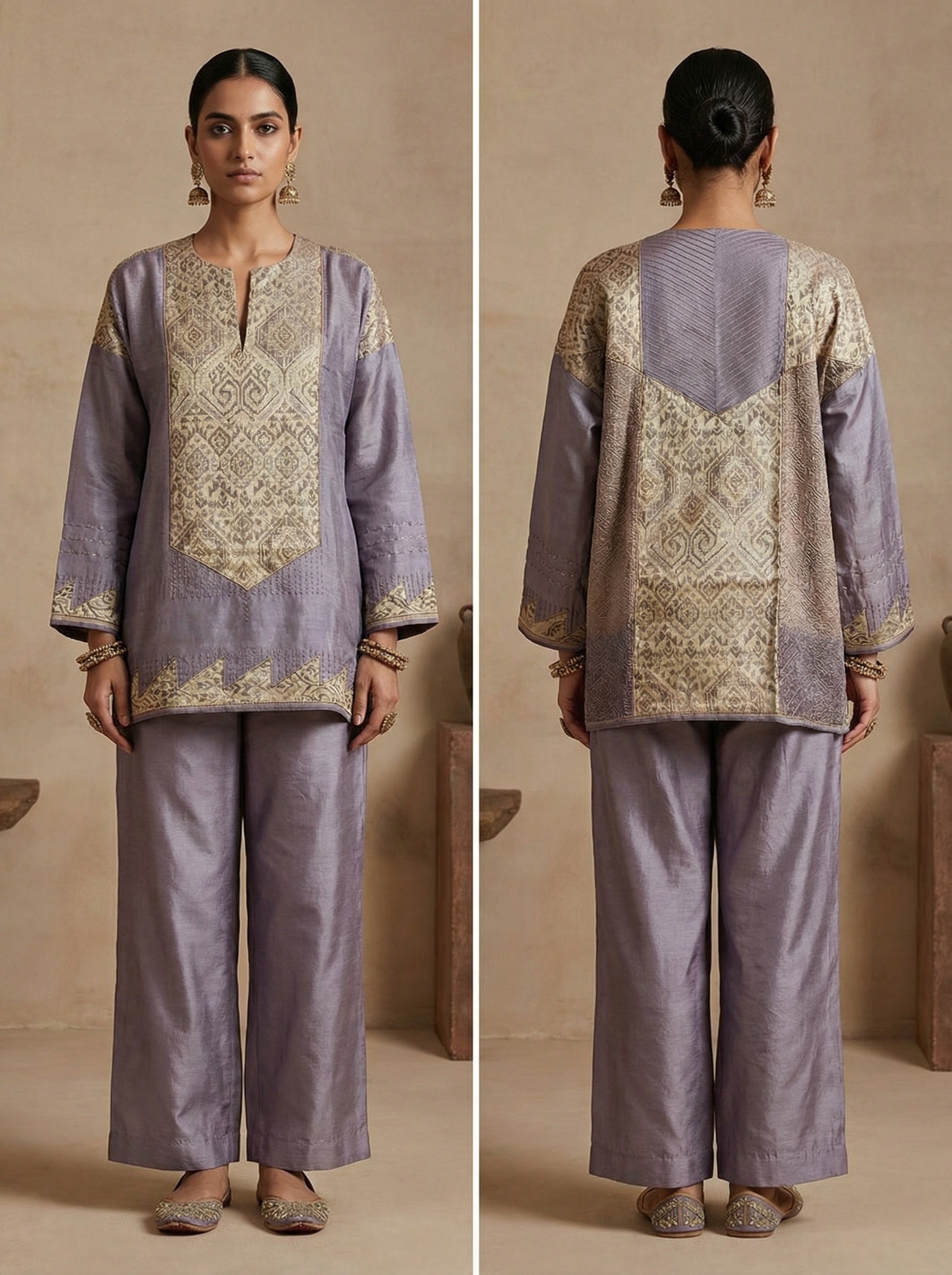 A short waist-length tunic with lavender grey chanderi silk panels at the back and intricate beige-gold brocade woven detailing in front panel, three quarter sleeves, featuring geometric patterns and metallic threadwork accents on the cuffs and hem, styled in a minimal fashion editorial in the style of Sabyasachi couture.