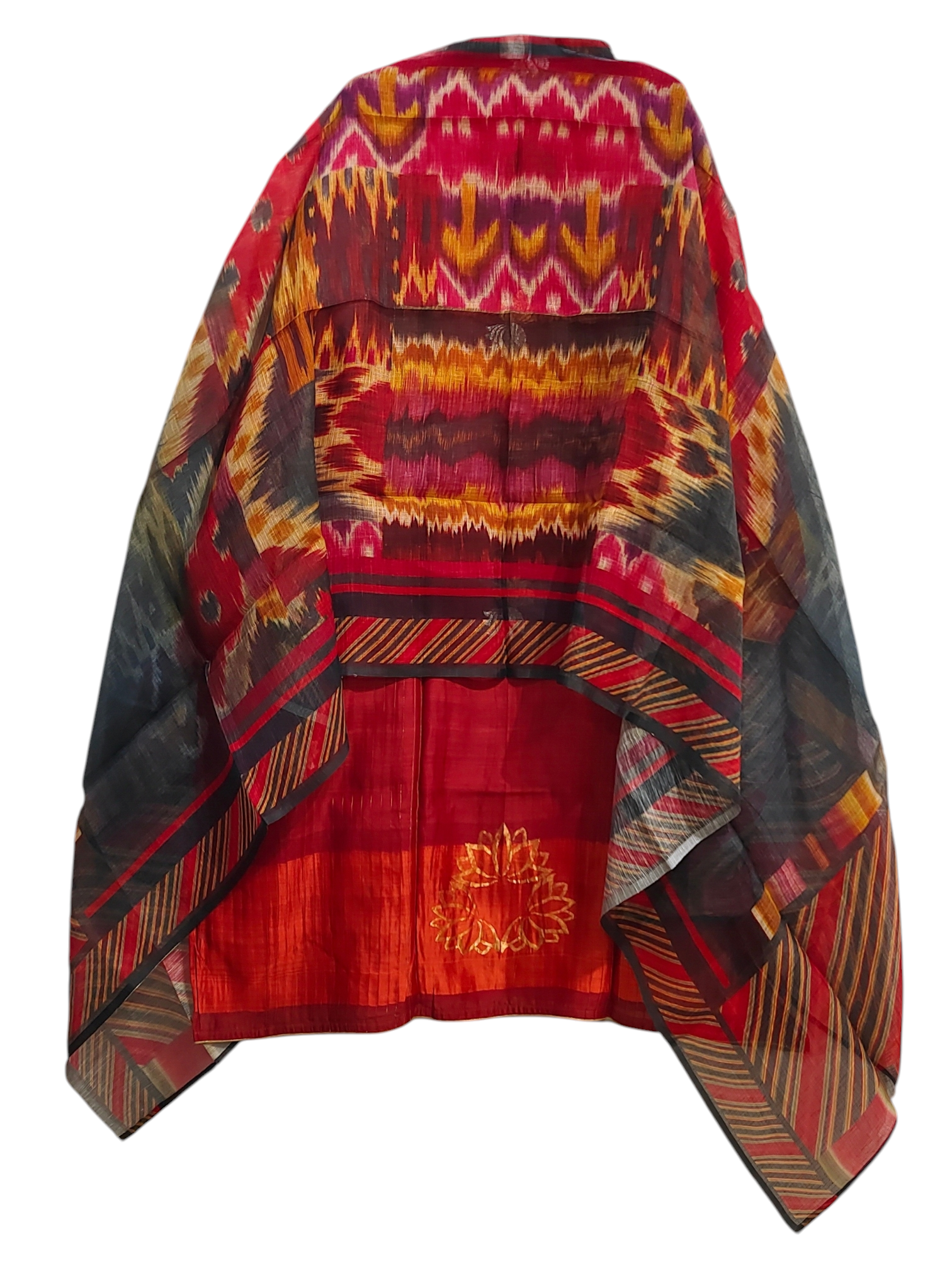 This 3 pc suitset features a knee-length red silk kurta with intricate golden floral woven design, paired with a sheer, multicolor dupatta featuring bold geometric and ikat prints