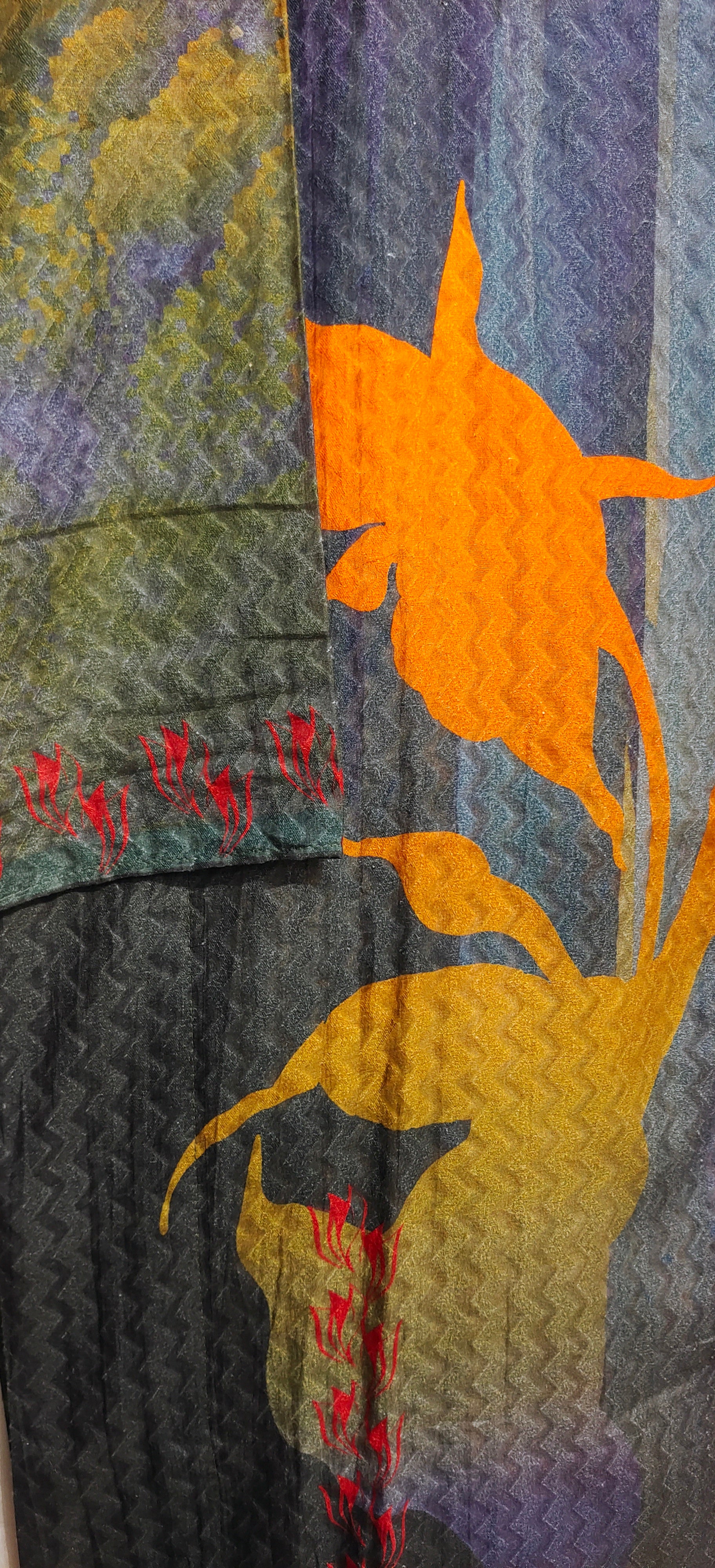 This 3 pc suitset features wearing a mid calf-length textured silk kurta in deep navy with a zigzag weave, featuring painterly floral prints in vivid yellows, greens, and oranges on the front side, and subtle red embroidered accents at the hem and sleeves, styled with a sheer tricolor dupatta in black, olive, and burnt orange silk with gold trim