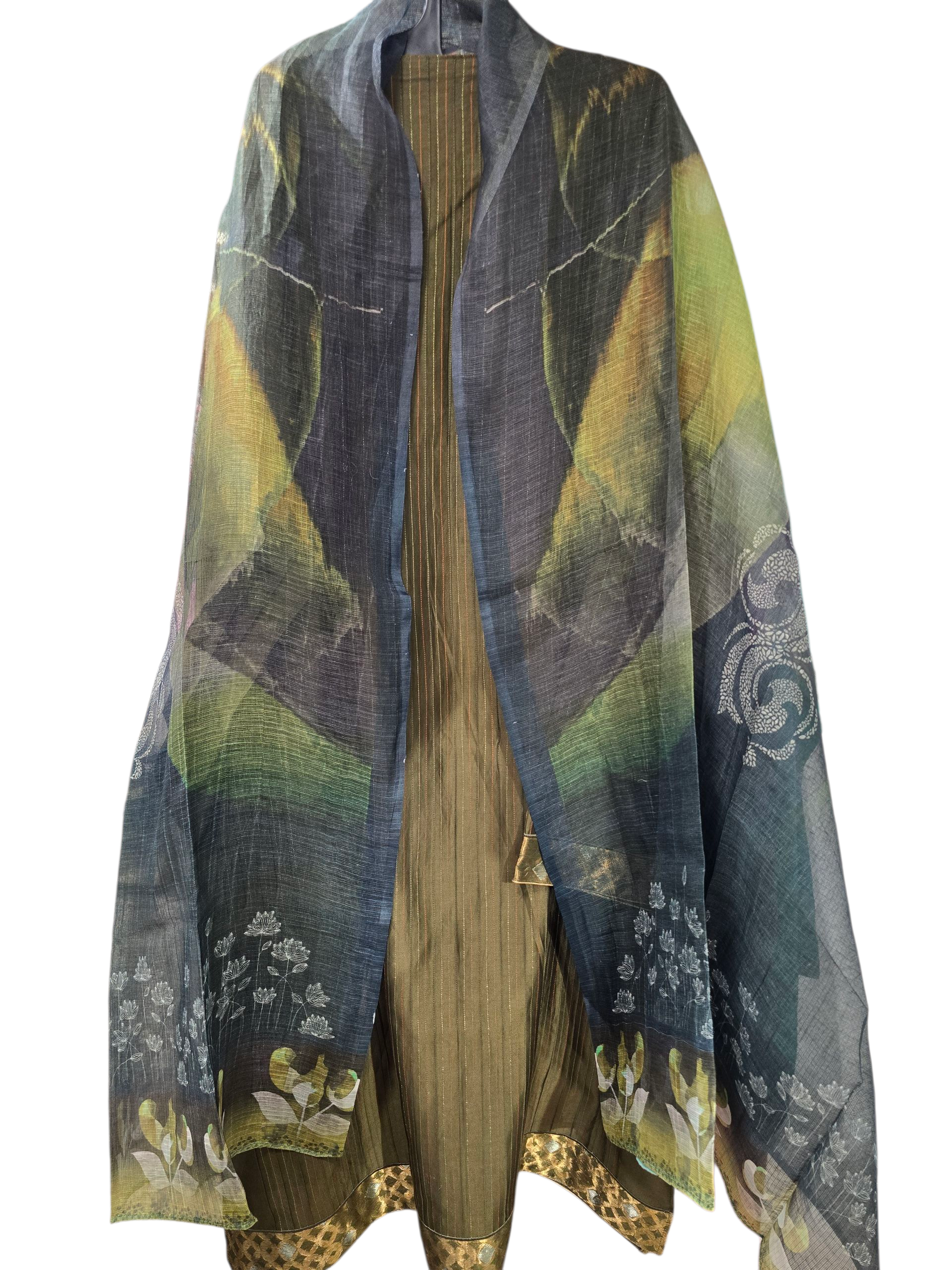This 3 pc suitset features a mid-calf length olive green kurta with fine vertical golden stripes and gold brocade hem, layered with a sheer navy blue dupatta featuring abstract painterly patterns in green and ochre, and white floral embroidery at the ends, worn with matching trouser pants, silver oxidised jewellery in earrings and bangles, golden matching heel sandles