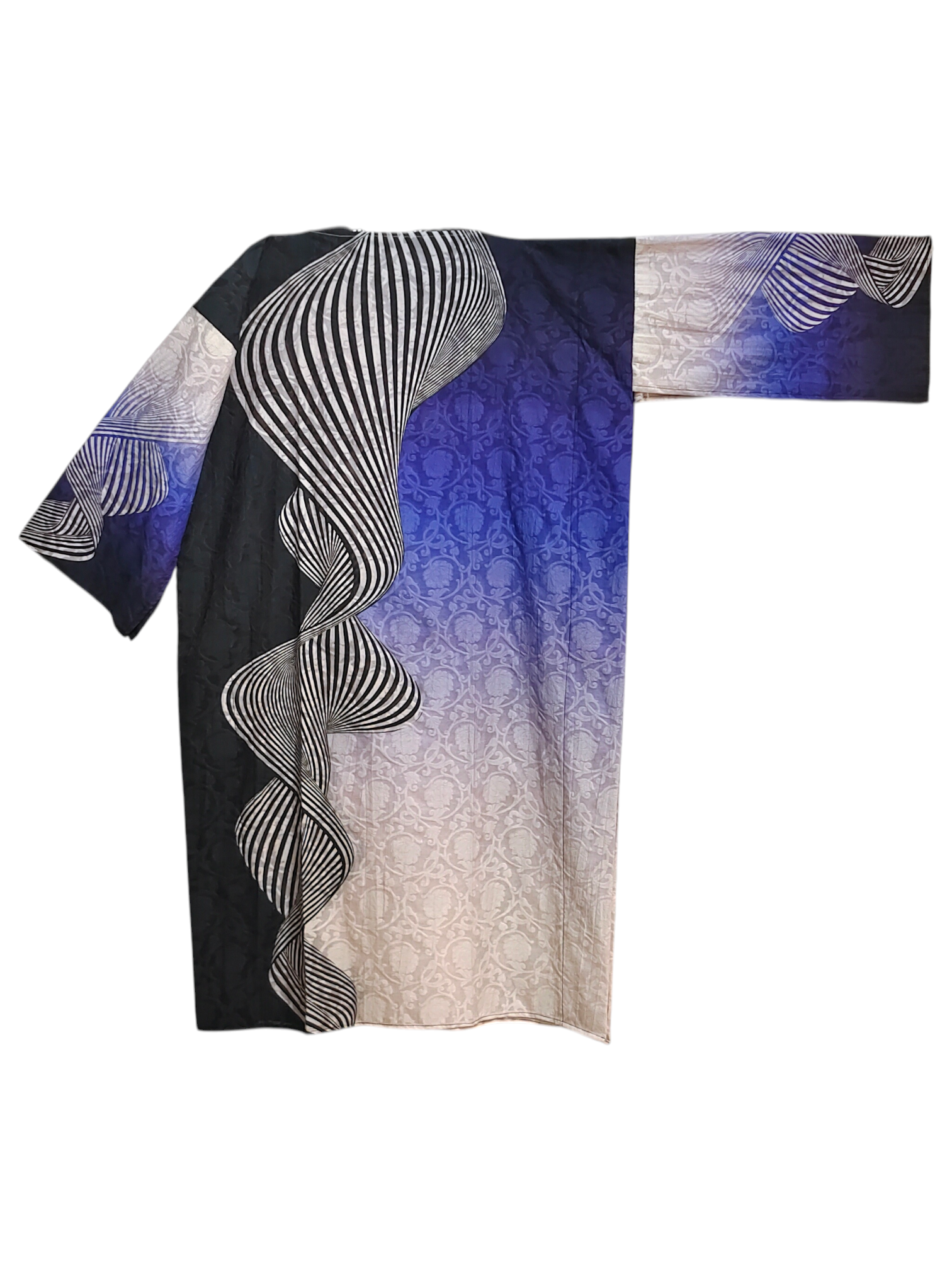 This 3 pc suitset features a knee-length chanderi brocade kurta in gradient tones of black, violet, and cream, featuring large abstract black-and-white optical illusion swirls over a damask jacquard base, styled with a minimalistic black and cobalt blue dupatta with metallic gold borders.The single side ghera is 34 inch so sizes upto 5XL are possible to get tailored in this material.