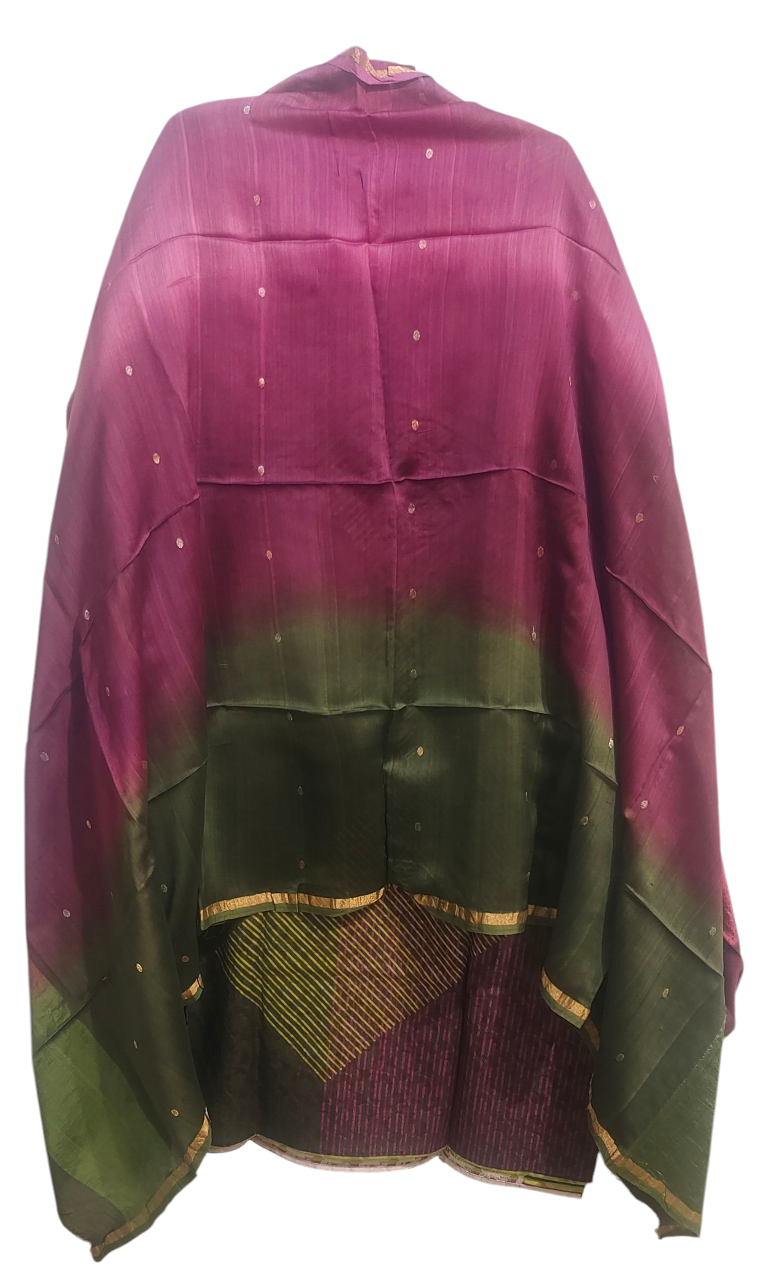 It is paired with a shaded chanderi dupatta. The dupatta measures 2.5 meters in length and 38 inches in width.the ensemble is provided with a matching cotton satin bottom material for 2.5 mts.Kurta will need lining for tailoring
