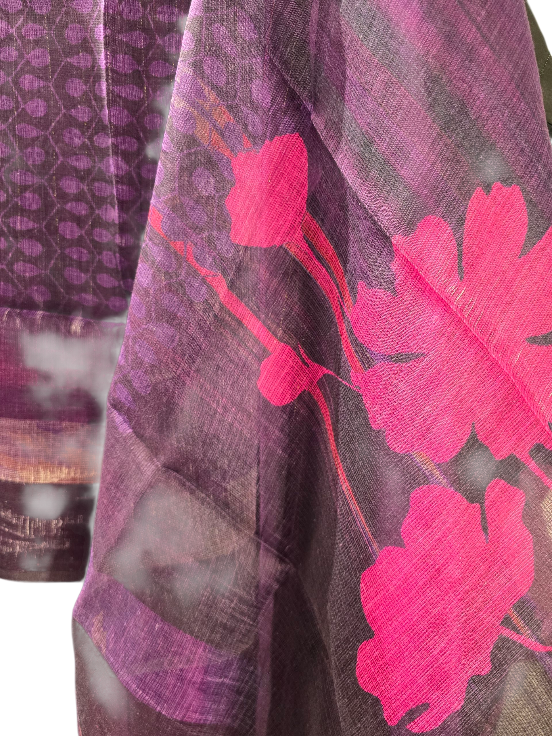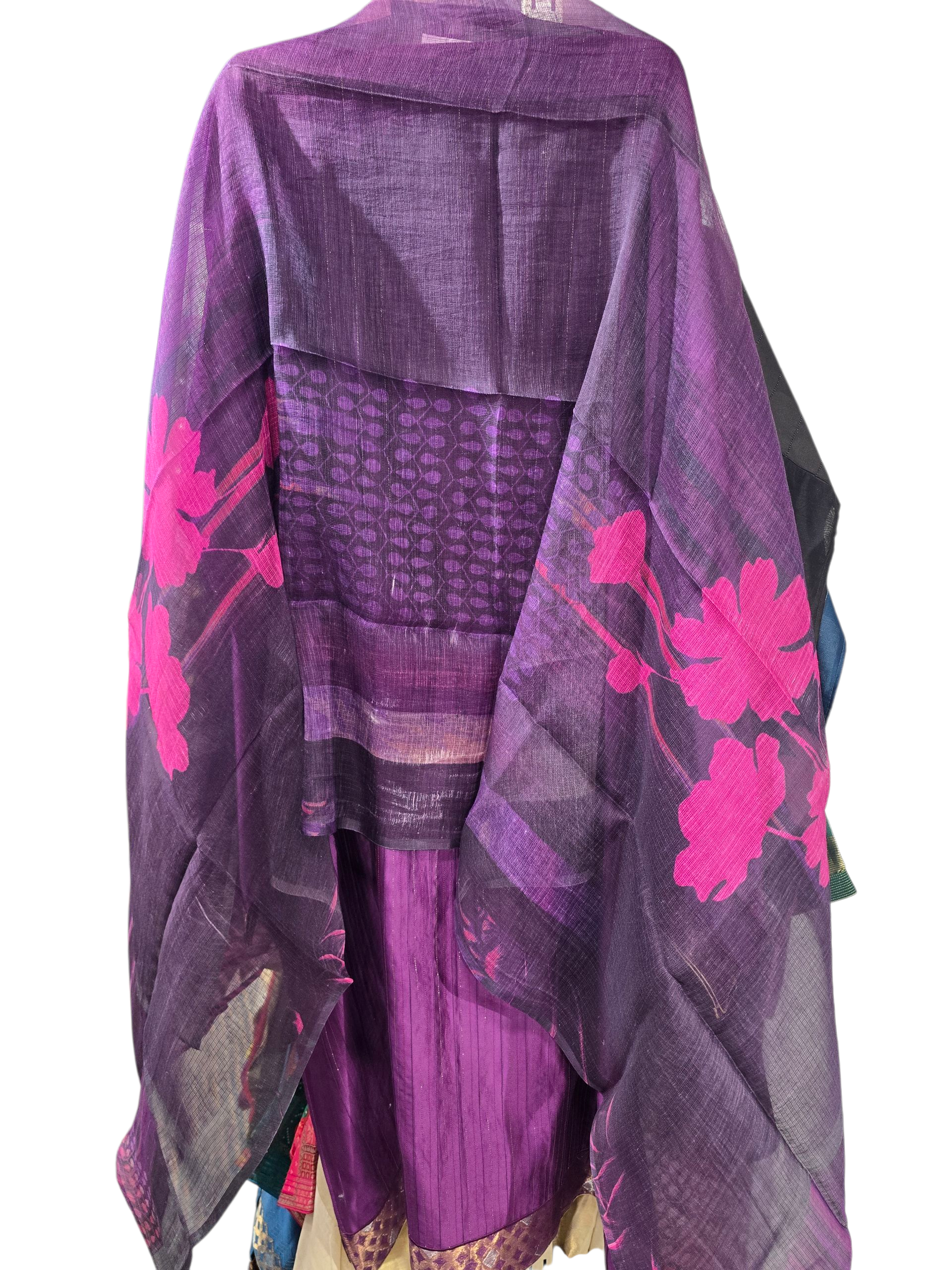 This 3 pc suitset features a mid-calf length fitted silk kurta in deep plum with subtle vertical pinstripes and gold brocade hem, paired with a sheer dupatta in dark purple featuring large hot pink floral prints and abstract geometric detailing, worn with matching trouser pants, silver oxidised jewellery in earrings and bangles, golden matching heel sandles
