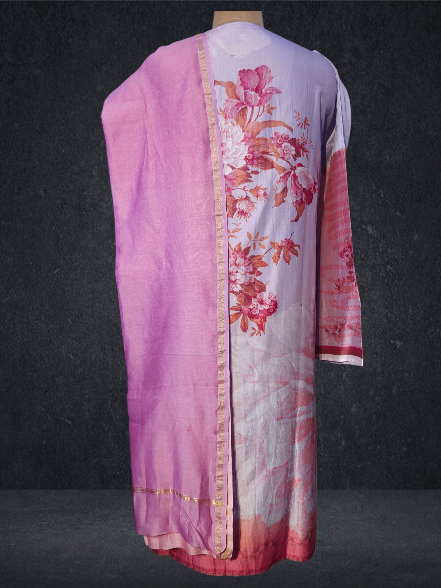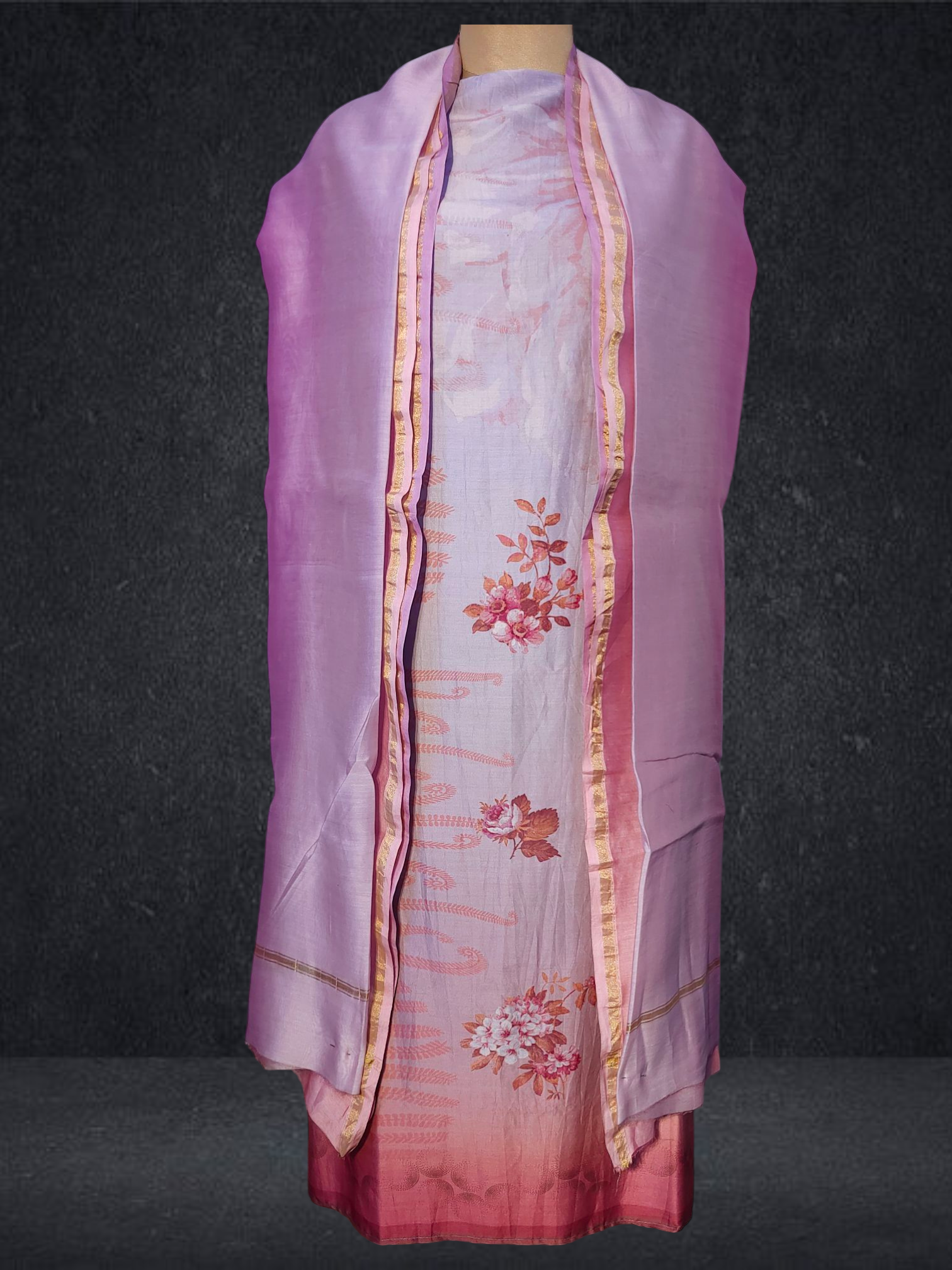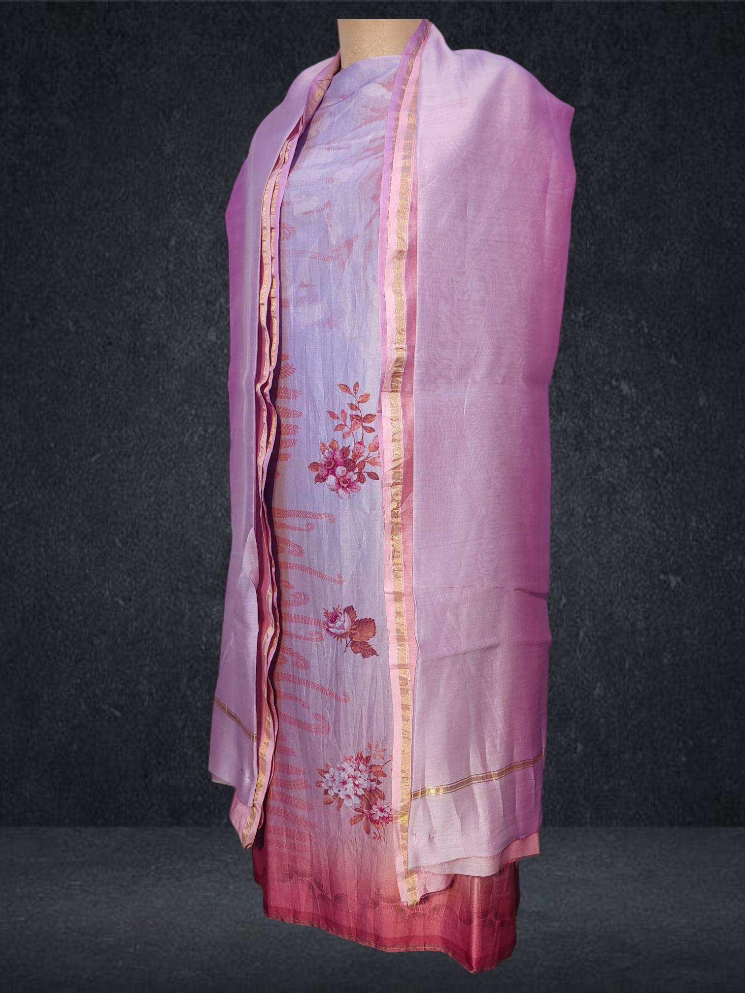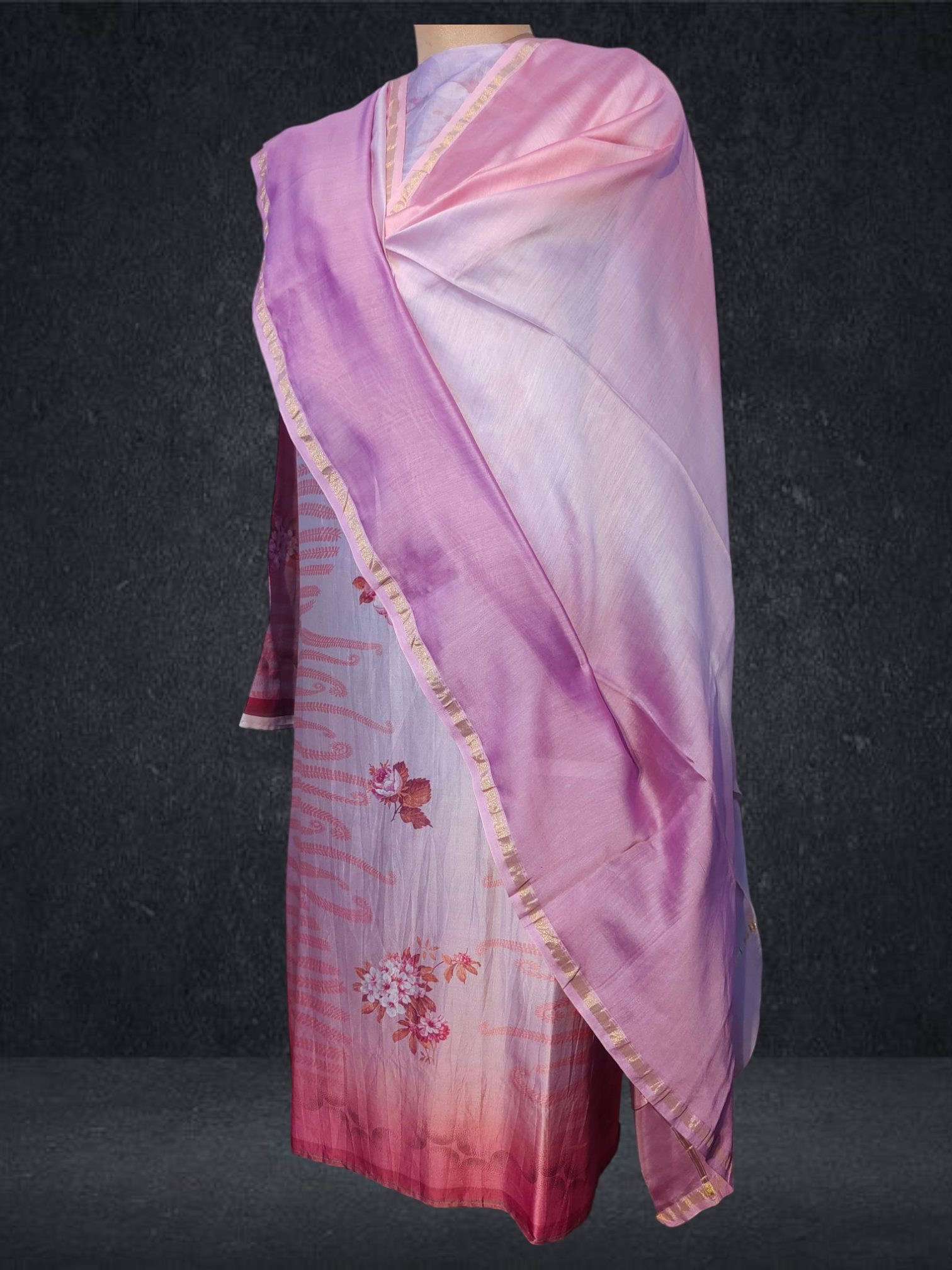 It is paired with a shaded Chanderi silk dupatta. The dupatta measures 2.5 meters in length and 38 inches in width.the ensemble is provided with a matching cotton satin bottom material for 2.5 mts.Kurta will need lining for tailoring