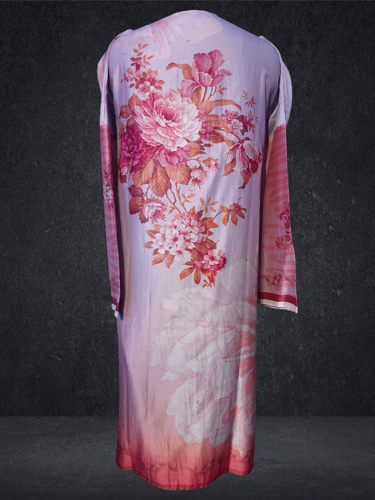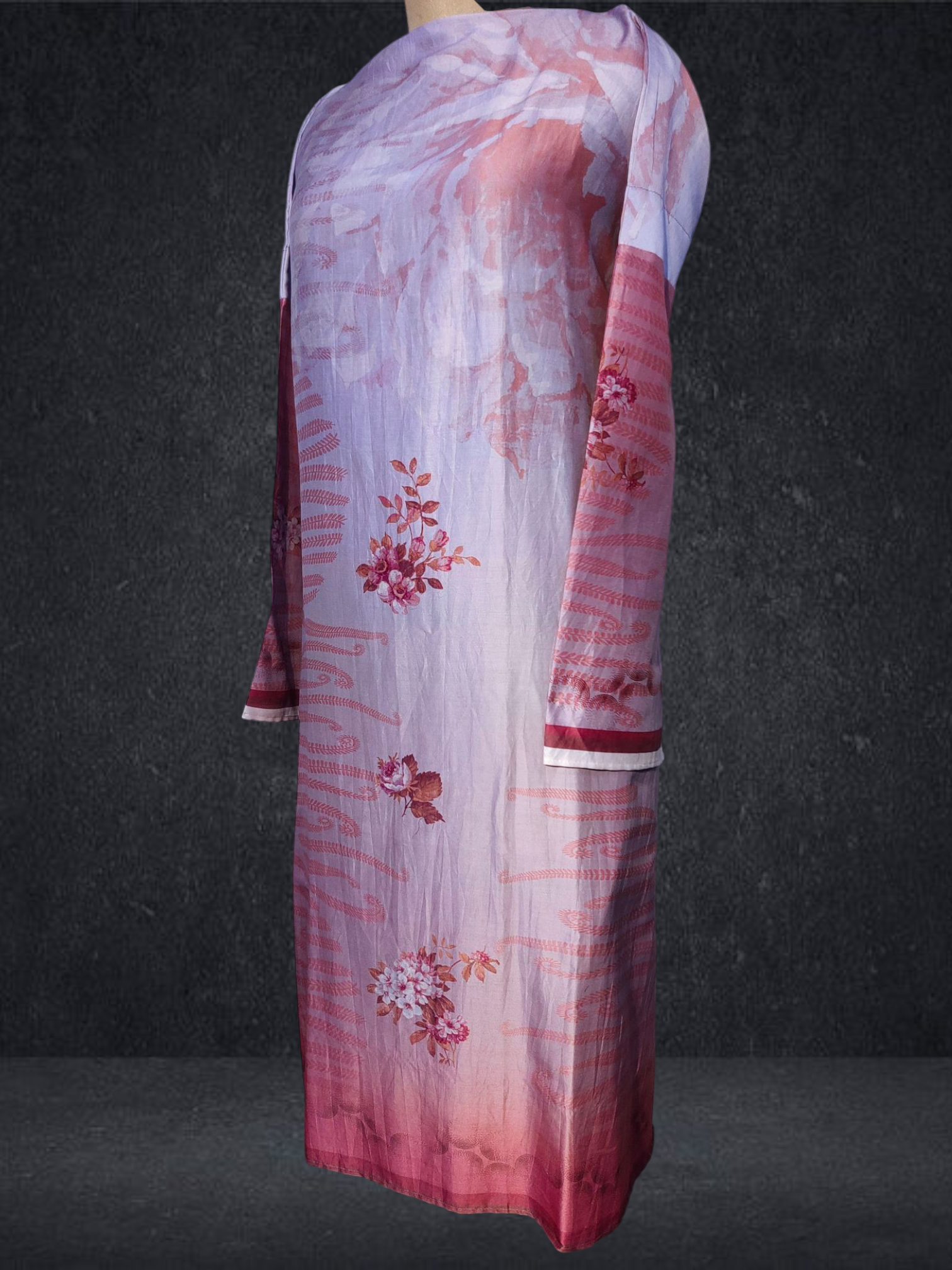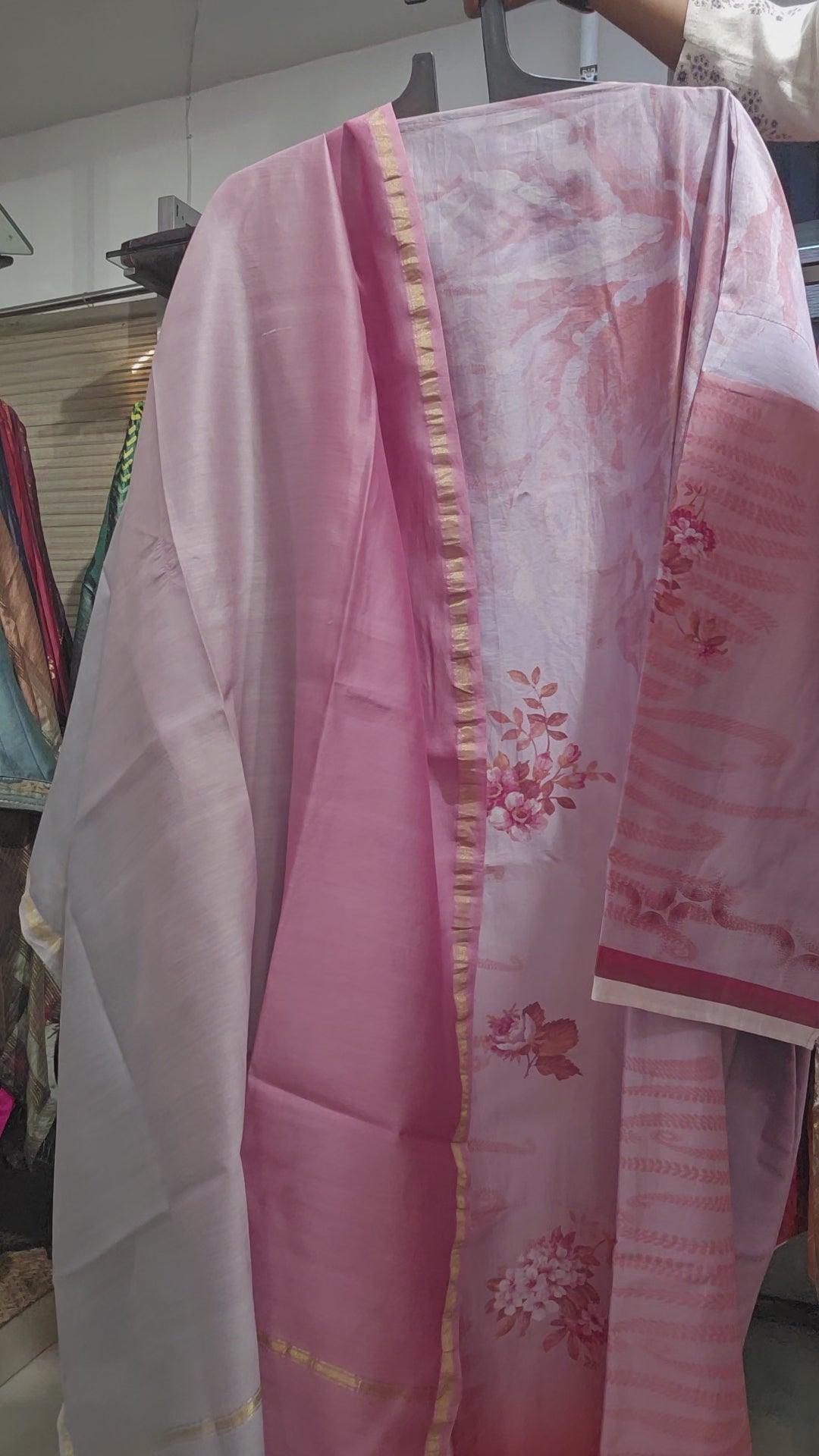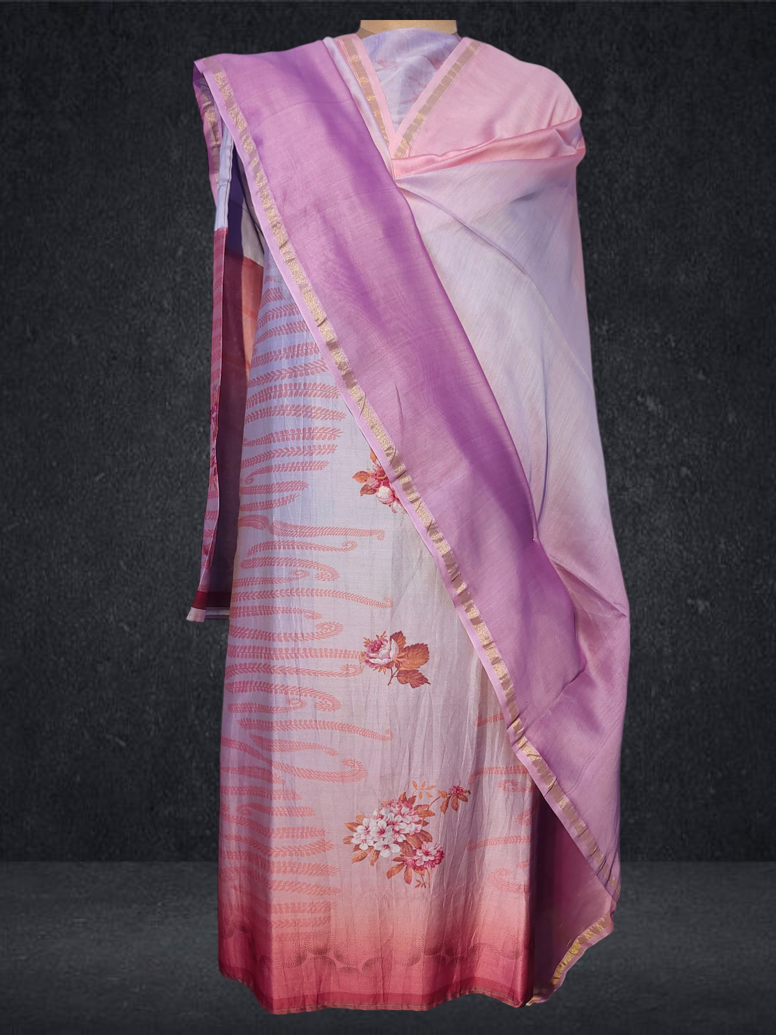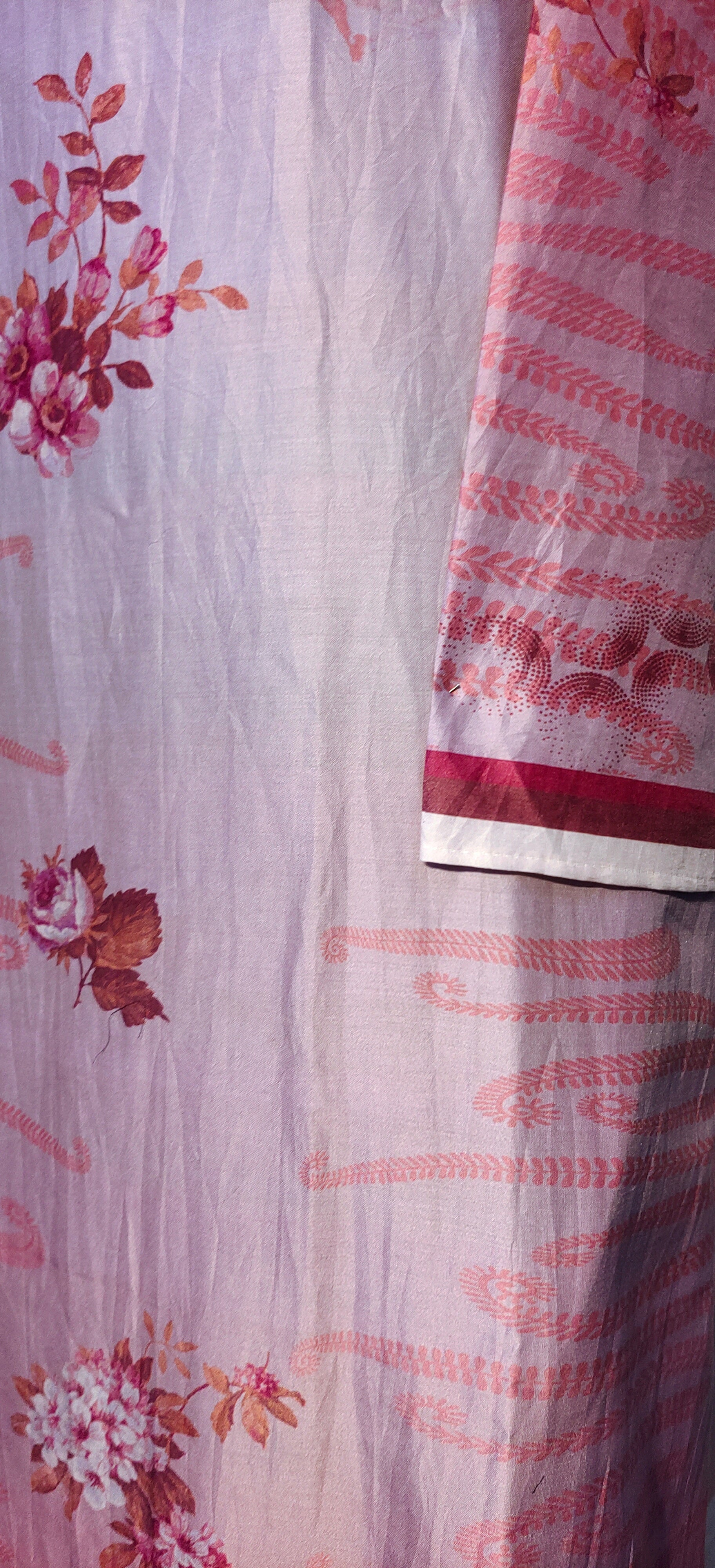 It is paired with a shaded Chanderi silk dupatta. The dupatta measures 2.5 meters in length and 38 inches in width.the ensemble is provided with a matching cotton satin bottom material for 2.5 mts.Kurta will need lining for tailoring