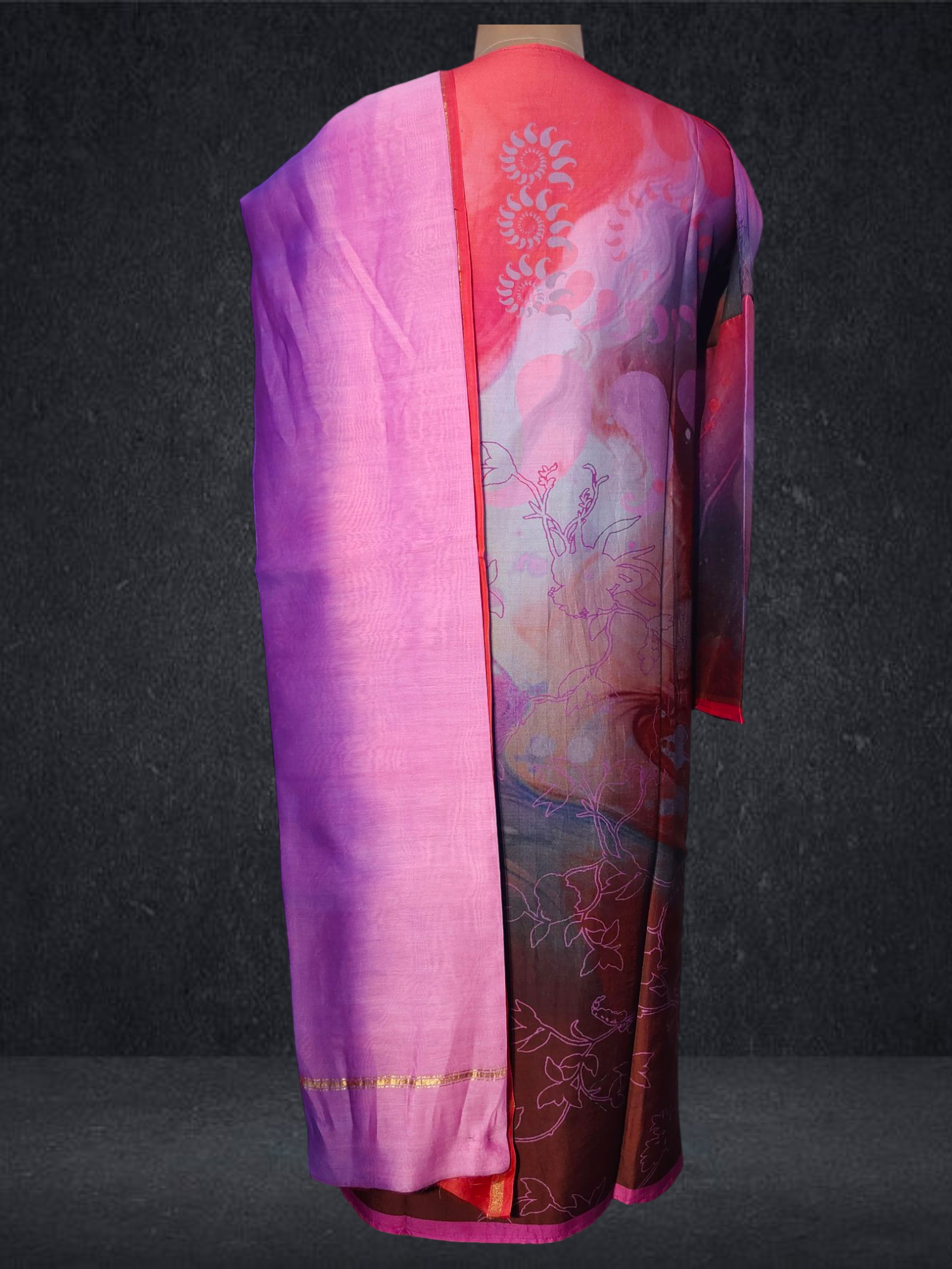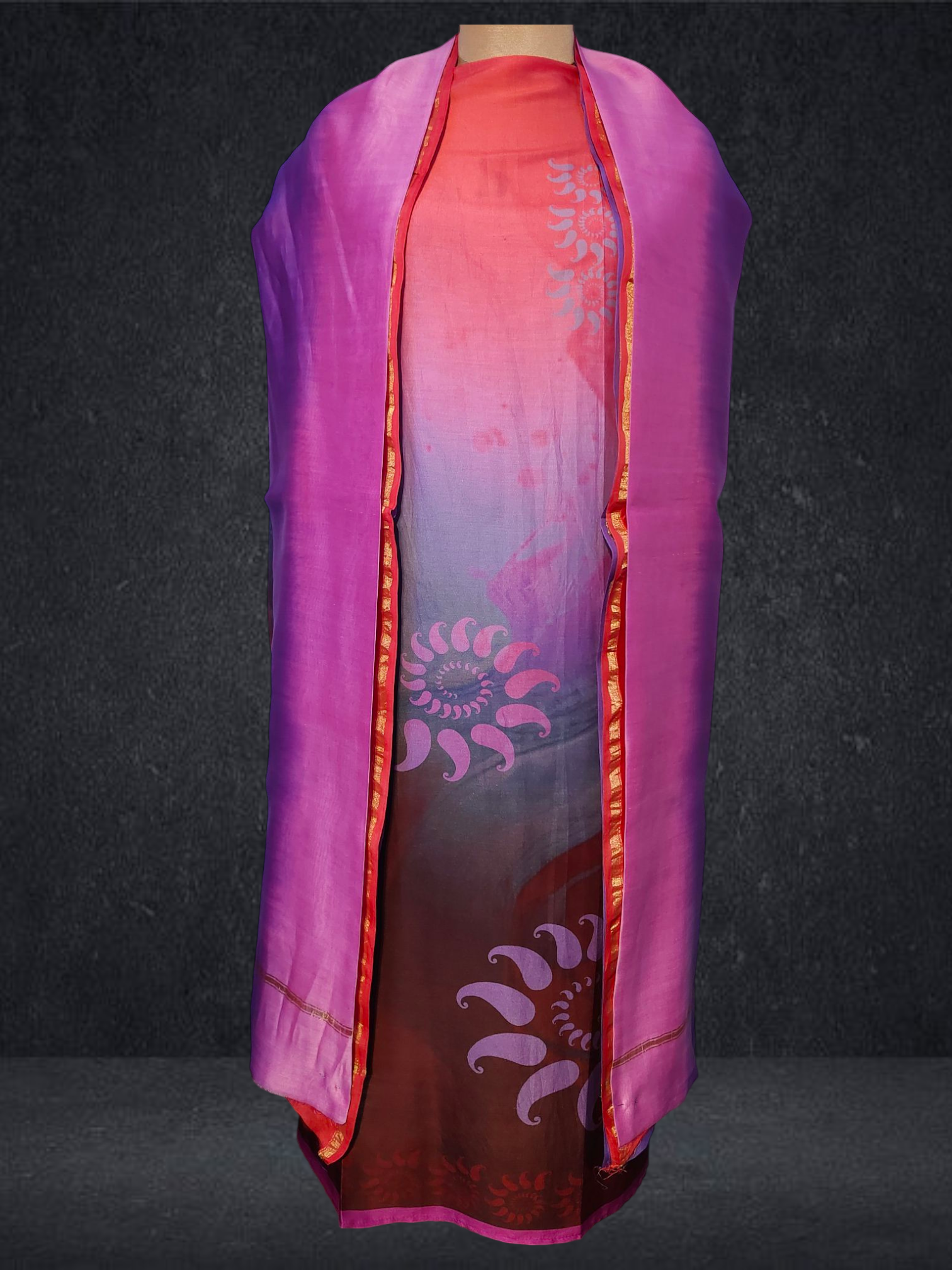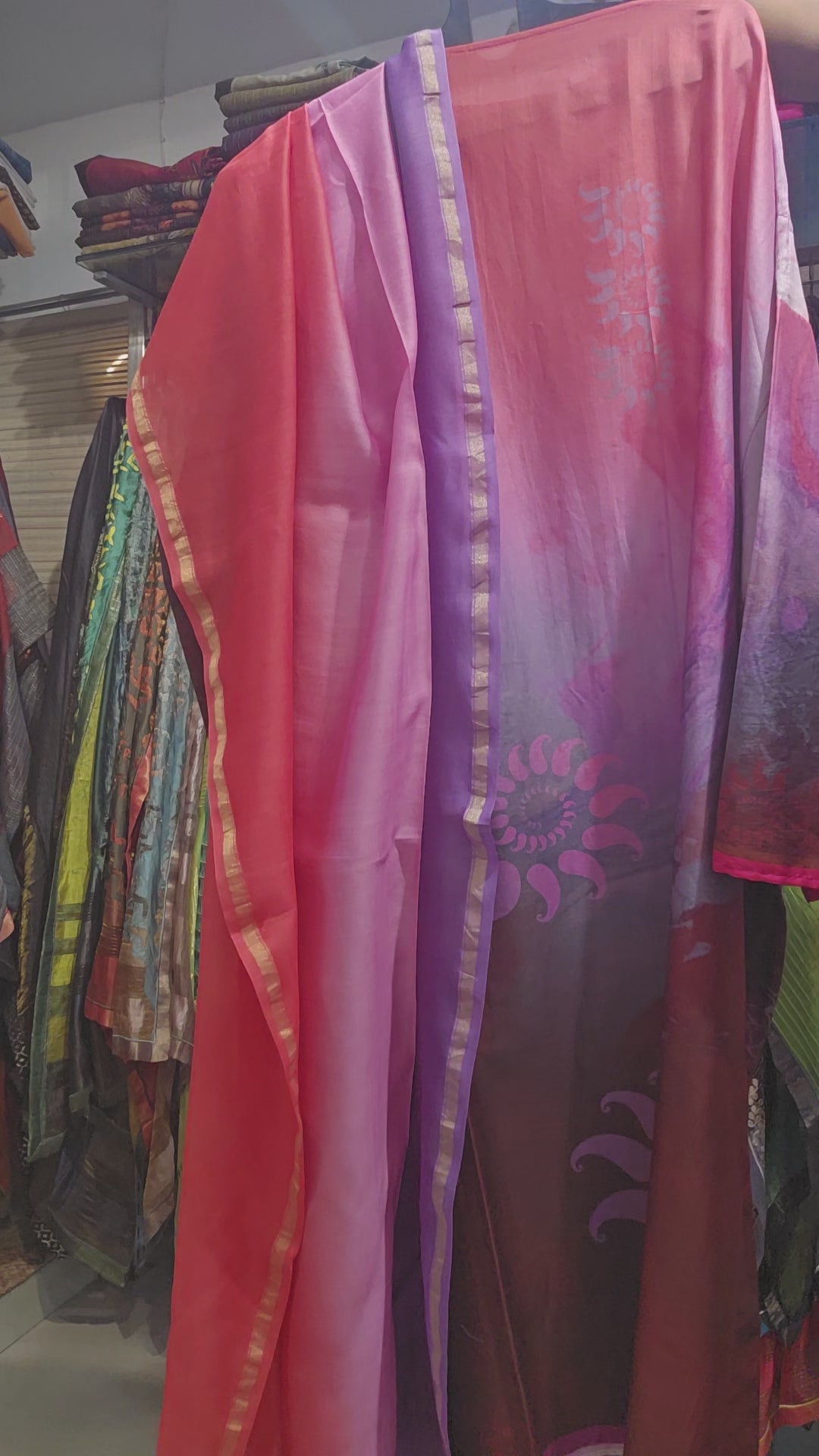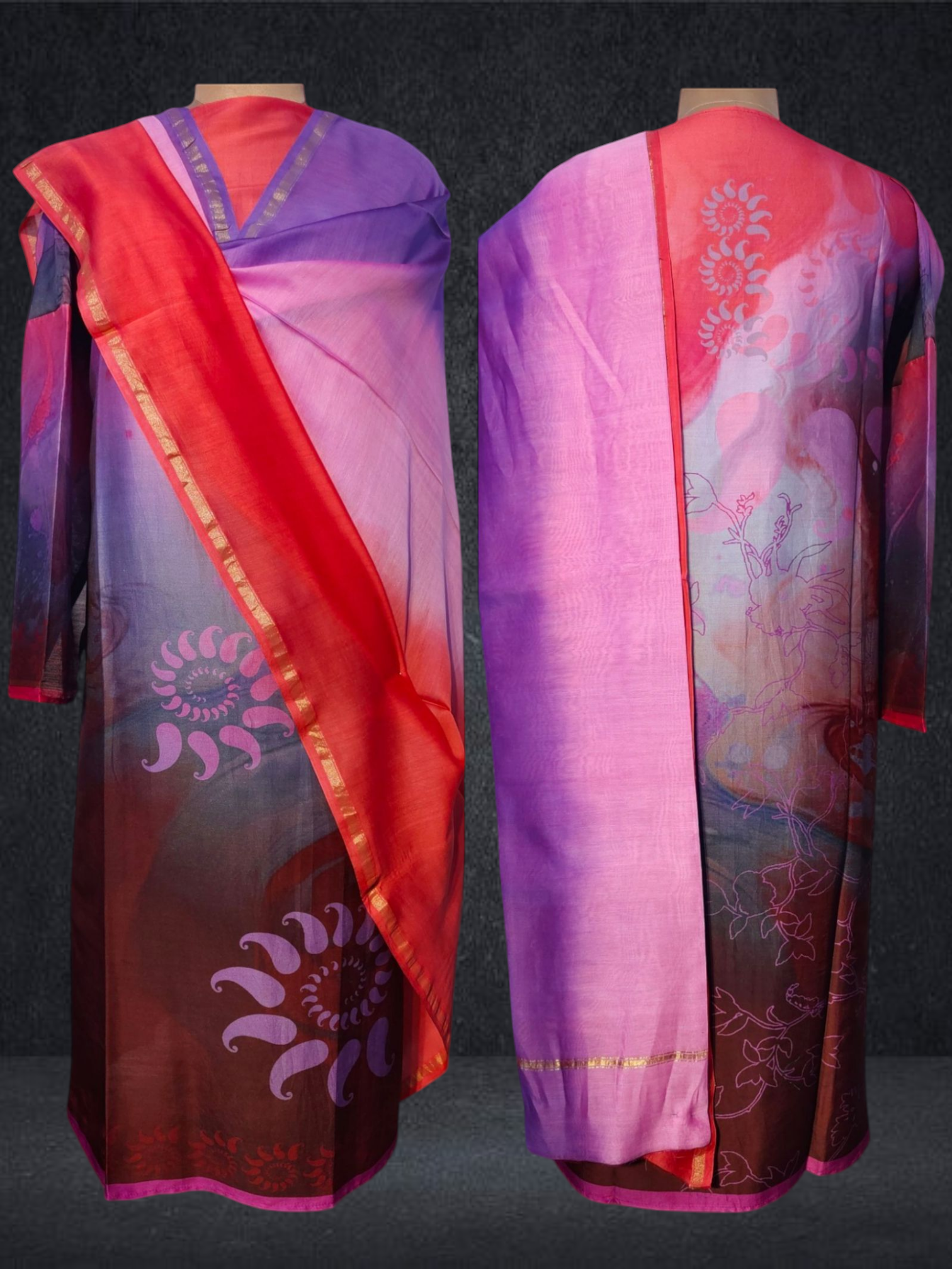 This 3 pc suitset features an elegant digital printed chanderi suitset designed in unique abstract floral theme.kurta is 48 inch maximum in length but can be shortened as per requirement as there is no neckline .The single side ghera is 34 inch so sizes upto 5XL are possible to get tailored in this material.
