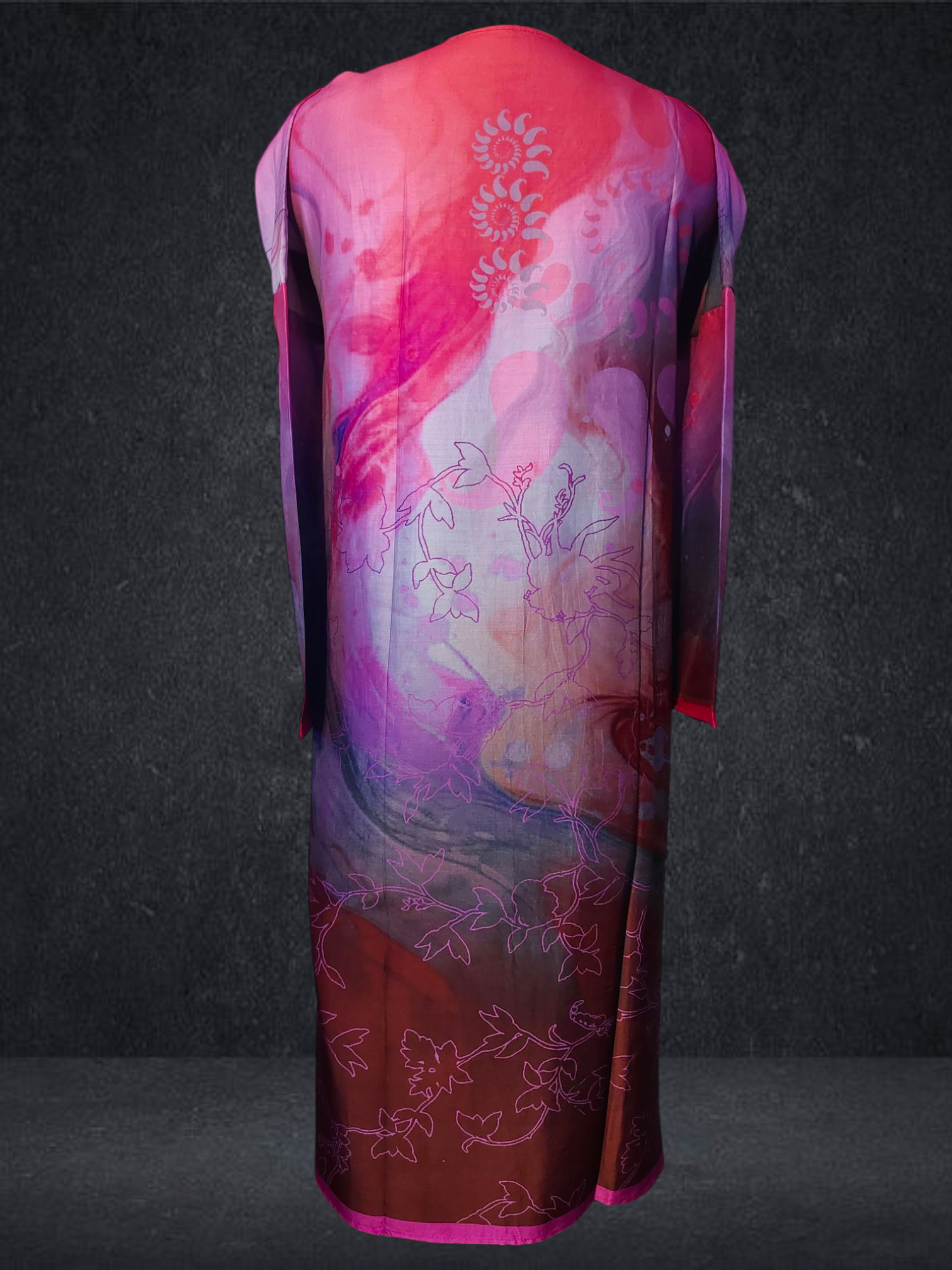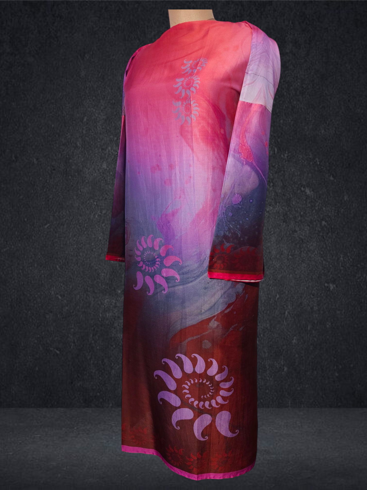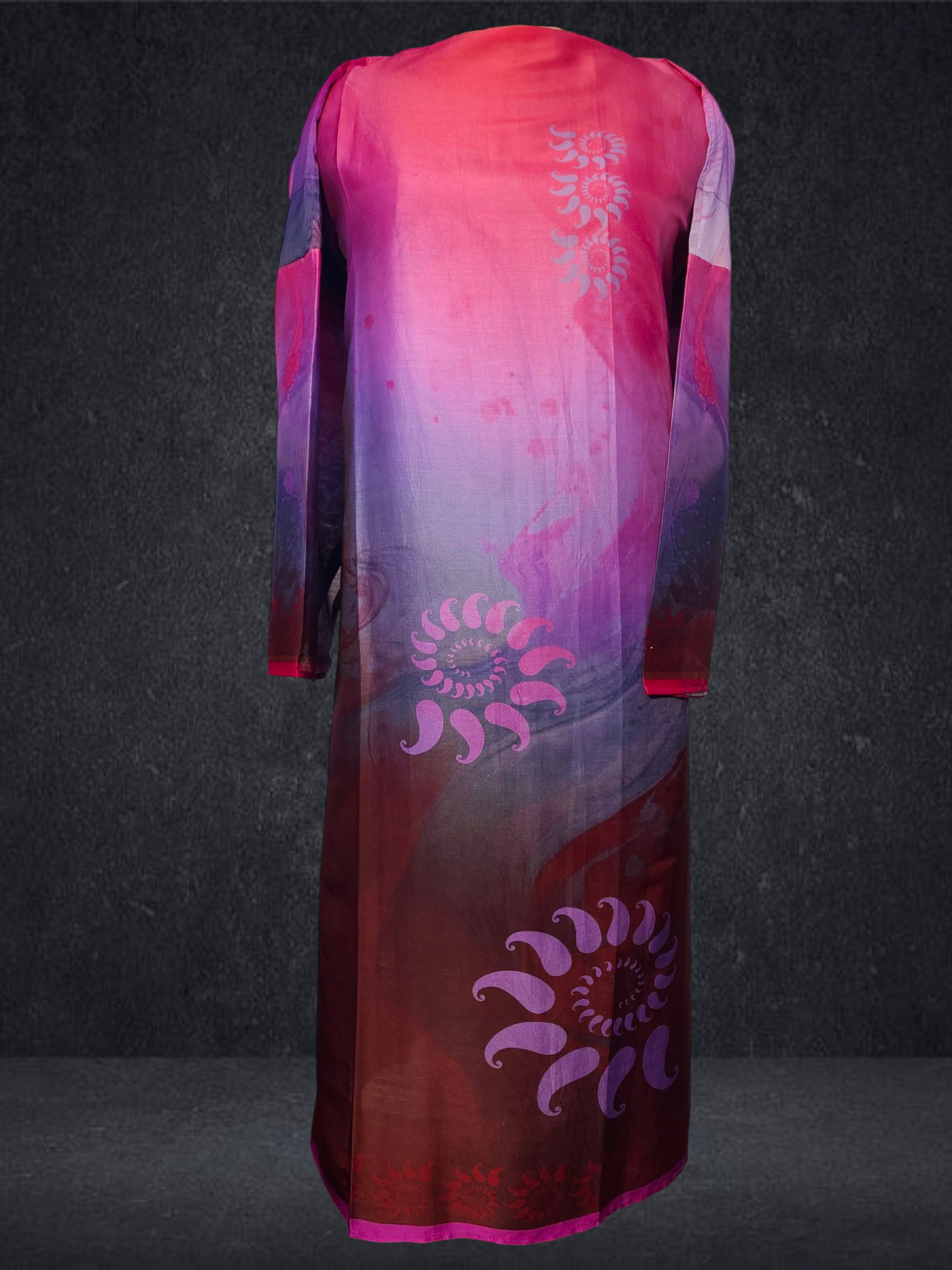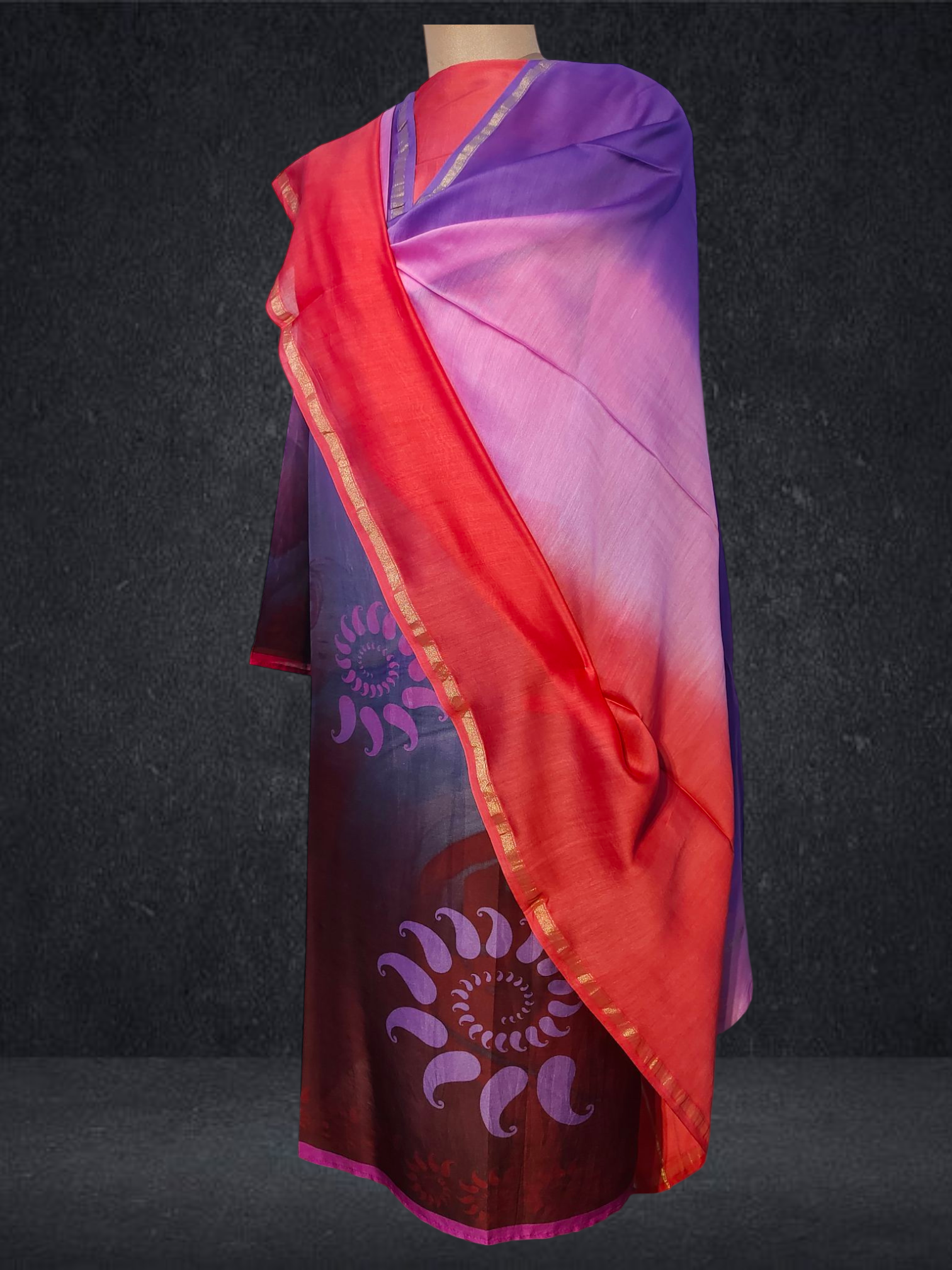 This 3 pc suitset features an elegant digital printed chanderi suitset designed in unique abstract floral theme.kurta is 48 inch maximum in length but can be shortened as per requirement as there is no neckline .The single side ghera is 34 inch so sizes upto 5XL are possible to get tailored in this material.