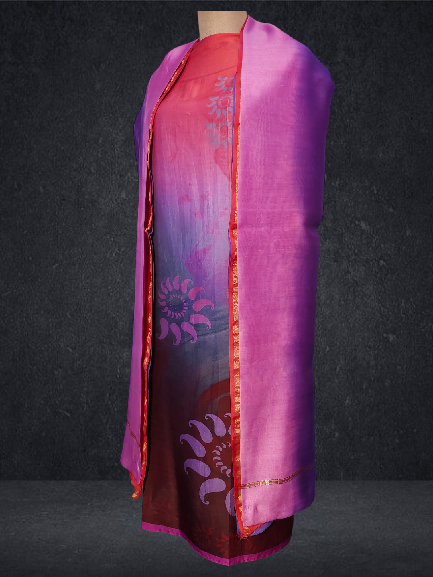 It is paired with a shaded Chanderi silk dupatta. The dupatta measures 2.5 meters in length and 38 inches in width.the ensemble is provided with a matching cotton satin bottom material for 2.5 mts.Kurta will need lining for tailoring