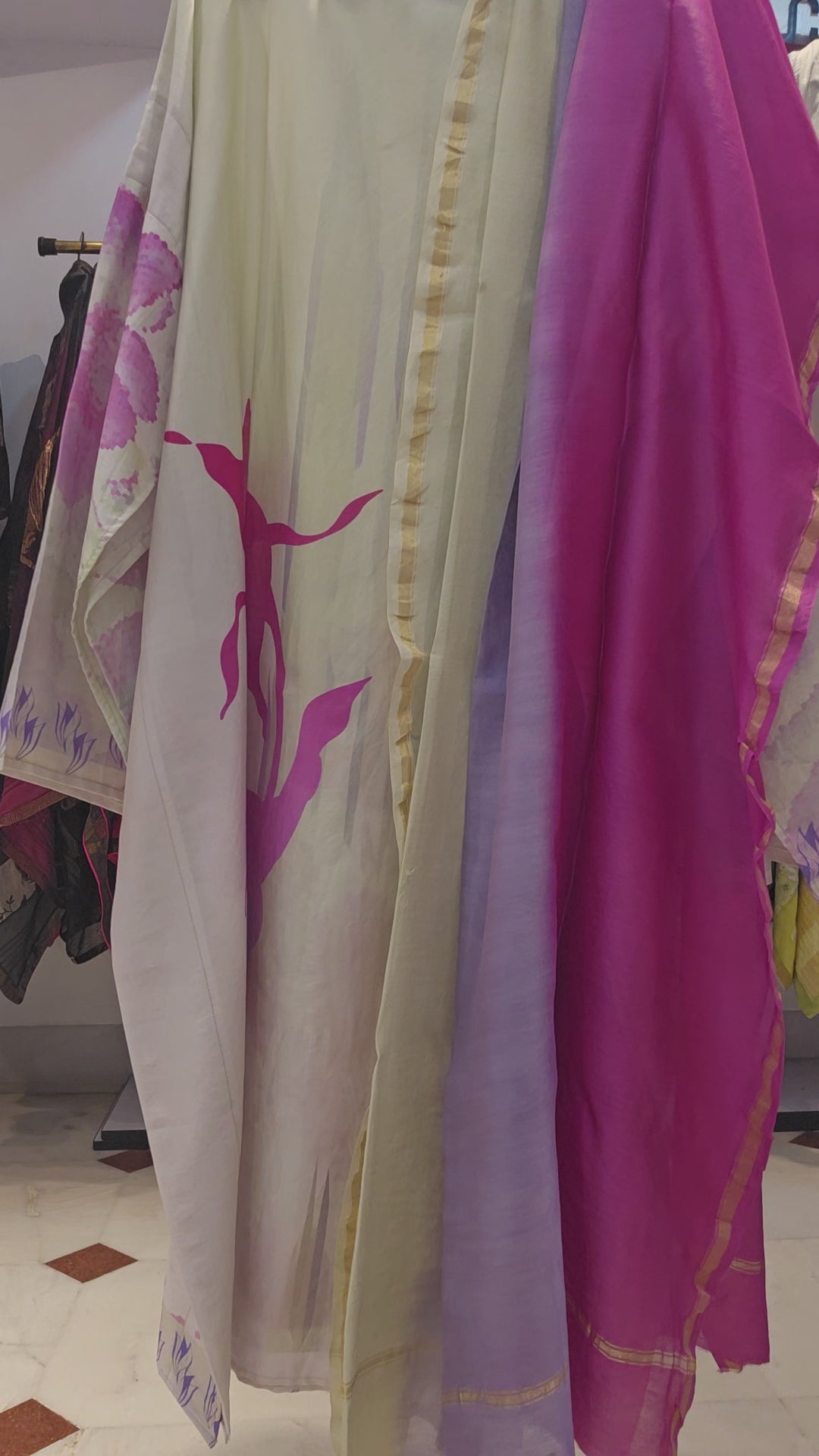 It is paired with a shaded Chanderi dupatta. The dupatta measures 2.5 meters in length and 38 inches in width.the ensemble is provided with a matching cotton satin bottom material for 2.5 mts.Kurta will need lining for tailoring