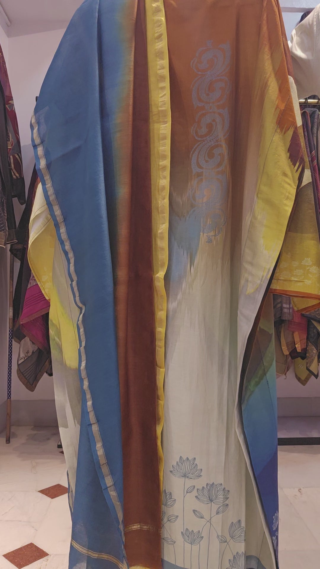 It is paired with a shaded Chanderi dupatta. The dupatta measures 2.5 meters in length and 38 inches in width.the ensemble is provided with a matching cotton satin bottom material for 2.5 mts.Kurta will need lining for tailoring