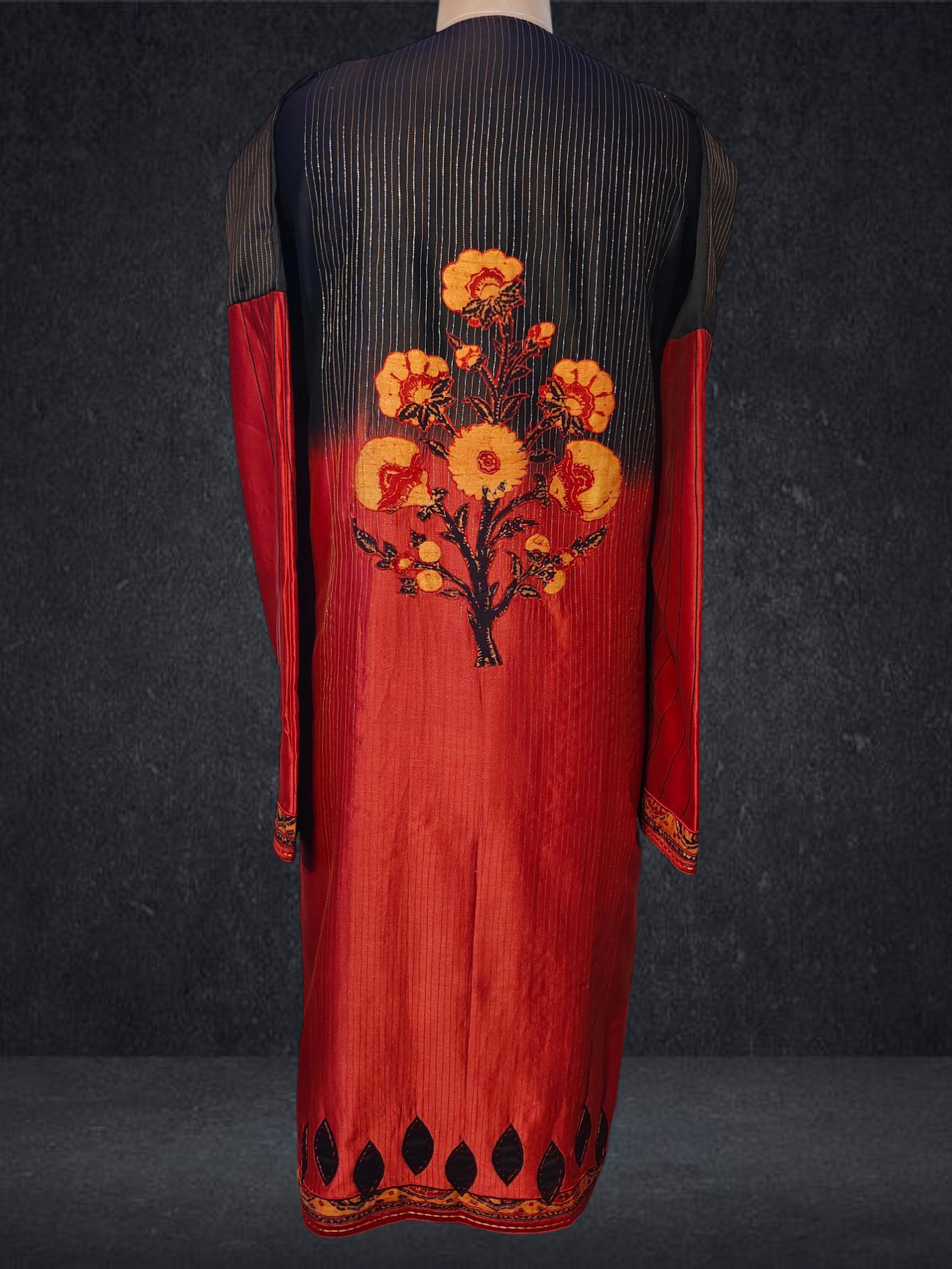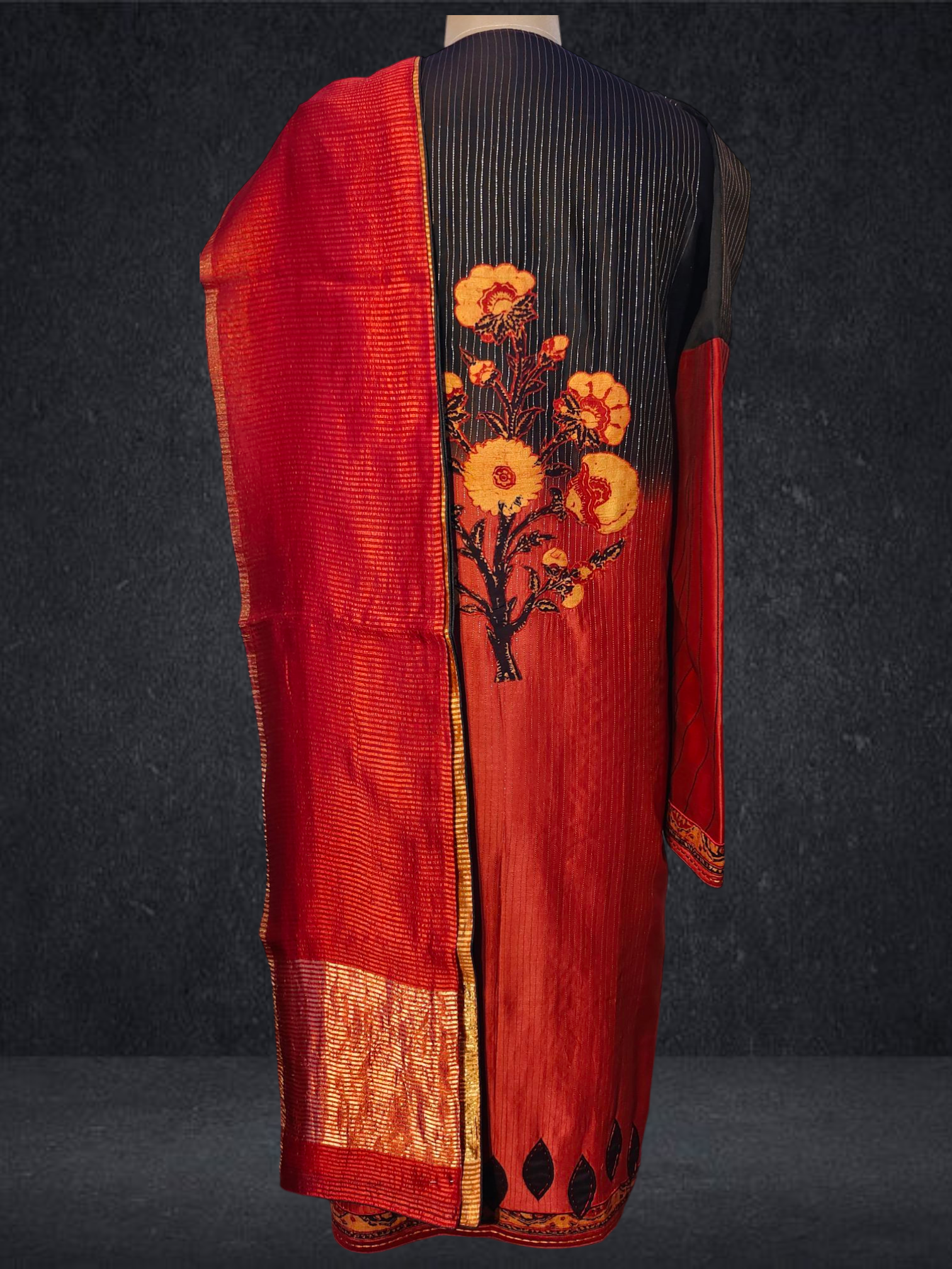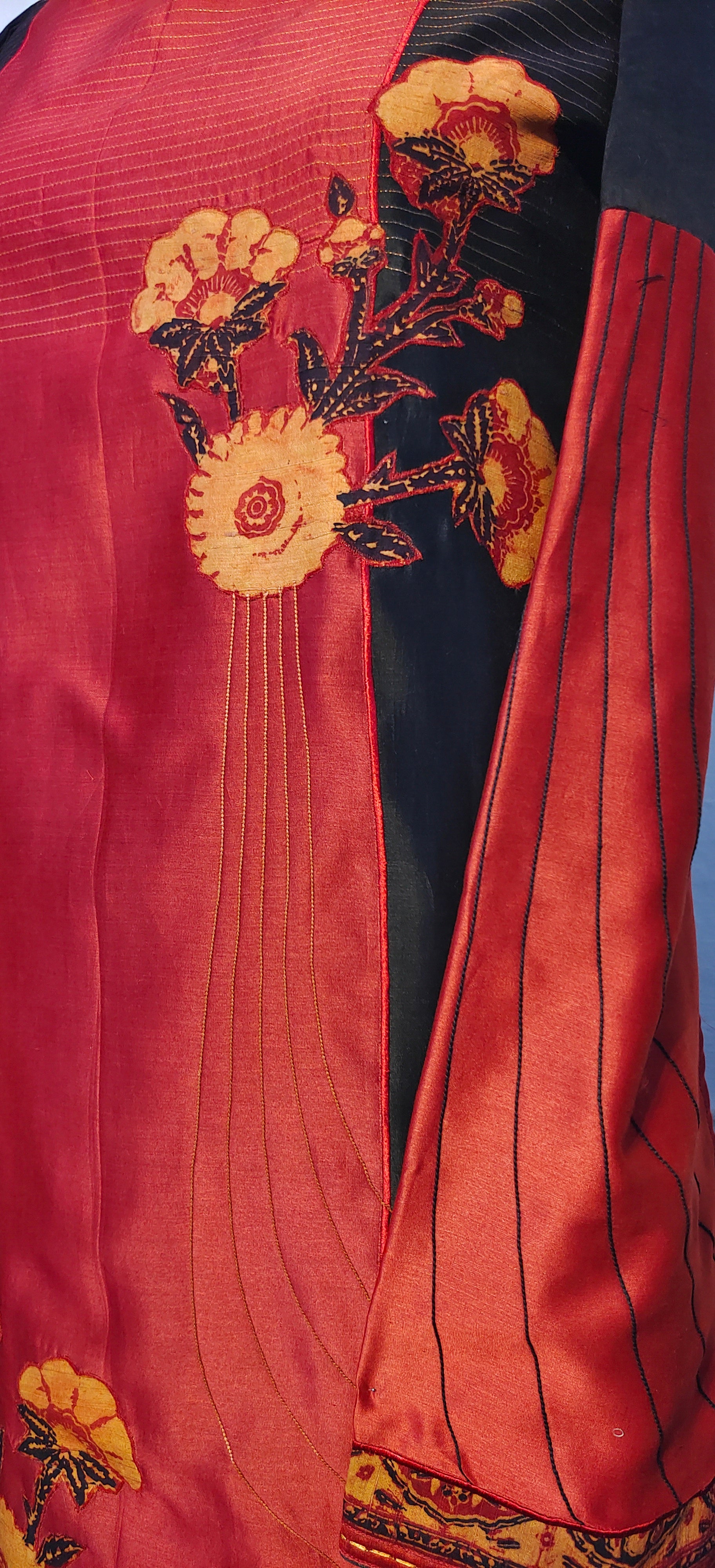 This 3 pc suitset features an elegant rust red and black combo with pure silk ajrakh floral appliques in the front and back panels accentuated with resham stitchlines, prelined with soft cotton for added comfort. Measuring 48 inches in length with a single side ghera of 32 inches, this kurta seamlessly combines contemporary aesthetics with timeless tradition, making it a versatile choice for any occasion.