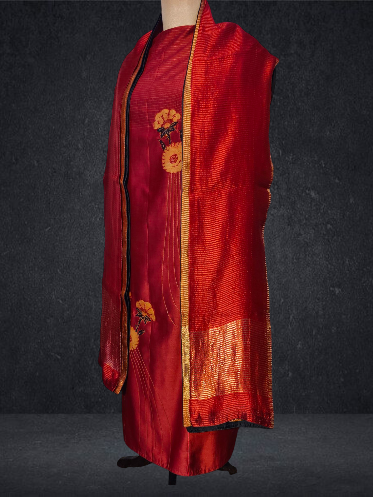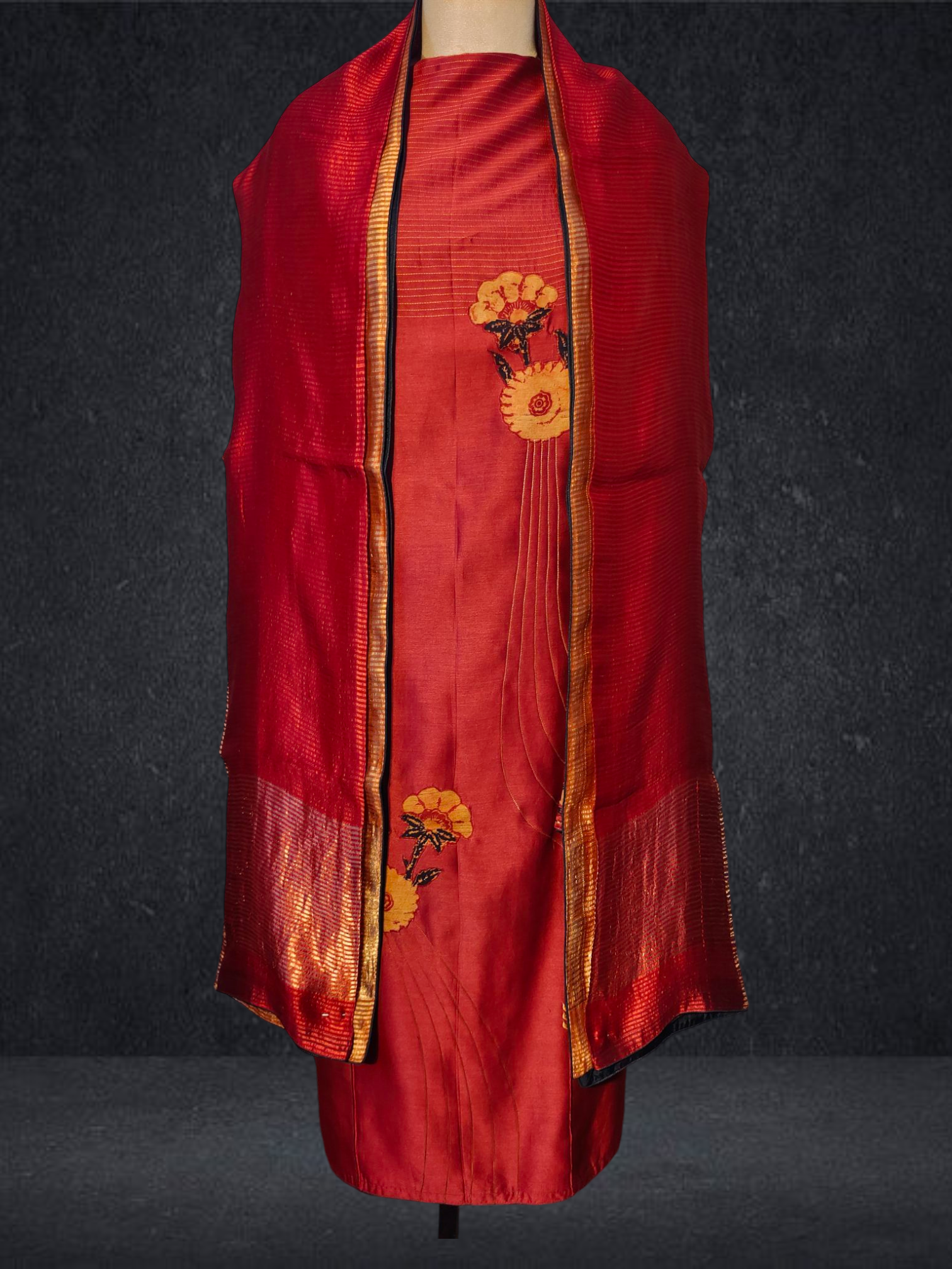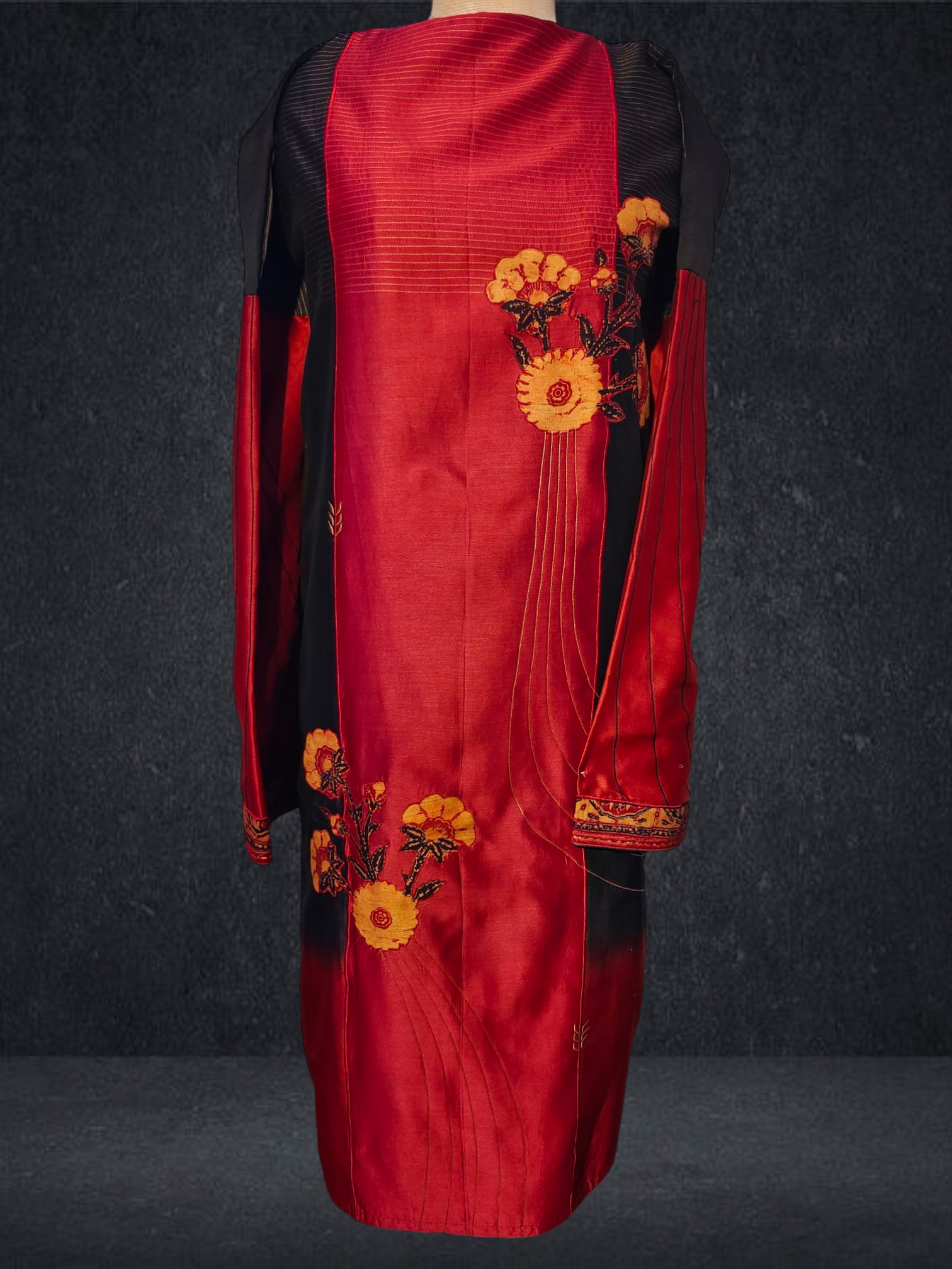 This 3 pc suitset features an elegant rust red and black combo with pure silk ajrakh floral appliques in the front and back panels accentuated with resham stitchlines, prelined with soft cotton for added comfort. Measuring 48 inches in length with a single side ghera of 32 inches, this kurta seamlessly combines contemporary aesthetics with timeless tradition, making it a versatile choice for any occasion.