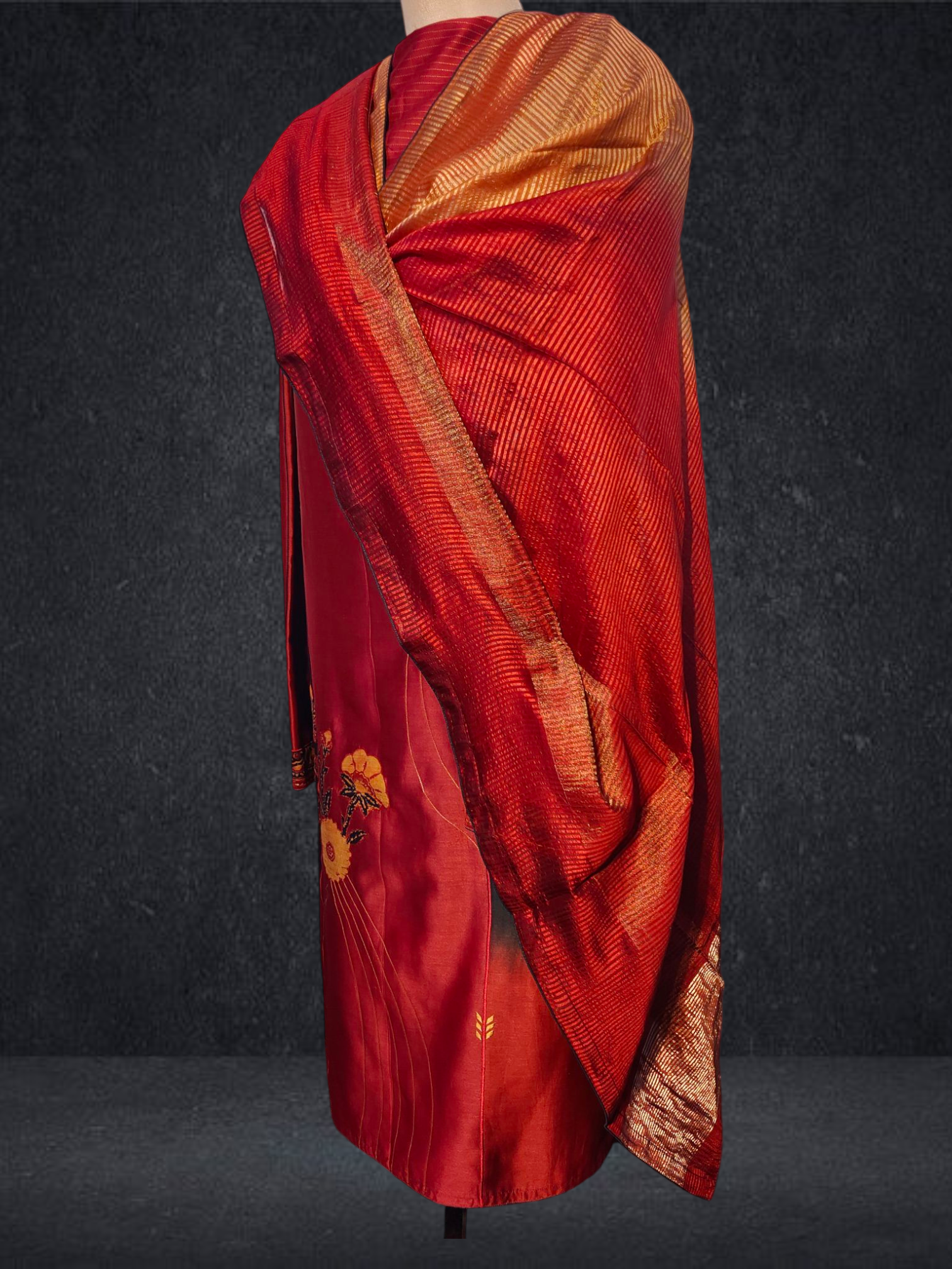 It is paired with a shaded silk stripe dupatta with gold zari woven pallus to coordinate with the kurta for an exclusive rustic formal look. The dupatta measures 2.5 meters in length and 38 inches in width.The ensemble is provided with a matching cotton satin bottom material for 2.5 mts