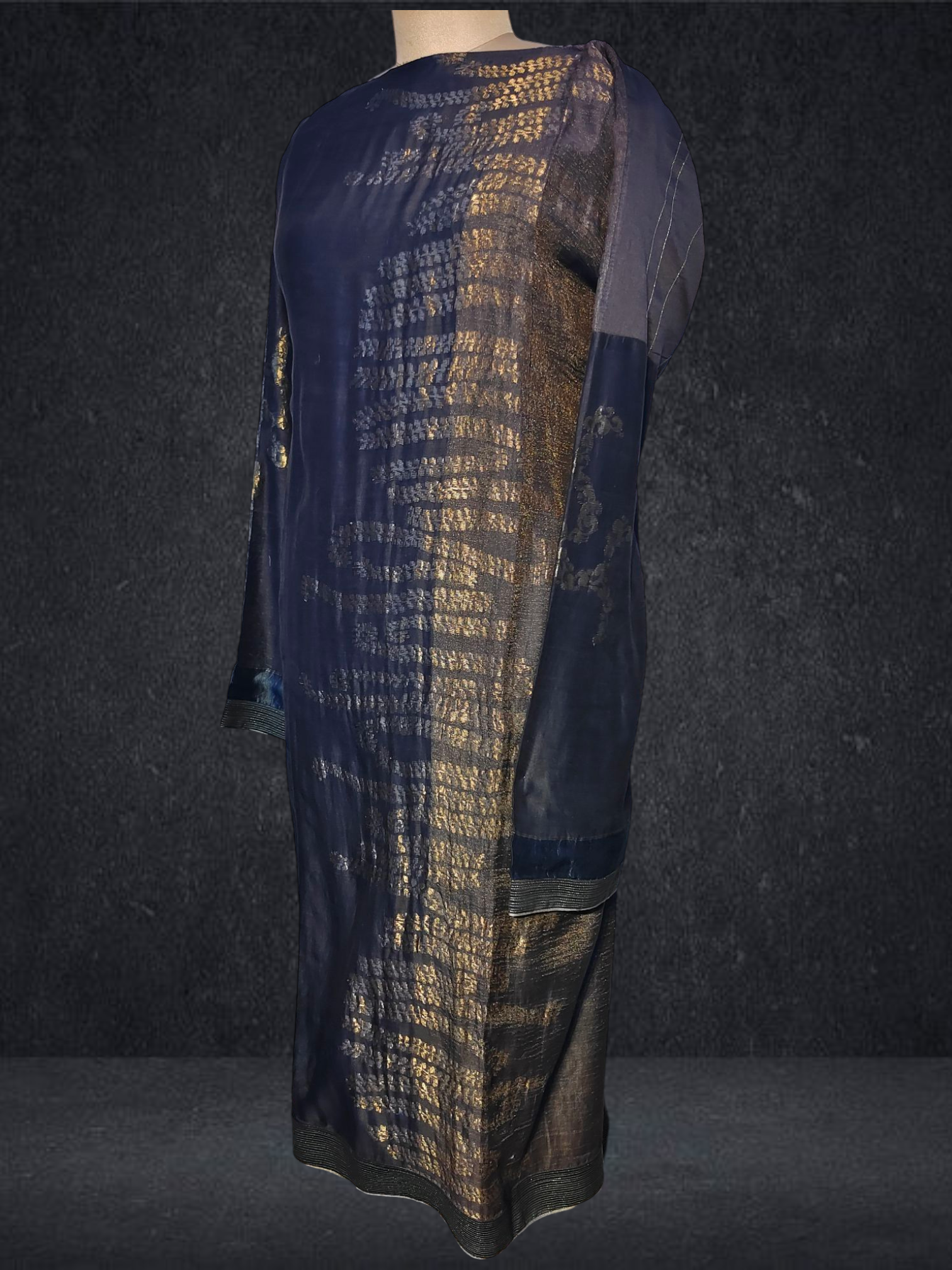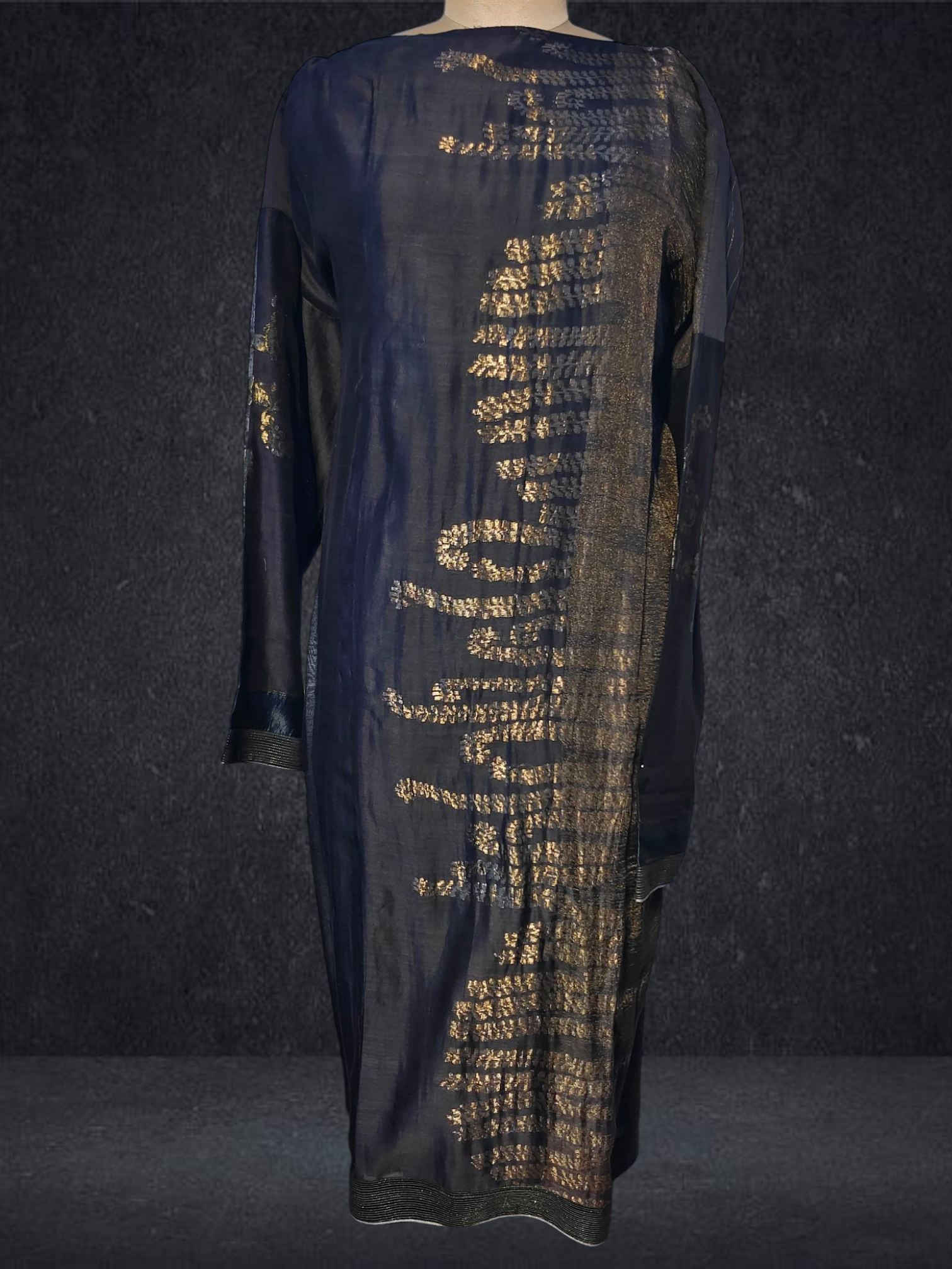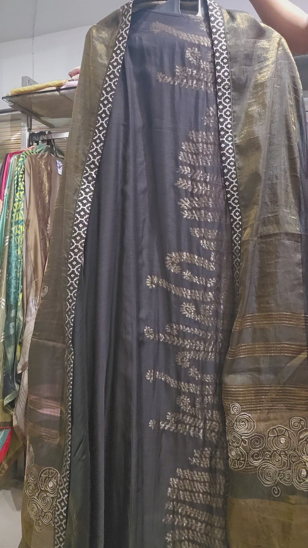 This 3 pc suitset features an elegant handloom appliqued and embroidered woven chanderi suitset designed in unique abstract geometrical theme.kurta is 48 inch maximum in length but can be shortened as per requirement as there is no neckline .The single side ghera is 34 inch so sizes upto 5XL are possible to get tailored in this material.
