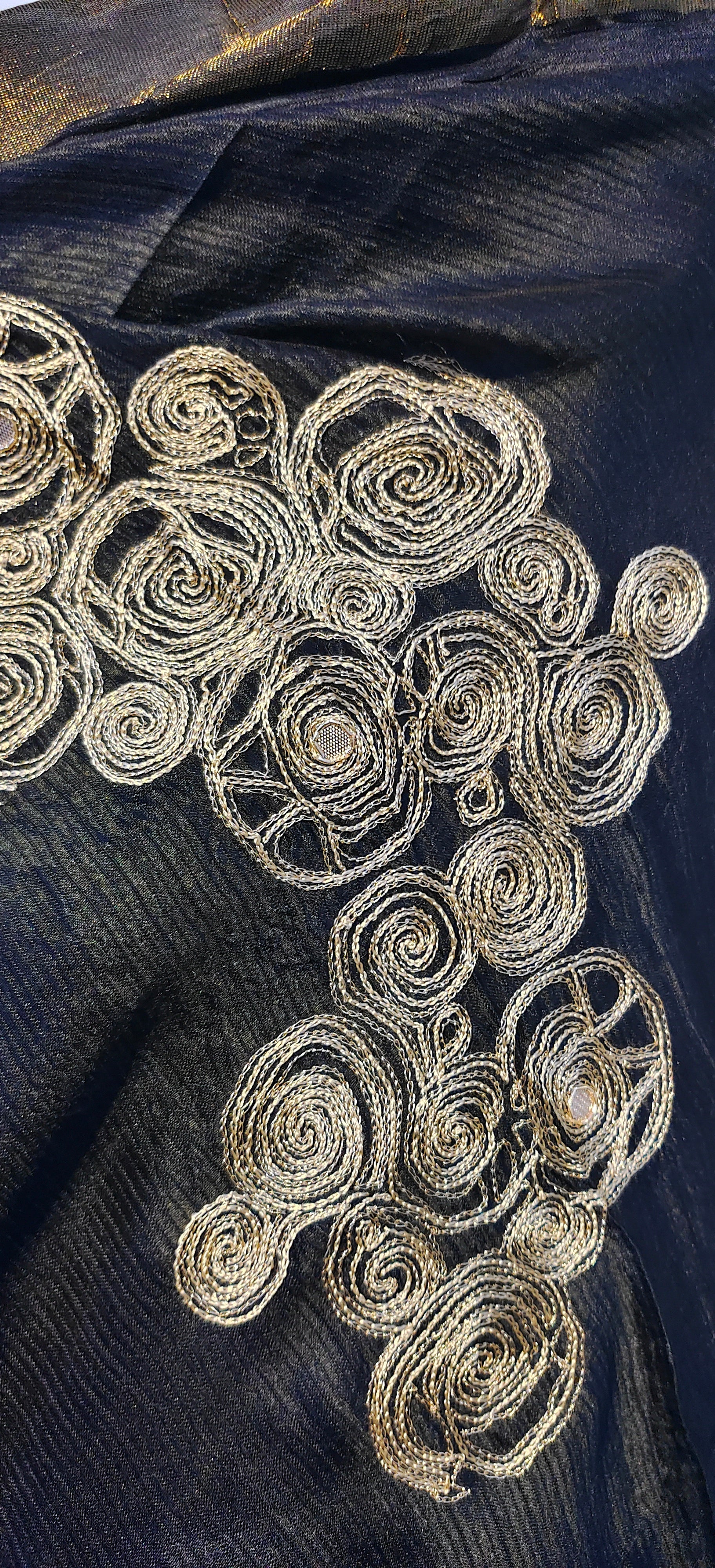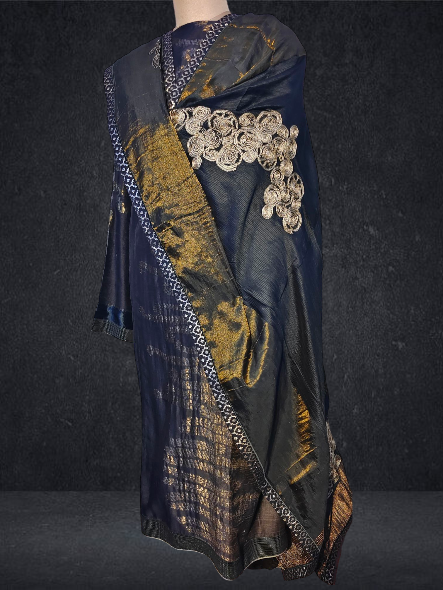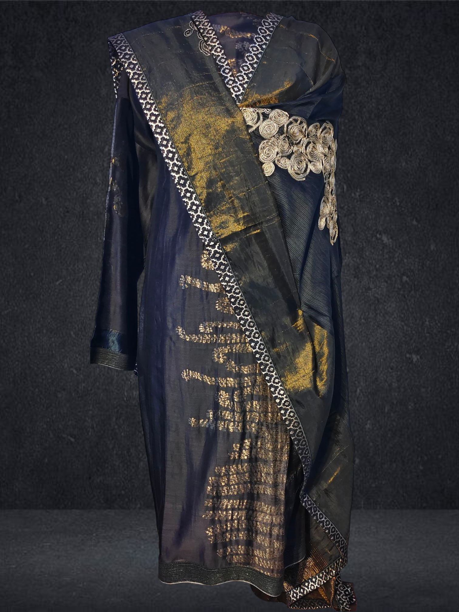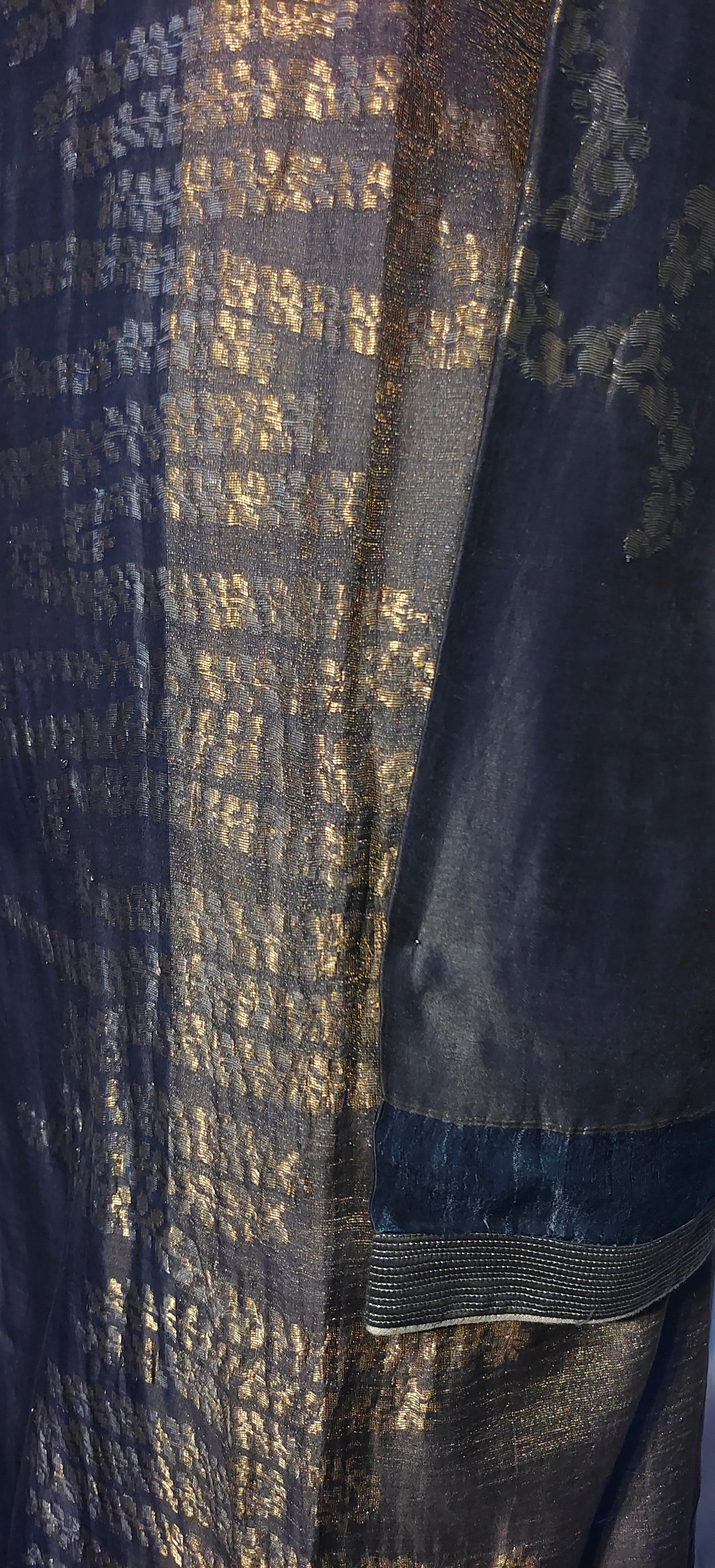 This 3 pc suitset features an elegant handloom appliqued and embroidered woven chanderi suitset designed in unique abstract geometrical theme.kurta is 48 inch maximum in length but can be shortened as per requirement as there is no neckline .The single side ghera is 34 inch so sizes upto 5XL are possible to get tailored in this material.