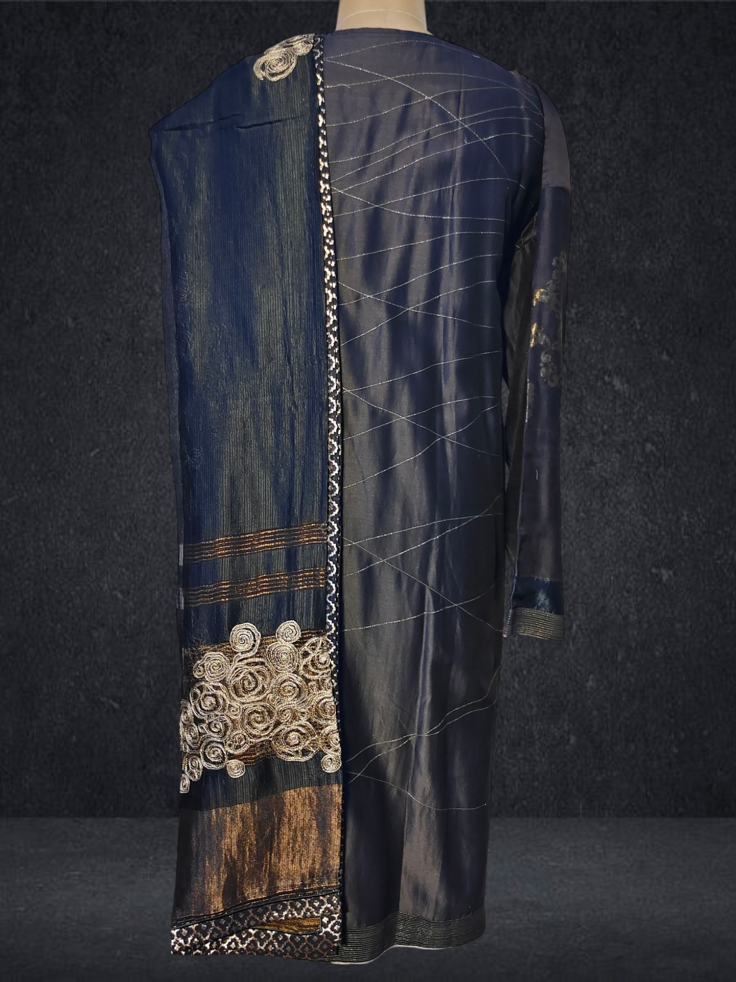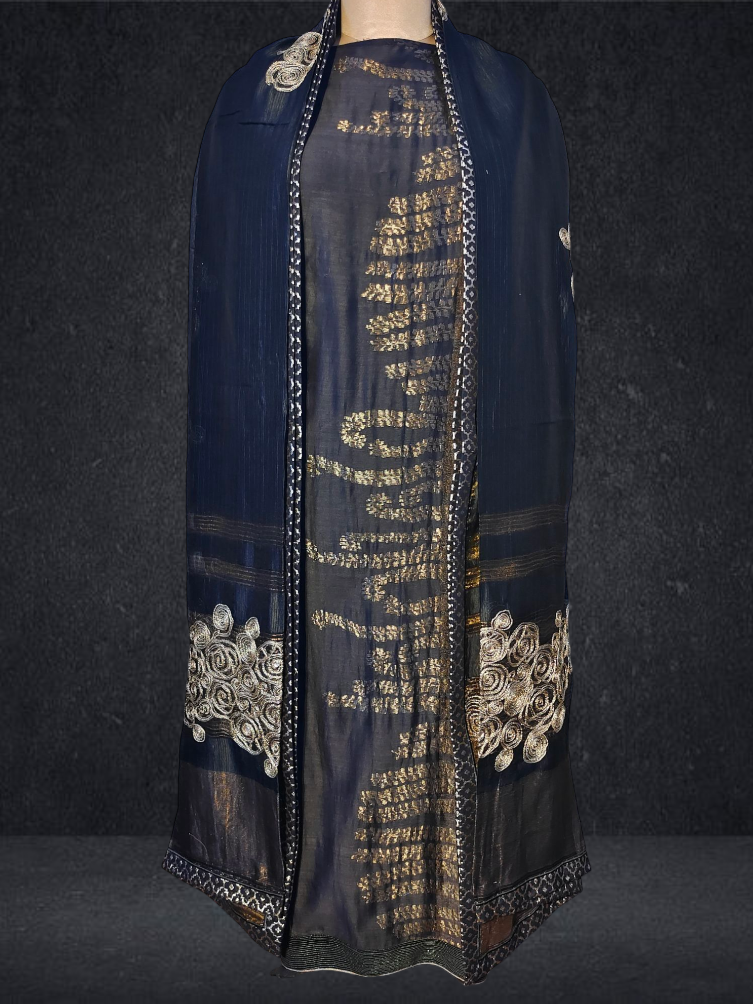 It is paired with rich embroidered and appliqued dupatta. The dupatta measures 2.5 meters in length and 38 inches in width.the ensemble is provided with a matching cotton satin bottom material for 2.5 mts.Kurta will need lining for tailoring